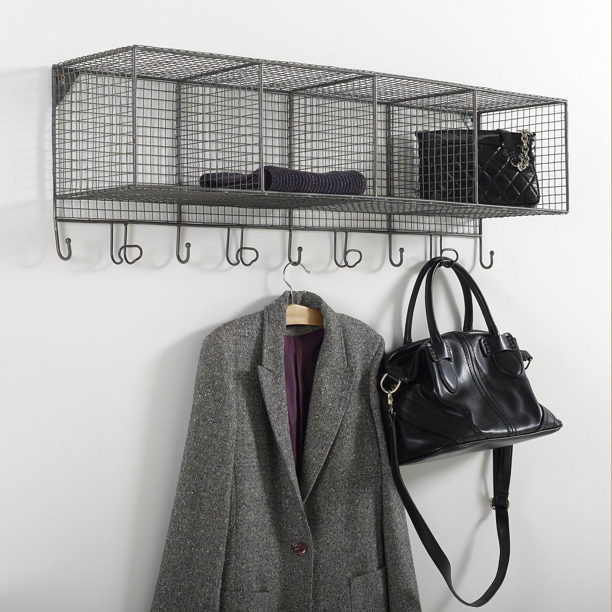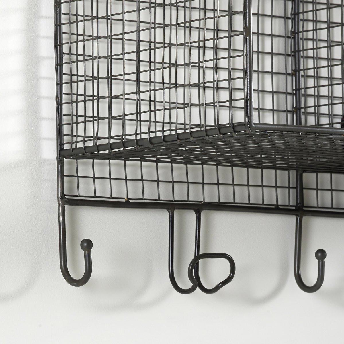 The Areglo wall storage unit. Stylish and practical, this unit has an industrial feel thanks to its metal wire construction, with 9 hooks for hanging clothes or accessories. Product Details • 1 wire shelf. • 4 storage compartments. • 5 metal hooks. • 4 hooks. • Iron wire. Dimensions Overall • Length: 100cm • Height: 28.5cm • Depth: 23cm. Dimensions of 1 box: • L24 x H21 x D22cm Parcel dimensions and weight: • L109 x H33 x D41cm • 6.3kg