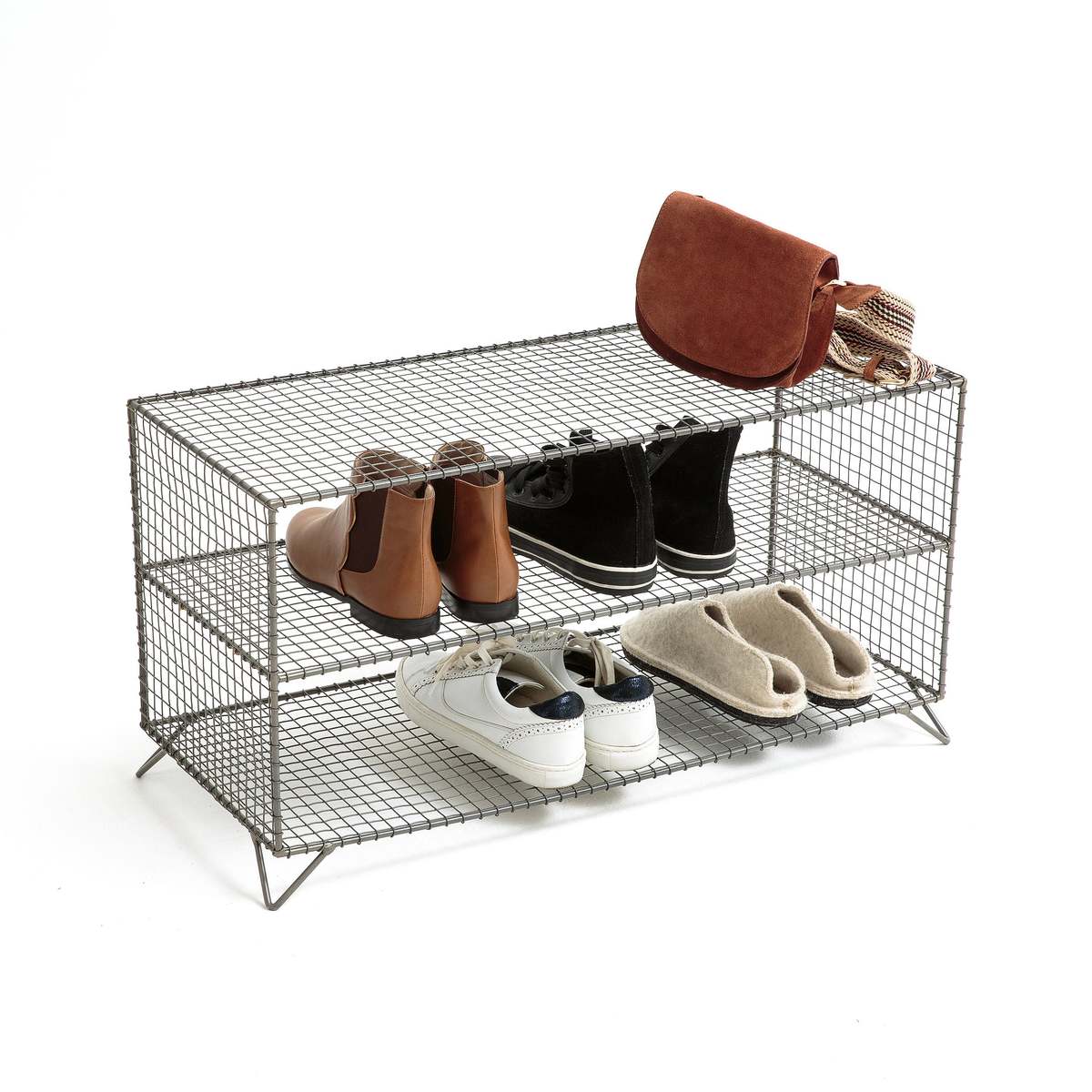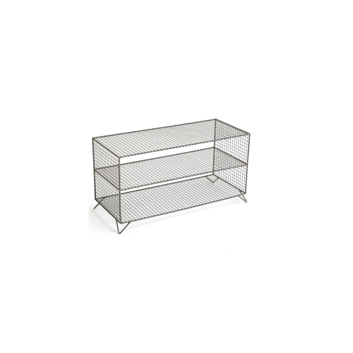 The Areglo shelving unit / shoe rack. In grey mesh metal, it is very trendy. Convenient for storing your books, accessories or shoes!