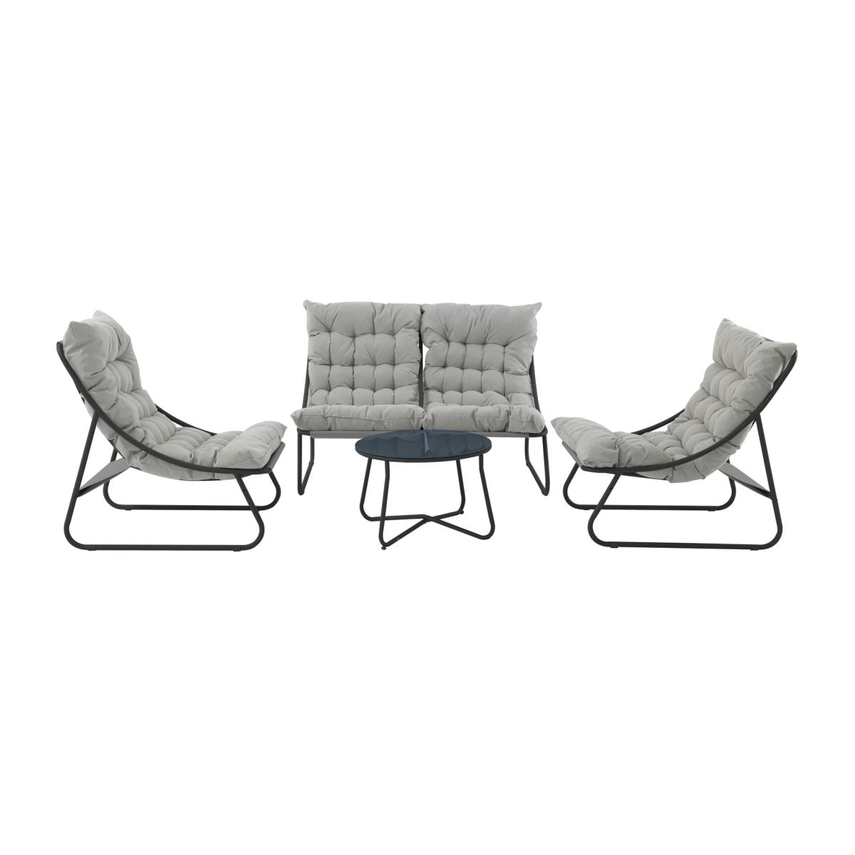 The Aregno Outdoor Seating Set is a contemporary outdoor conversation set designed to bring comfort and style to any garden, patio or balcony space. This elegant set includes a two-seat sofa, two matching chairs, and a round 60cm diameter coffee table, perfect for casual outdoor gatherings. Built with a strong black metal frame and featuring thick light grey cushions, the Aregno set offers both durability and relaxation. Its modern design suits a variety of outdoor settings, while quick, efficient delivery and guided self assembly ensure a hassle-free setup. The Aregno Outdoor Seating Set is the ideal choice for those seeking a practical and stylish outdoor living solution.