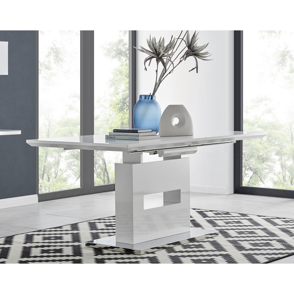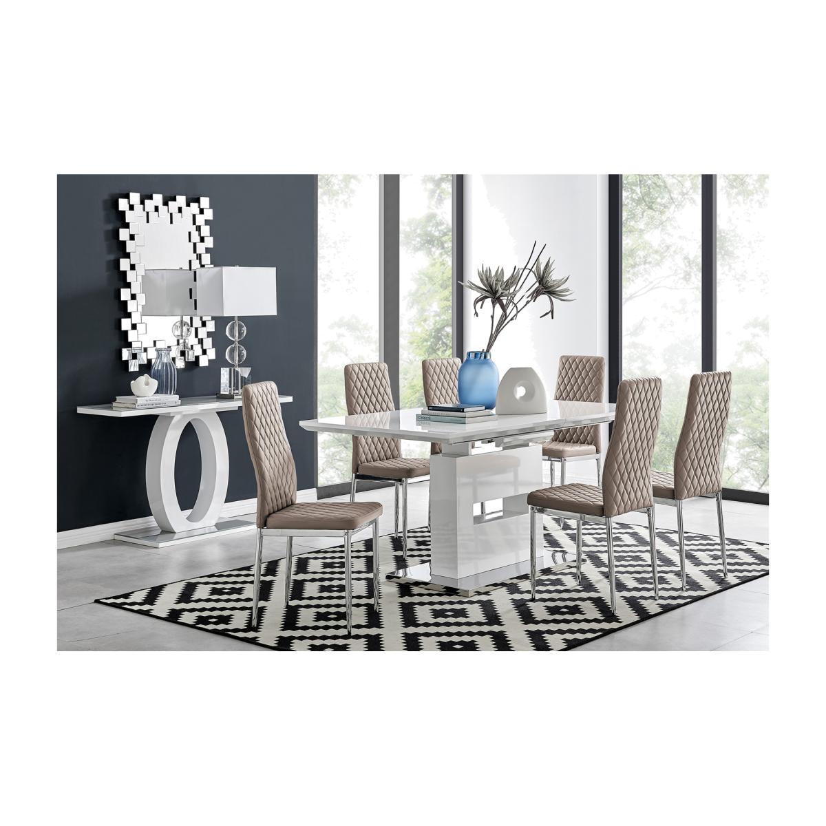 Perfect for large families or those who like to entertain, the Arezzo white gloss extending table can be easily changed from 160cm to 2 metres. Perfect for accommodating extra guests as and when needed. The white high gloss finish provides a clean and modern dining table design which looks stunning and also brightens up your dining room. White high gloss is perfect for reflecting light and opening up the space so even a large extending dining table like this doesn't appear to take up space in the dining room. A high gloss finish also makes this contemporary table easy to clean and maintain. The matching white gloss, rectangular base provides sturdy support for the table and the chrome platform blends seamlessly into its surroundings. Paired alongside our beautiful faux leather diamond quilted Milan dining chairs for a sophisticated contemporary look. The Milan chairs are made from high quality faux leather with chrome legs and are ergonomically designed for maximum comfort and back support. Made for regular use, the protective plastic feet will protect your floor from any damage. Available in elephant grey, cappuccino grey, white, black or mustard to add your own personality and complete this gorgeous dining set.