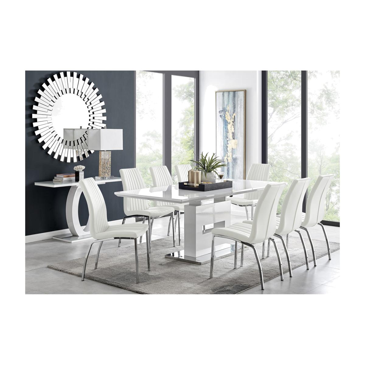 Perfect for large families or those who like to entertain, the Arezzo white gloss extending table can be easily changed from 160cm to 2 metres. Perfect for accommodating extra guests as and when needed. The white high gloss finish provides a clean and modern dining table design which looks stunning and also brightens up your dining room. White high gloss is perfect for reflecting light and opening up the space so even a large extending dining table like this doesn't appear to take up space in the dining room. A high gloss finish also makes this contemporary table easy to clean and maintain. The matching white gloss, rectangular base provides sturdy support for the table and the chrome platform blends seamlessly into its surroundings. Coupled with our Isco chrome and faux leather dining chairs clean lines combined with comfort and texture to make them a perfect match to complete this dining set. The soft touch faux leather seat pads are interspaced with vertical stitching and are designed for comfort with the added bonus of looking great. Value for money with style combine to make an unbeatable package!