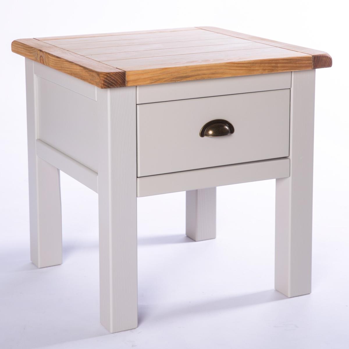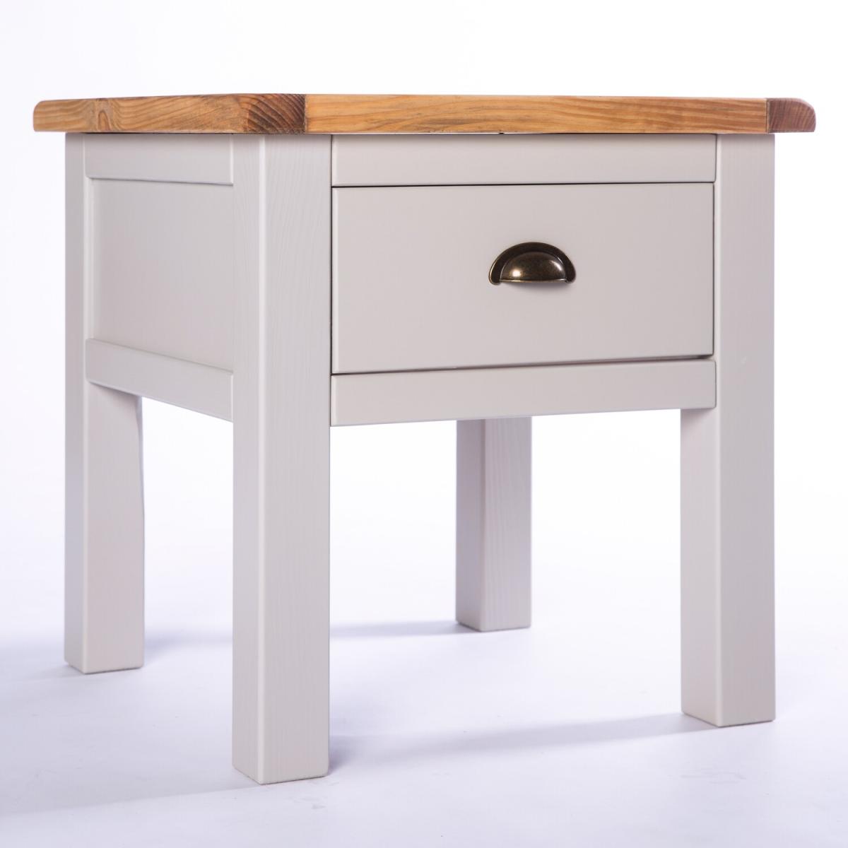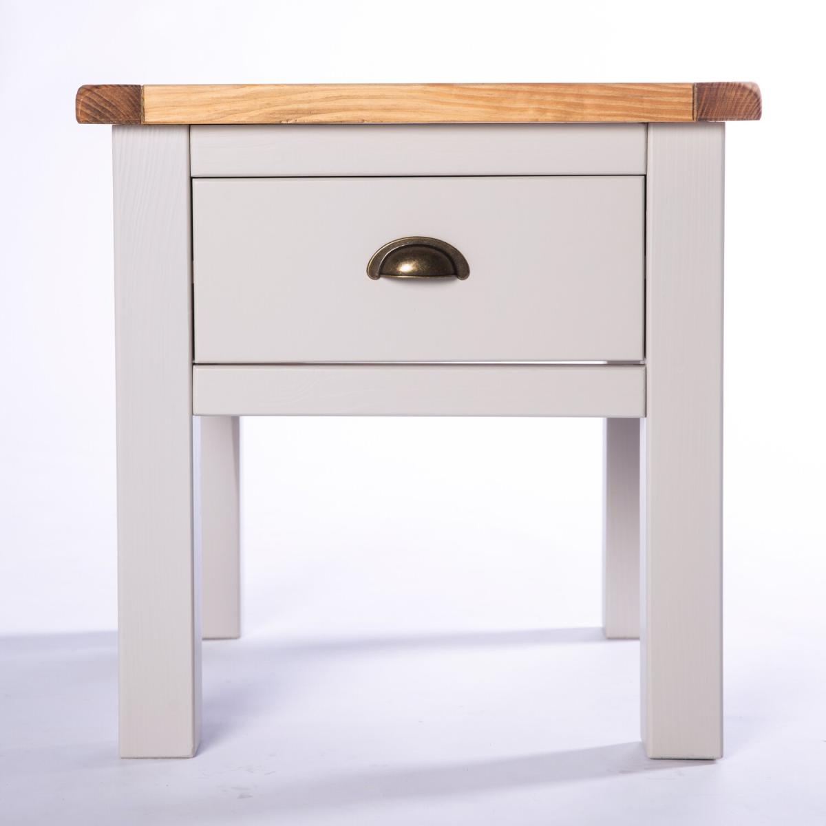 Our Argenta collection has a simple but pleasing design and is produced by our skilled craftsmen to the highest standards using responsibly sourced wood and veneers. All tops are made using a combination of solid pine wood and veneers and carefully hand waxed, giving them a great look. The body is finished with high-quality eco-friendly water base paint in a light grey colour. This 1 drawer lamp table is perfect as a centrepiece for your room. The top has plenty of space for TV remotes, magazines, your tablet or your favourite scented candle. It is also perfect for drinks and snacks, but don't forget to use a coaster to protect the finish. The drawer allows space for those other items you need close to hand to be stored conveniently but discretely. These attributes combined with a simple construction for easy assembly make it a great value product to be taken home today.
