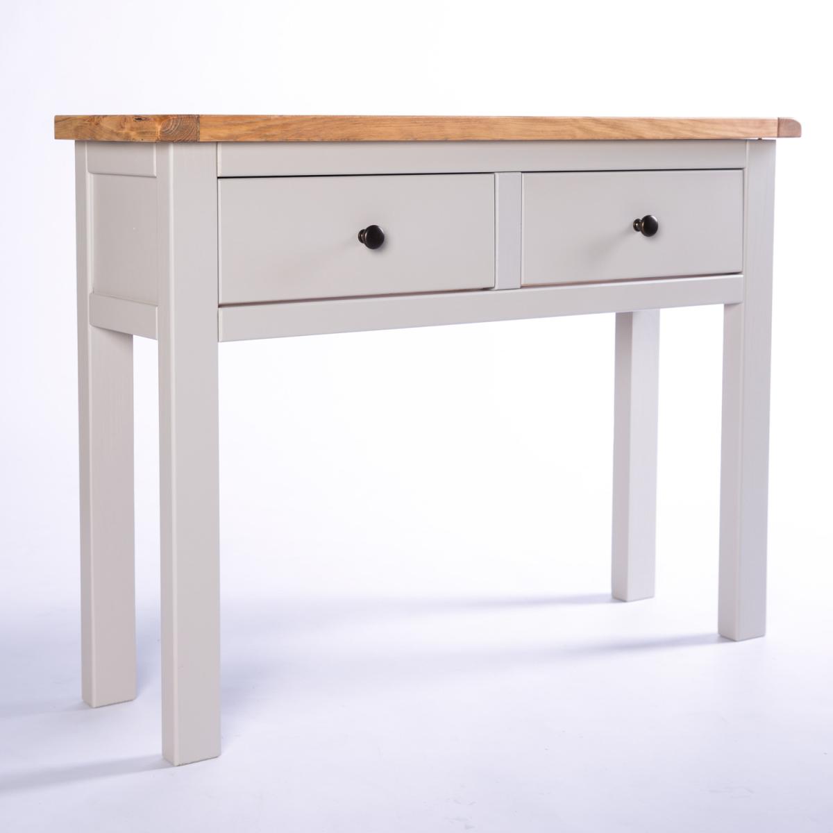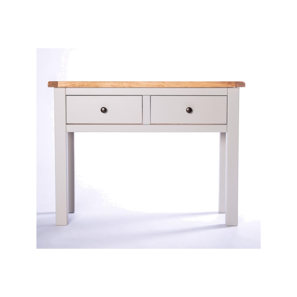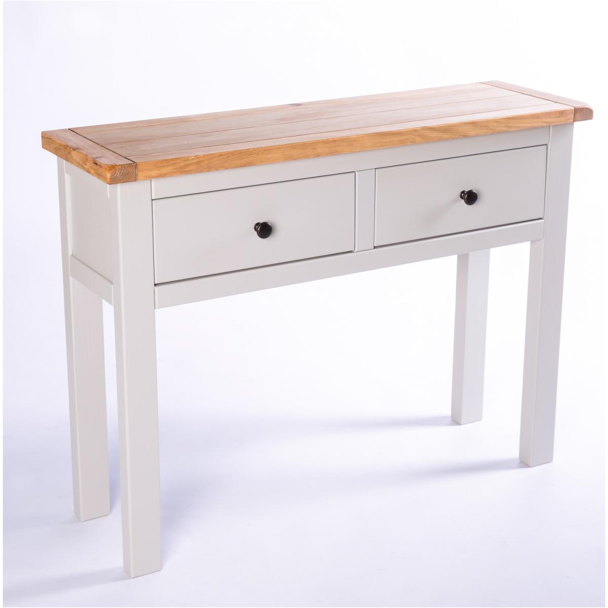 Our Argenta collection has a simple but pleasing design and is produced by our skilled craftsmen to the highest standards using responsibly sourced wood and veneers. All tops are made using a combination of solid pine and pine veneer and are carefully hand-waxed giving them a great look. The body is finished with high-quality eco-friendly water-base paint in a light grey colour. This 2-drawer console table is 30cm deep so perfect to fit in narrow spaces but still offers good storage space on its 2 wide drawers. These attributes combined with a simple construction for easy assembly make it a great value product to be taken home today.