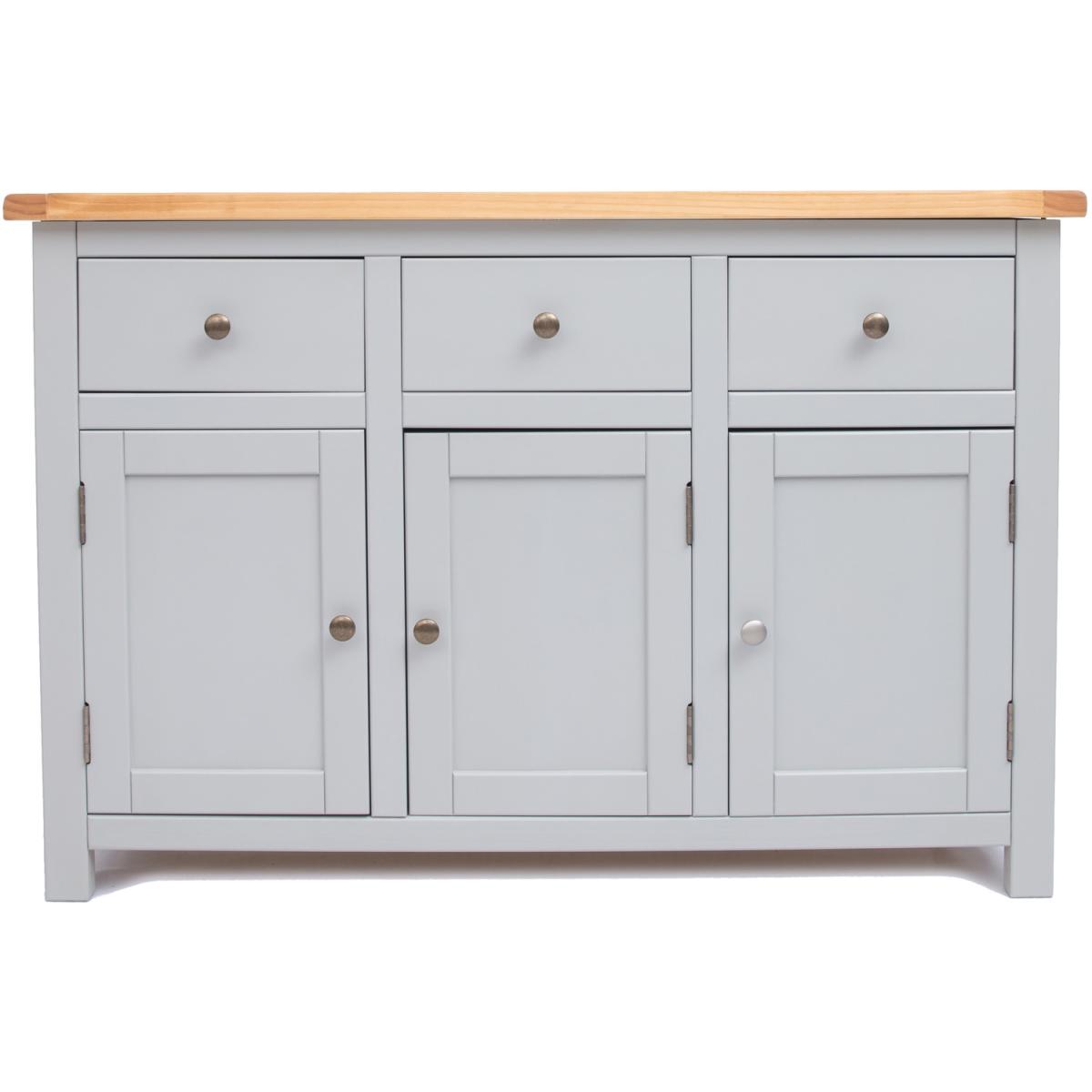 Our Argenta collection has a simple but pleasing design and is produced by our skilled craftsmen to the highest standards using responsibly sourced wood and veneers. All tops are made using a combination of solid pine wood and veneers and are carefully hand waxed giving them a great look. The body is finished with high-quality eco-friendly water-based paint in a light grey colour. This large 3-door 3-drawer sideboard will look at home in your dining room or lounge. The three doors conceal a large cupboard space for storing crockery, bottles or glassware and there is also a shelf to further organise your contents.