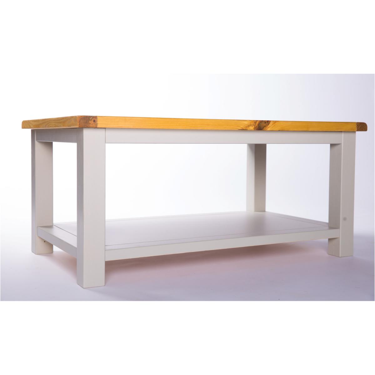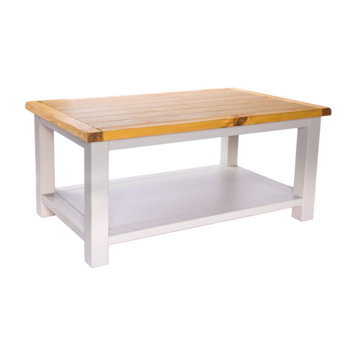 Our Argenta collection has a simple but pleasing design and is produced by our skilled craftsmen to the highest standards using responsibly sourced wood and veneers. All tops are made using a combination of solid pine wood and veneers and are carefully hand waxed giving it a great look. The body is finished with a high quality eco-friendly water base paint in an light grey colour. This coffee table is perfect as a centrepiece for your room. The top has plenty of space for TV remotes, magazines, your tablet or your favourite scented candle. It is also perfect for drinks and snacks, but don't forget to use a coaster to protect the finish. The shelf below allows space for those other items you need close to hand to be stored conveniently, perhaps tissues or your snuggle blanket for cold nights. These attributes combined with a simple construction for easy assembly makes it a great value product to be taken home today.