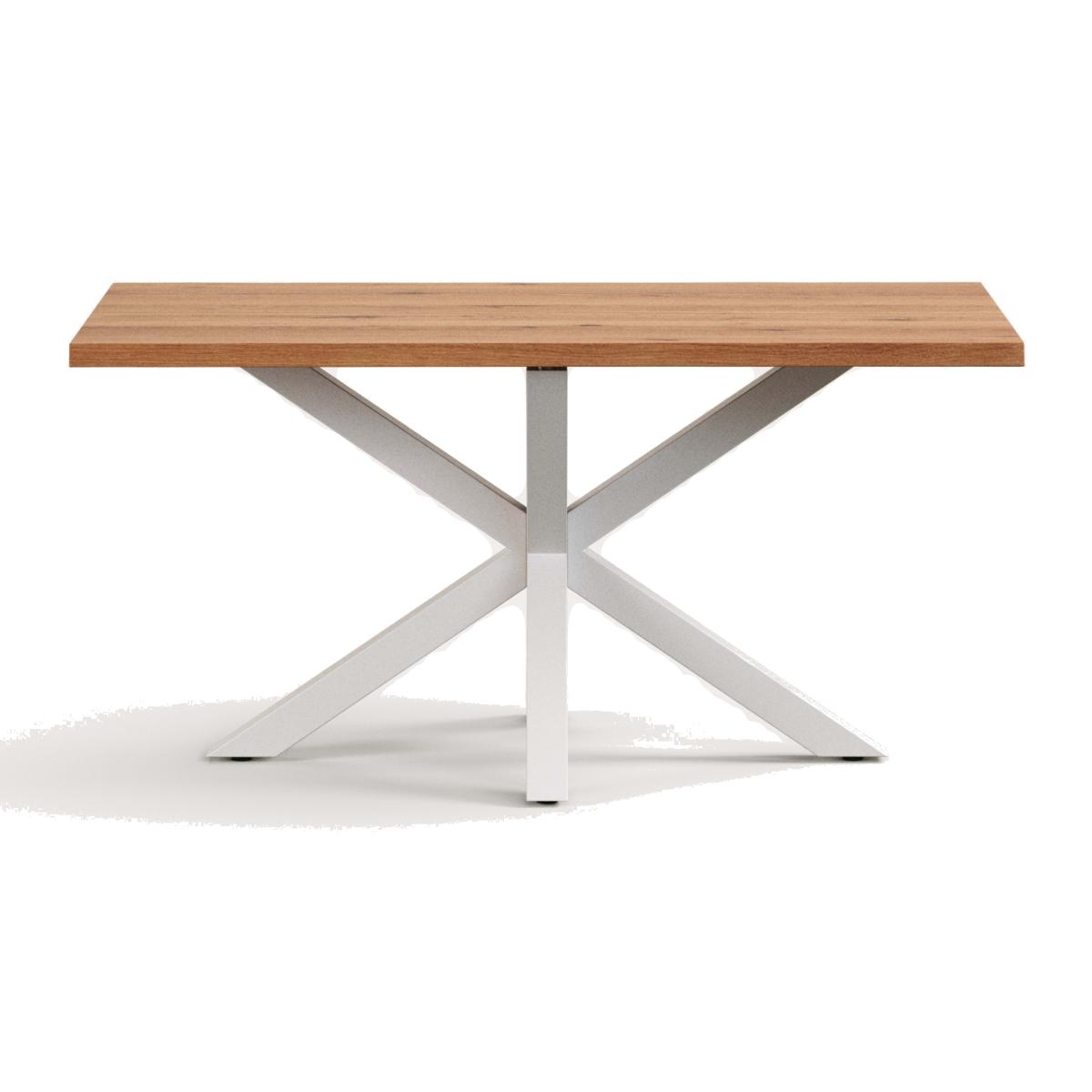 I love this table for its versatile mix of rustic warmth and modern edge. The aged oak veneer gives it a timeless, welcoming feel, making it ideal for both contemporary and traditional interiors. The white steel legs add a fresh,clean look that helps the table sit well in Scandinavian, industrial, or pared-back minimalist schemes. Practical styling tips include pairing it with wooden or fabric dining chairs for a cosy, cohesive vibe, or mixing in metal accents for an industrial touch. It works particularly well in open-plan kitchens and dining areas where it can act as a statement piece or blend seamlessly with surrounding furnishings. To keep it looking its best, avoid placing it in overly damp environments and use coasters to protect the surface from scratches or heat.