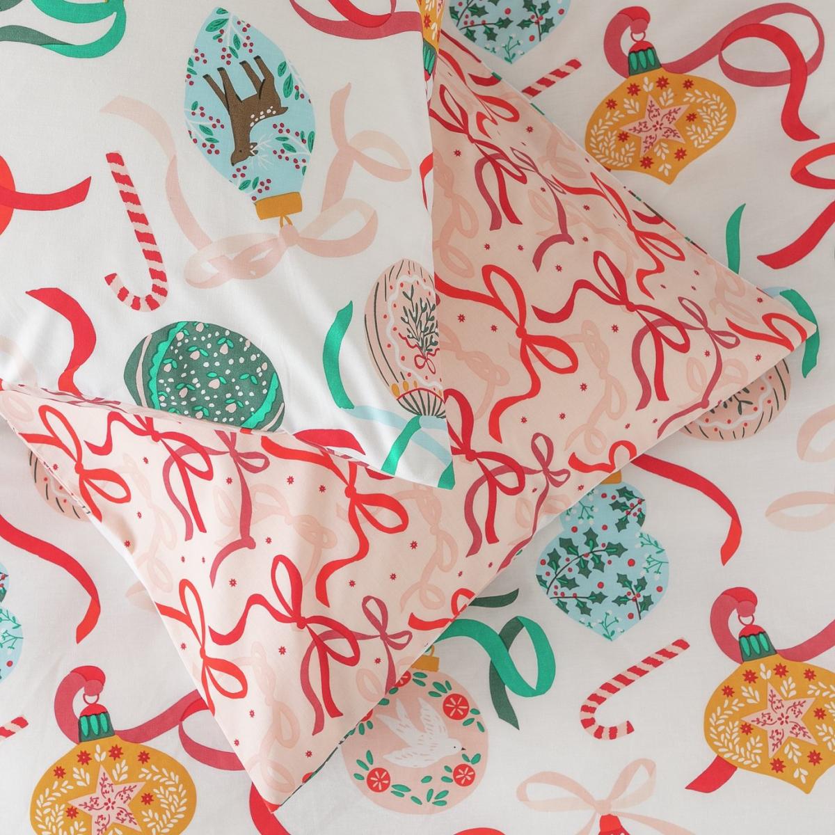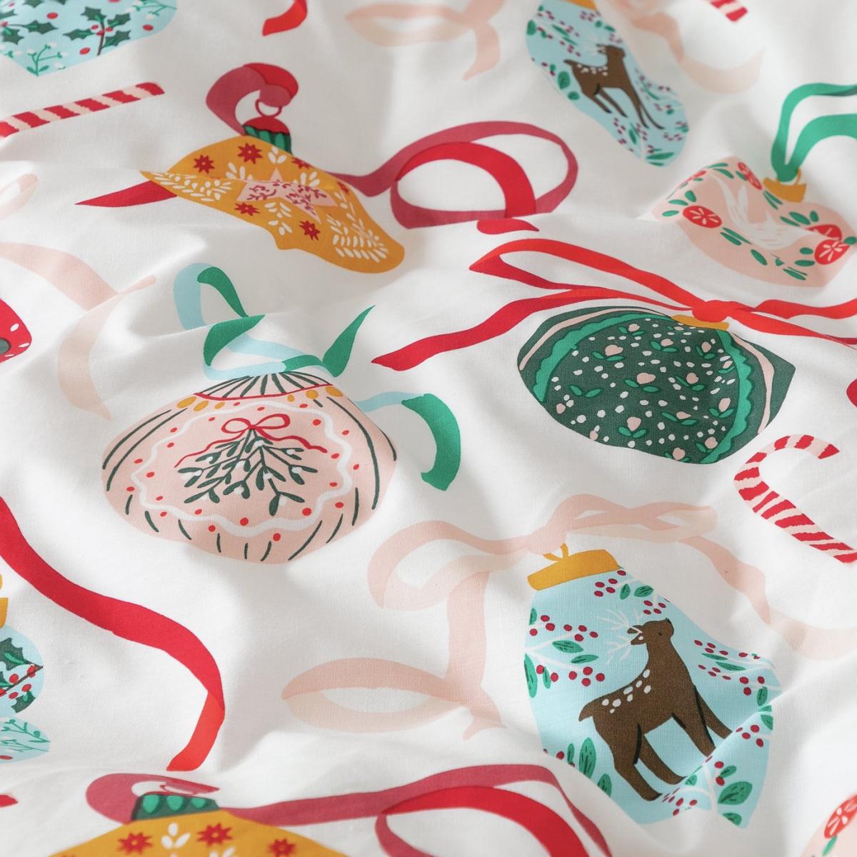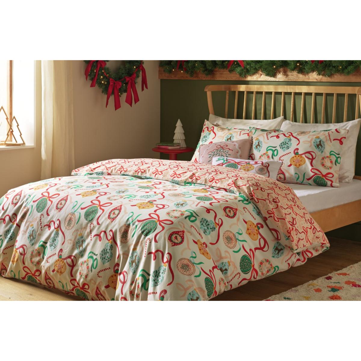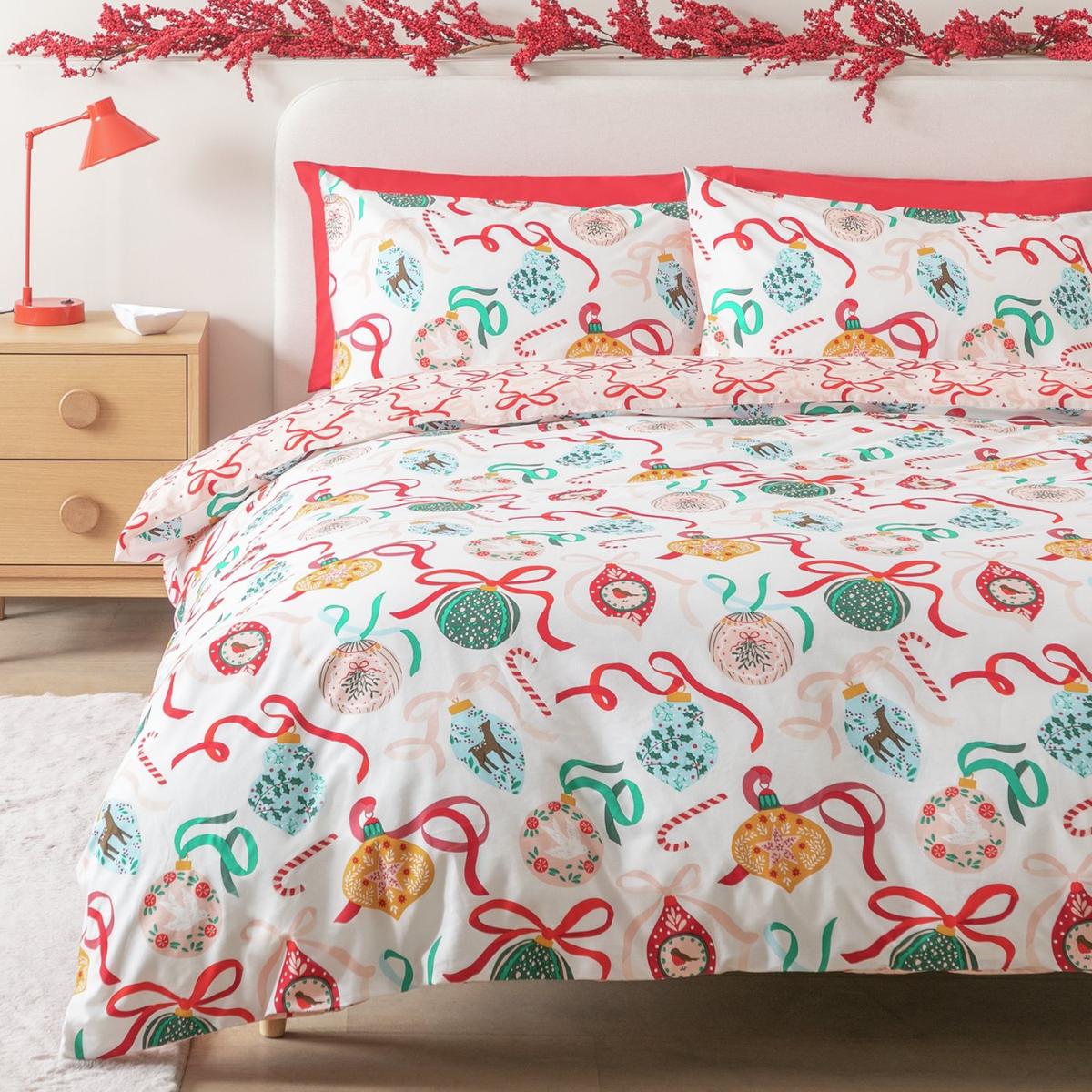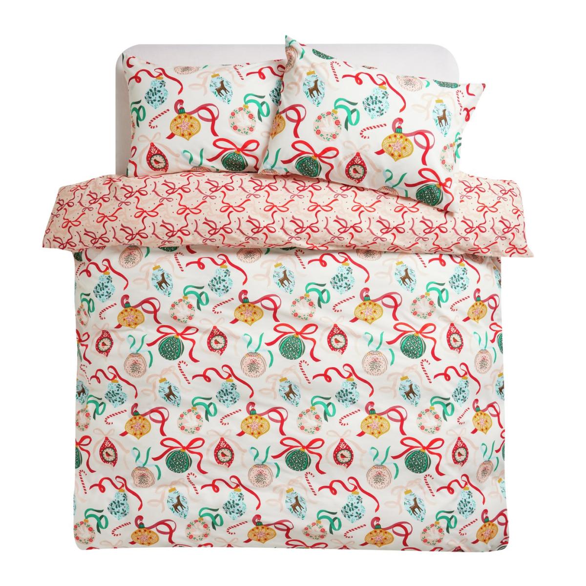 The holidays are coming! Decorated with baubles, bows and candy canes, this superking size bedding set is full of festive fun. Flip it over and you'll find another bow-tiful design. Ready to celebrate the season? Fabric finish: printed. 50% recycled polyester, 50% cotton. 144 thread count. Set includes 1 duvet cover and 2 pillowcases. Bed size: super king. Length 220cm, Width 260cm. Reversible. Buttons for fastening. Standard pillowcase (s). Pillowcase length 75cm, Width 50cm. Reversible pillowcase (s). Machine washable. Suitable for tumble drying.