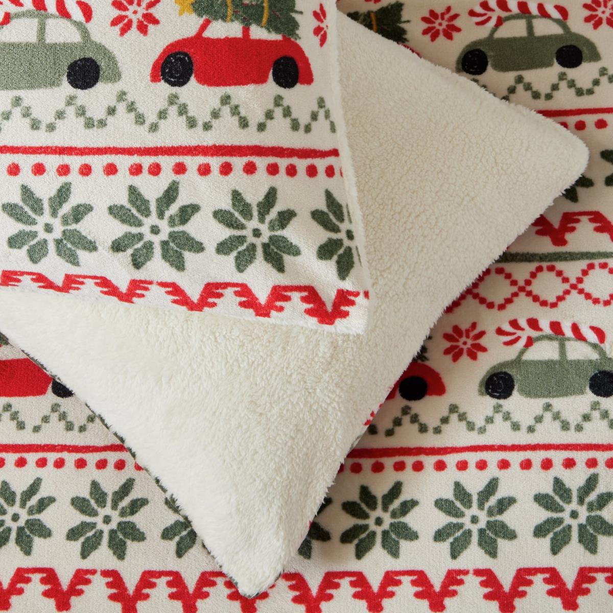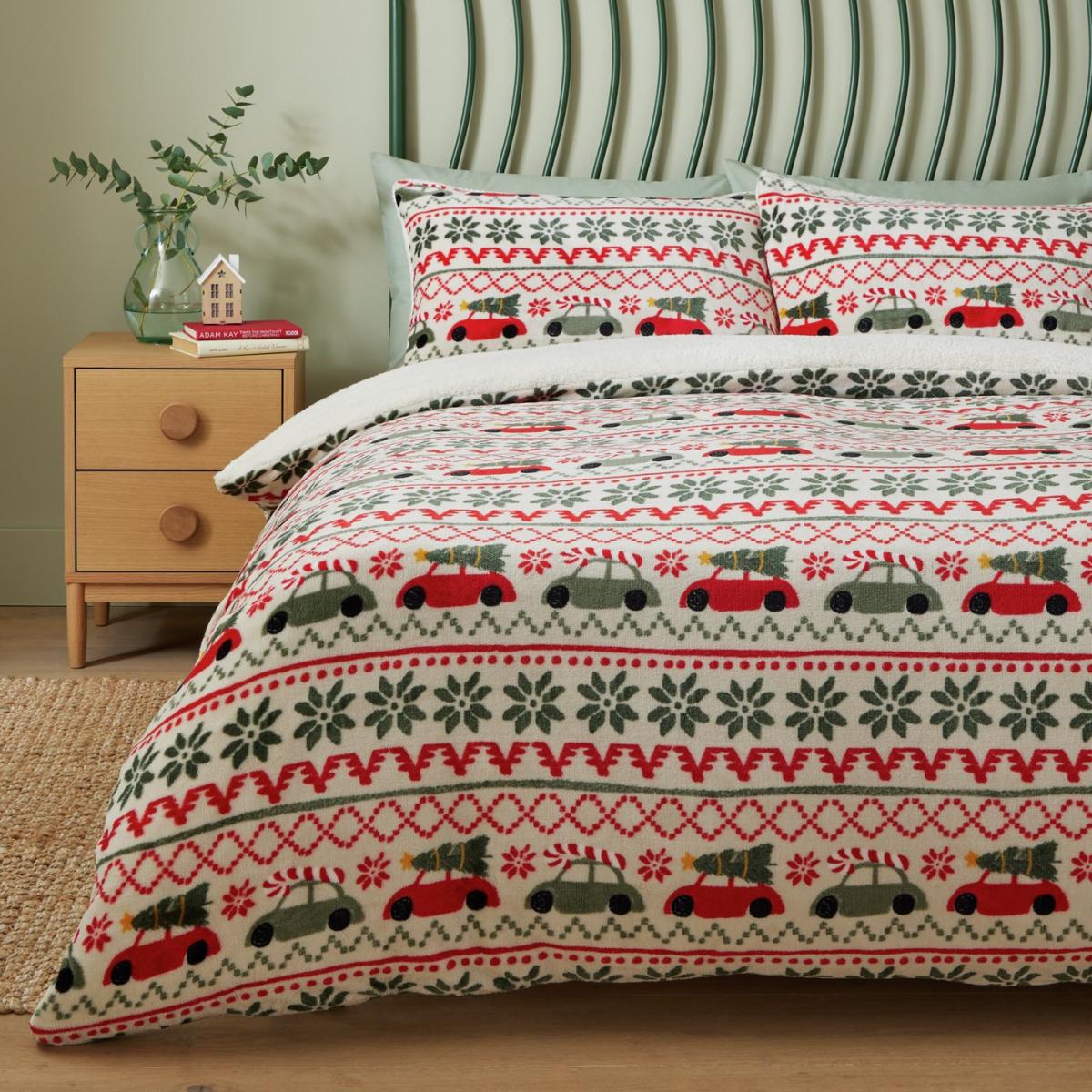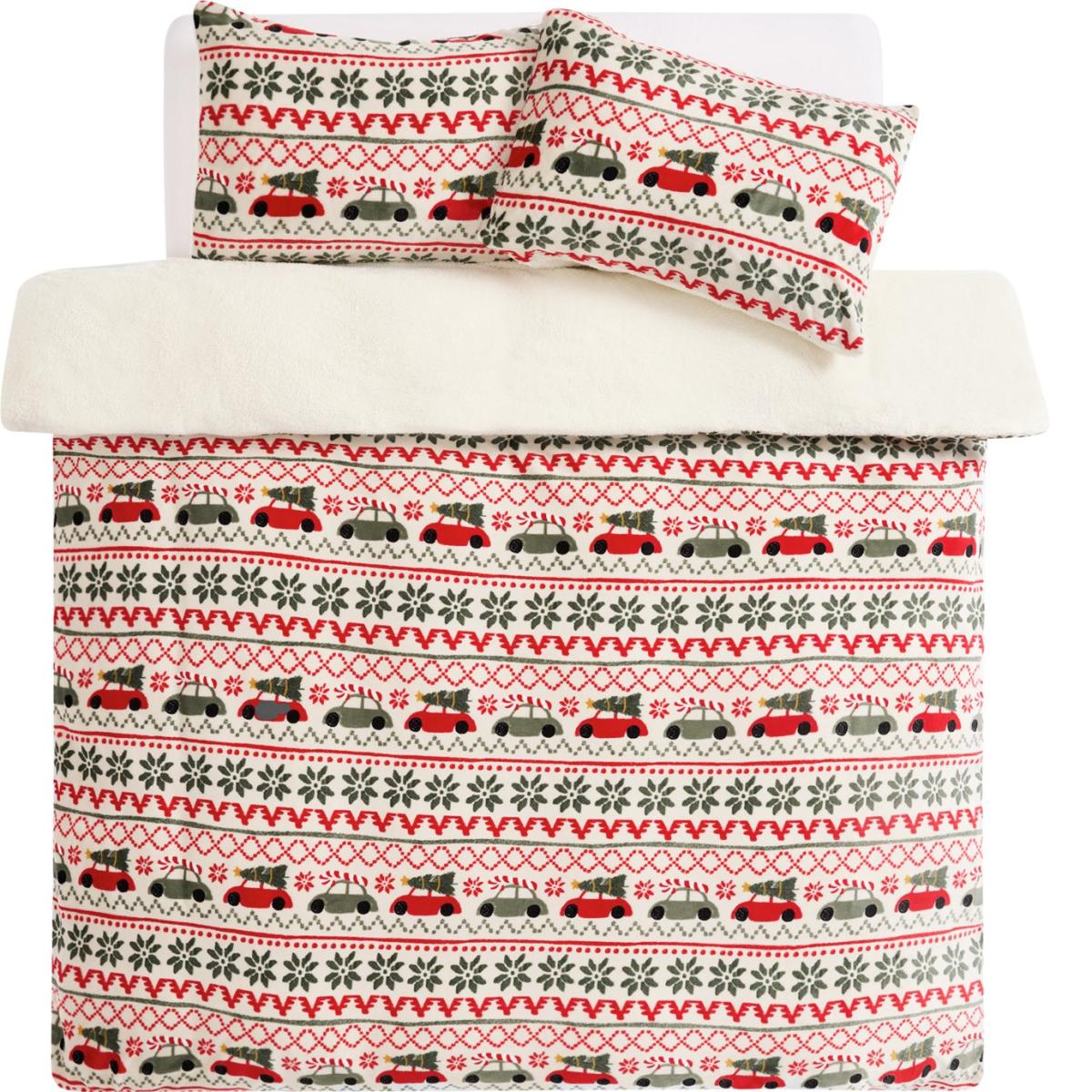 Tree strapped to the roof? Tick. Cosy vibes? Double tick. Off we go. This fleece double bedding set brings all the feels of yuletide joy home. And when you want to tone it down, just flip over for a blanket of snowy white. It's the perfect way to park the festive spirit in your bedroom. This item carries the STANDARD 100 by OEKO-TEX logo, which means you can be certain that every component has been tested for harmful substances and is therefore harmless to human health. Fabric finish: fleece. 100% polyester. Set includes 1 duvet cover and 2 pillowcases. Bed size: double. Length 200cm, Width 200cm. Buttons for fastening. Standard pillowcase (s). Pillowcase length 75cm, Width 50cm. Gentle wash at 40 C. Suitable for tumble drying.