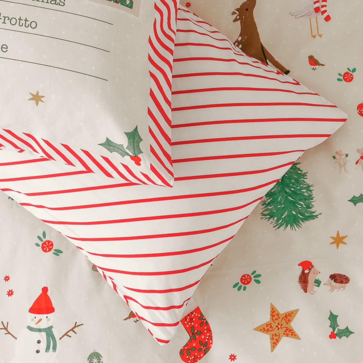 Dear Santa, please can I have this bedding set. What a fun festive way to dress a king size bed. The duvet cover is filled with classic Christmas icons, like reindeer, snowmen, stockings and trees. And the cheeky pillowcases are letters to Father Christmas himself. Want to change things up? Simply turn over to display its red-and-white striped side. Two looks, one snuggly set. Fabric finish: percale. 52% recycled polyester, 48% cotton. 144 thread count. Set includes 1 duvet cover and 2 pillowcases. Bed size: king size. Length 220cm, Width 230cm. Reversible. Buttons for fastening. Standard pillowcase (s). Pillowcase length 75cm, Width 50cm. Machine washable at 40 C. Suitable for tumble drying.