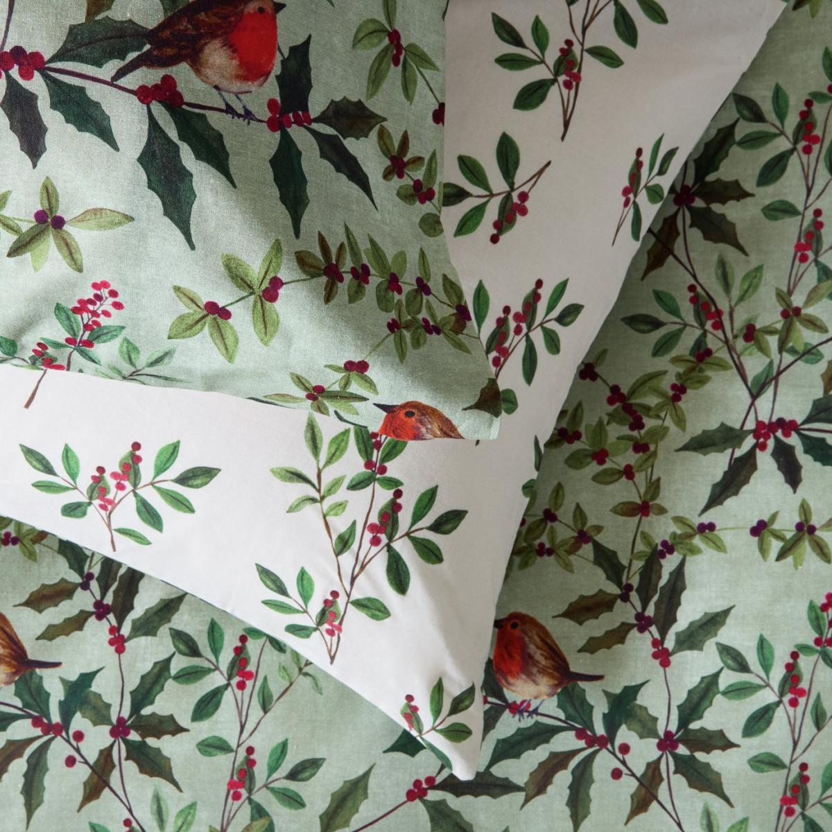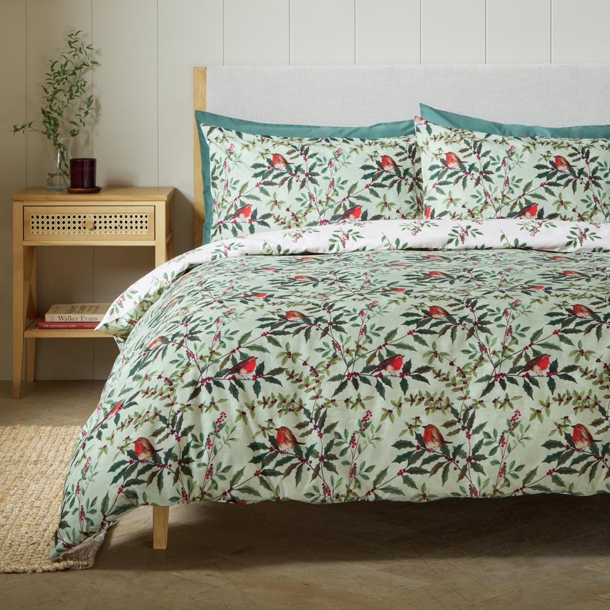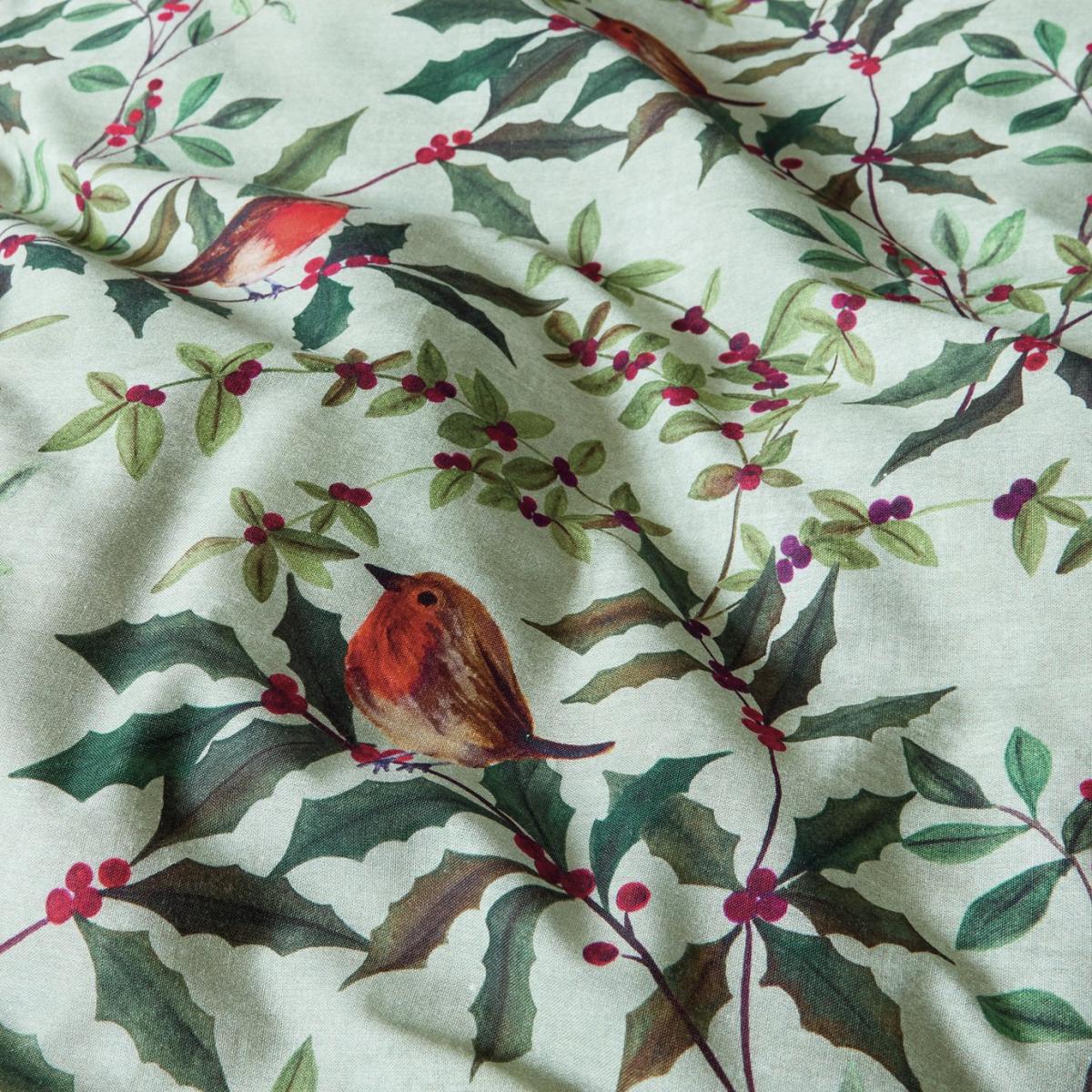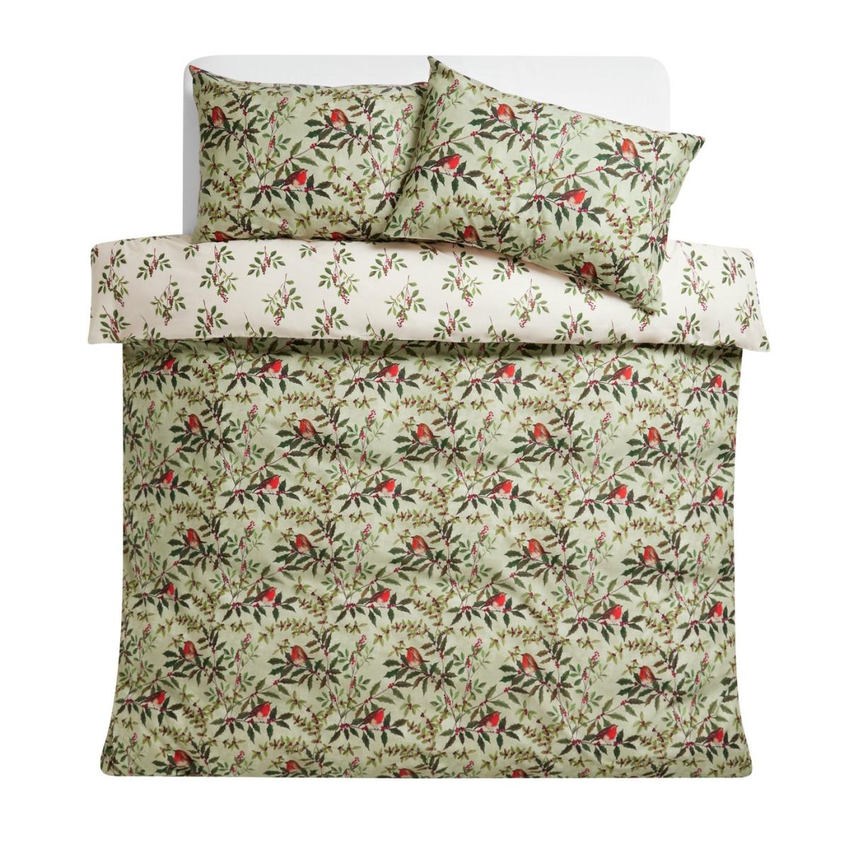 Embrace the seasonal spirit with this charming bedding set. On one side plump robins perch on berry-laden holly. And on the other, lush foliage adorns a soft cream background. Two looks in one. Made from super-soft fabric, it's perfect for curling up and staying snug. Fabric finish: printed. 50% polyester, 50% cotton. 144 thread count. Set includes 1 duvet cover and 1 pillowcase. Bed size: single. Length 200cm, Width 135cm. Buttons for fastening. Standard pillowcase (s). Pillowcase length 75cm, Width 50cm. Machine washable. Suitable for tumble drying.