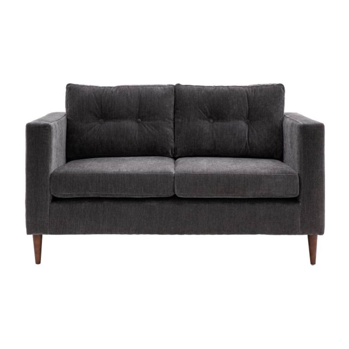 Ideal for contemporary style interiors, this lovely sofa features sleek lines with block arms and button detailing on the back cushions paired with elegant tapered wooden feet. It is upholstered in a lovely charcoal grey fabric but is also available in green and natural. A matching armchair and 3-seater sofa are available. Material:Pine 45% / Foam 23% / Fabric 13% / Plywood 10% / Beech 9%. Colour/Finish: Charcoal.