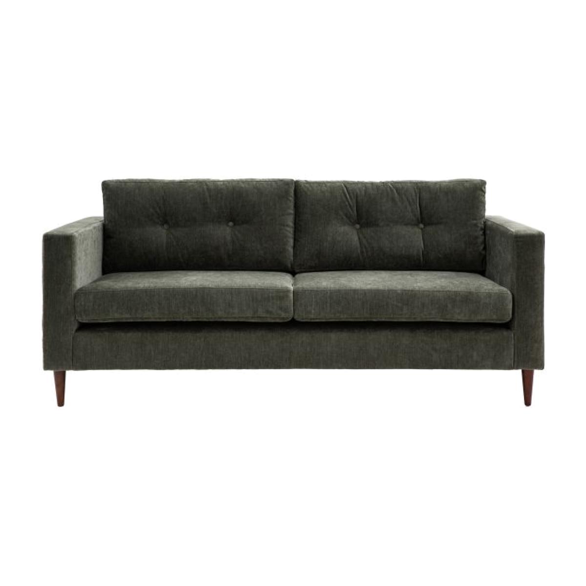 This lovely sofa features sleek lines with block arms and button detailing on the back paired with elegant tapered wooden feet, offering stylish contemporary design. It is upholstered in a lovely green fabric but is also available in grey and natural. A matching armchair and 2-seater sofa are available. Material:Pine 45% / Foam 23% / Fabric 13% / Plywood 10% / Beech 9%. Colour/Finish: Forest.