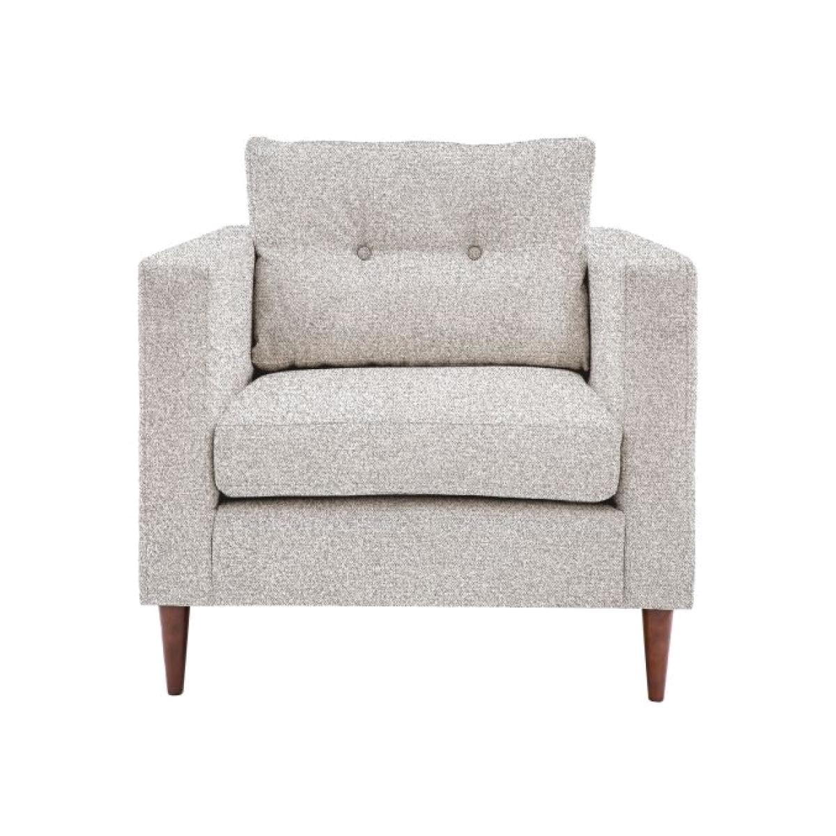 Offering stylish contemporary design, this lovely armchair features sleek lines with block arms and button detailing on the back paired with elegant tapered wooden feet. It is upholstered in a lovely light grey coloured fabric. Material:Pine 45% / Foam 23% / Fabric 13% / Plywood 10% / Beech 9%. Colour/Finish: Light Grey.
