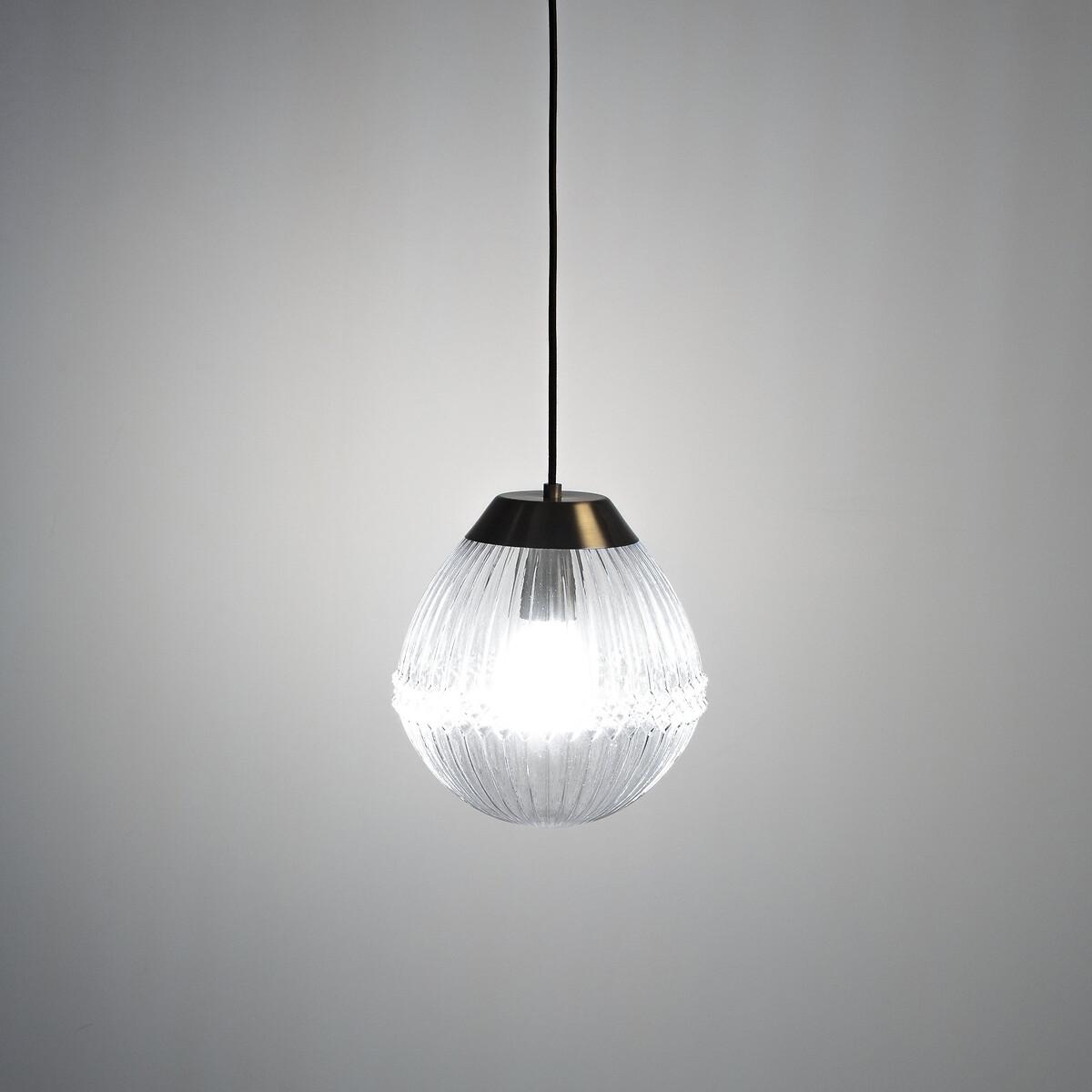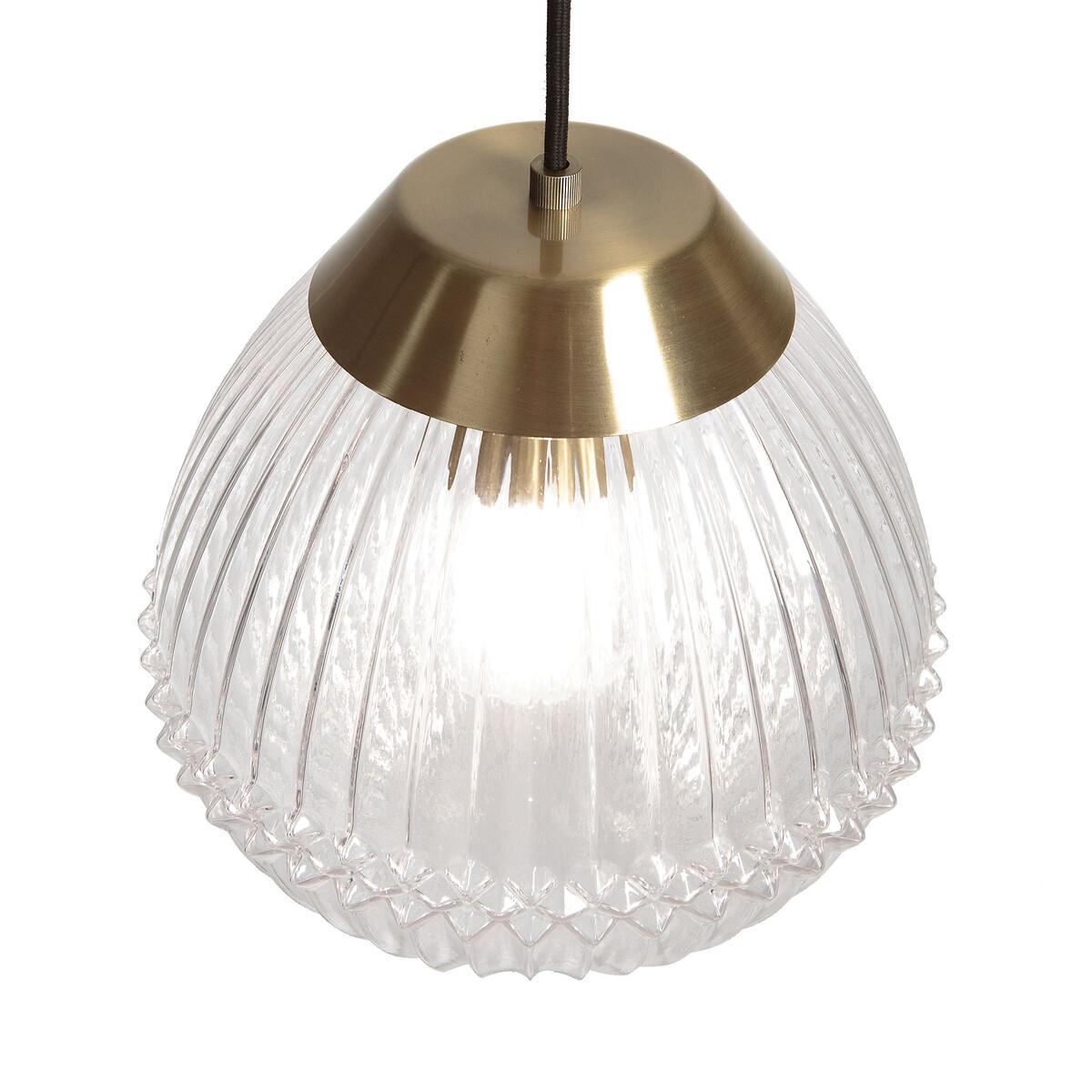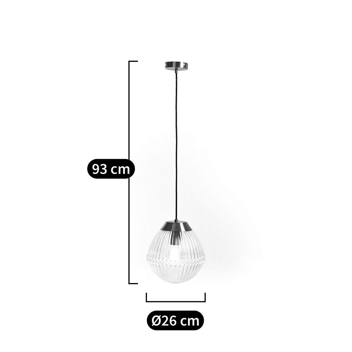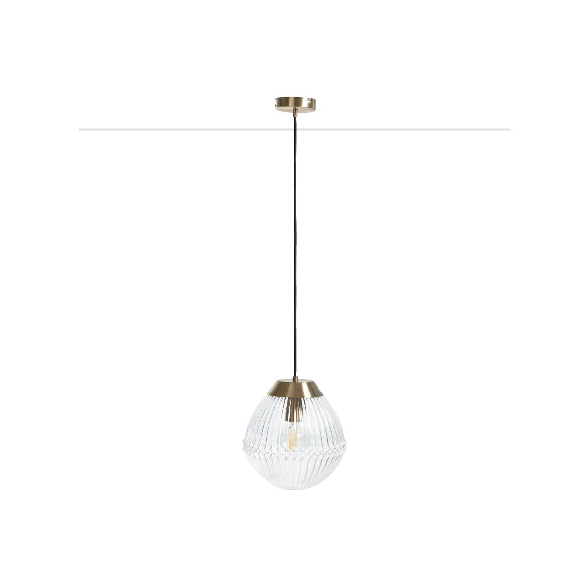 The Ari ceiling pendant has a shabby chic vibe we love. Bringing to mind the quaint elegance of antique fixtures, its vintage-style brass blend and ribbed glass globe will add charm and sophistication to your space. Product Details • Brass-effect steel and textured glass ceiling light • E27 socket for 25W max bulb, (not included). • Compatible with energy saving bulbs classes: A-E • Cable length 65cm • Black fabric covered cable. Dimensions • Diameter 26cm • Height: 93cm. Dimensions and weight of parcel:1 parcel • 31 x 31 x 37cm • 2.5kg