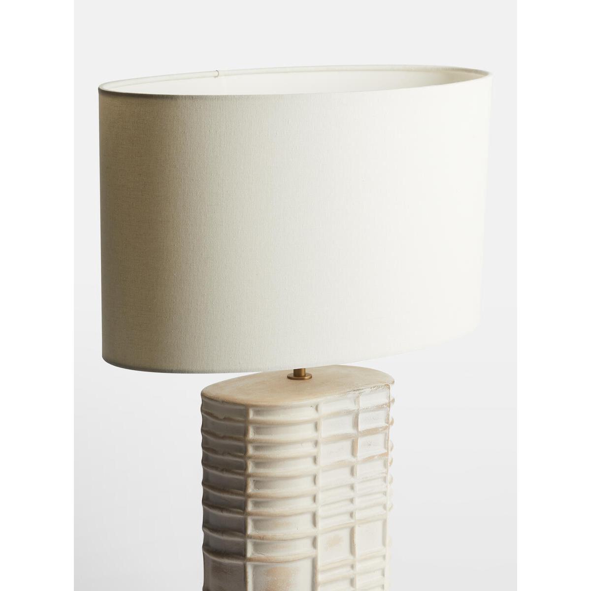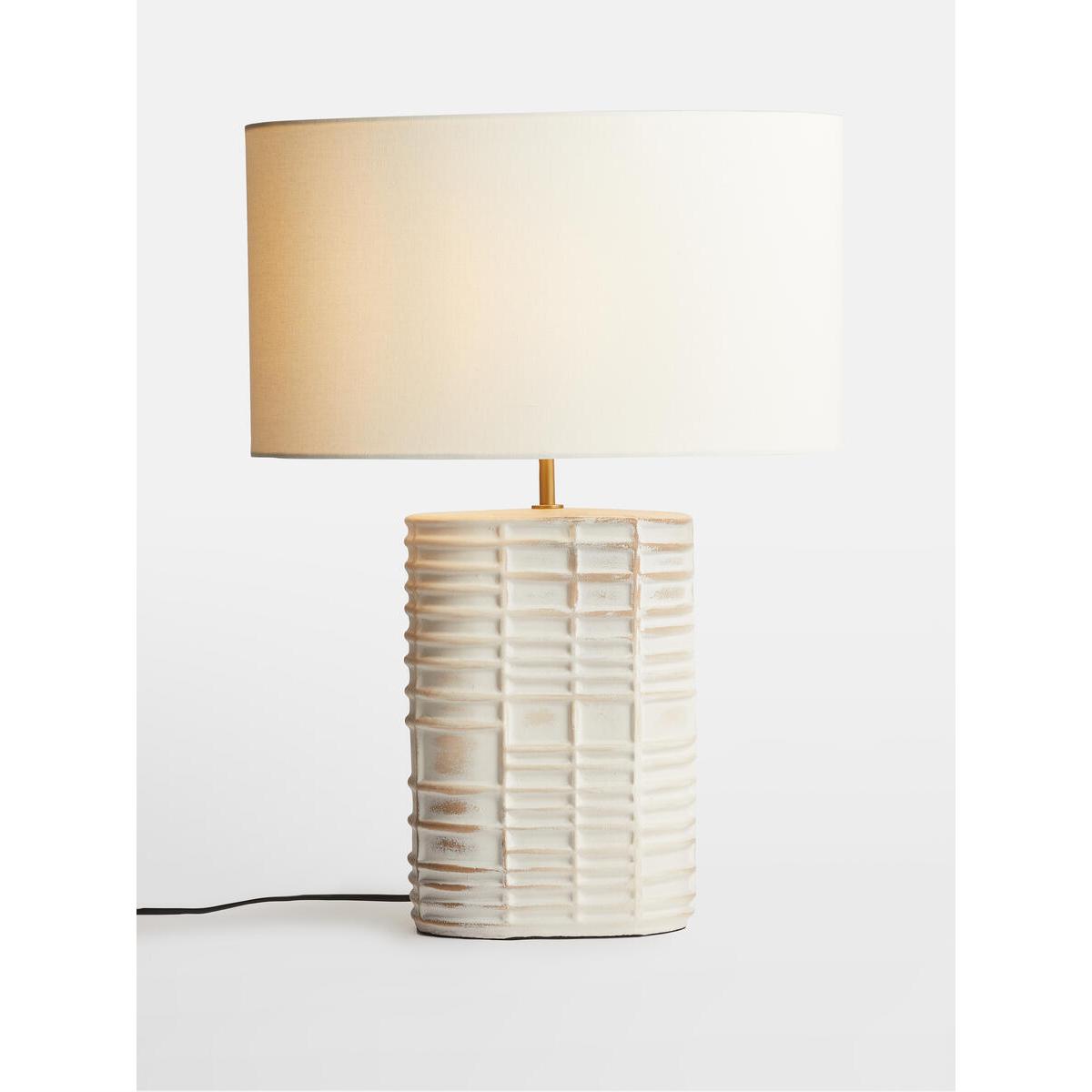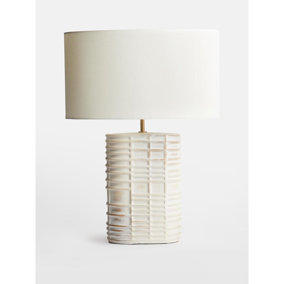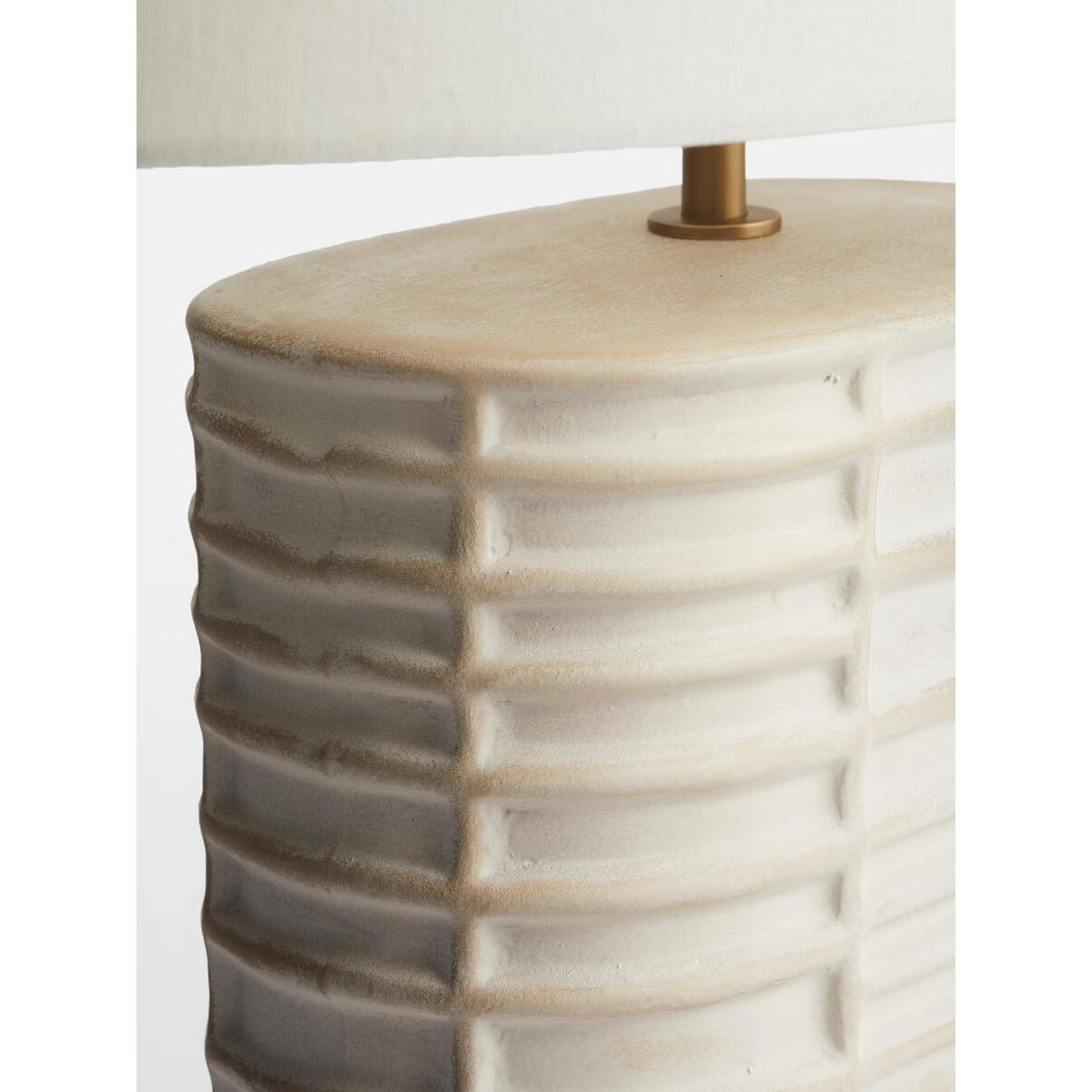 The Ari table lamp is crafted from white ceramic with subtleindentations that create an organic textured effect. It isaccompanied by an ivory linen shade and finished with antique brassaccents for a modern update. Perch it on a console table, or keepit bedside to create an ambience for late-night reading. Table lamp. Ceramic base. Ivory linen shade. Rub-through matte finish. Antique brass finish. Requires 1 E27 9W Bulb. Inspired by 180 House and White City House.