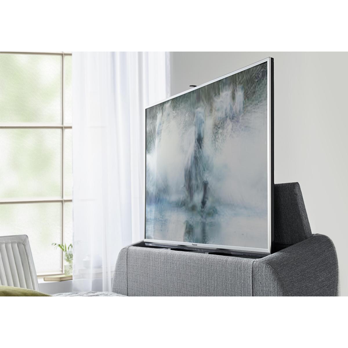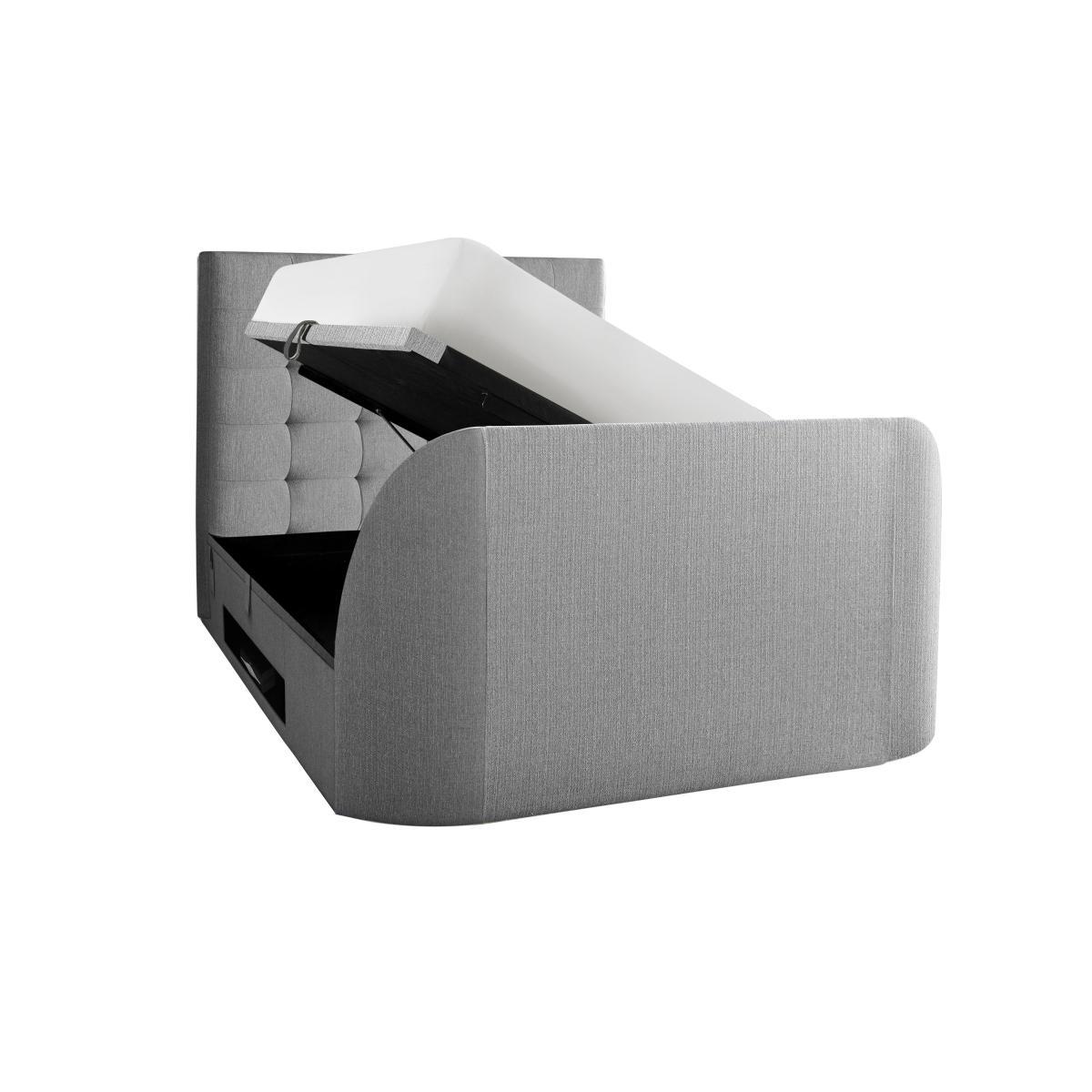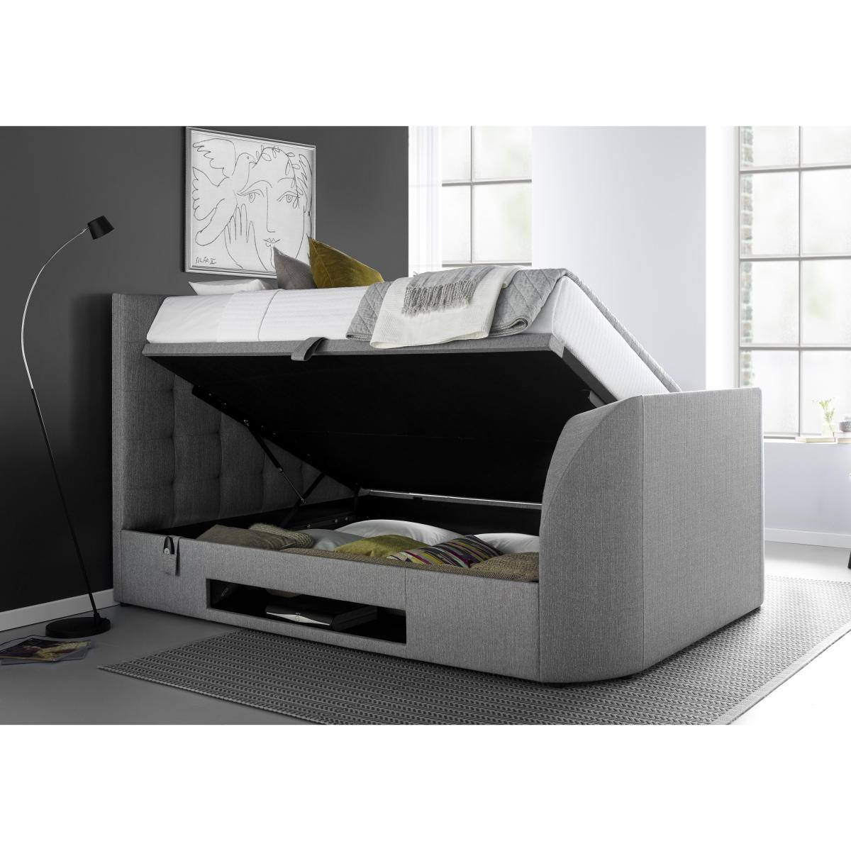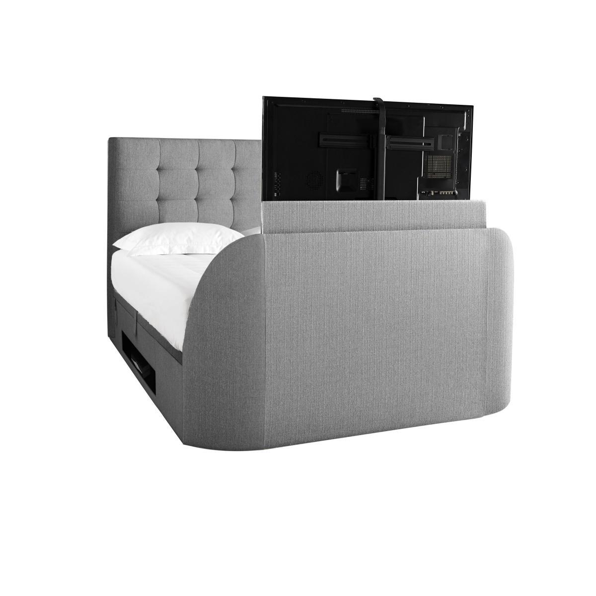Relax in style – and watch your favourite show at the same time. The footboard of this contemporary ottoman bed frame has space for a flatscreen TV and the large underbed storage compartment has room for almost everything else. Please note: TV not included. Why you’ll love it. Stylish ottoman storage divan base with remote controlled TV lift mechanism. Contemporary luxury for a modern bedroom. Tall buttoned headboard and slim footboard with space for up to a 42” TV. TV is raised and lowered by remote control (included). Large ottoman storage compartment plus useful media storage area. Available in a choice of beautiful upholstery fabrics. Finished by hand. A Furniture Village online exclusive. What you need to know. TV not included. Suitable for TVs no deeper than 7.5 cm. Platform-style base. Clean upholstery weekly using a soft brush or vacuum with the curtain attachment. Annual professional cleaning is recommended. Some fabrics can show wear on areas of more use or in direct sunlight. Available in double, king and super king sizes.