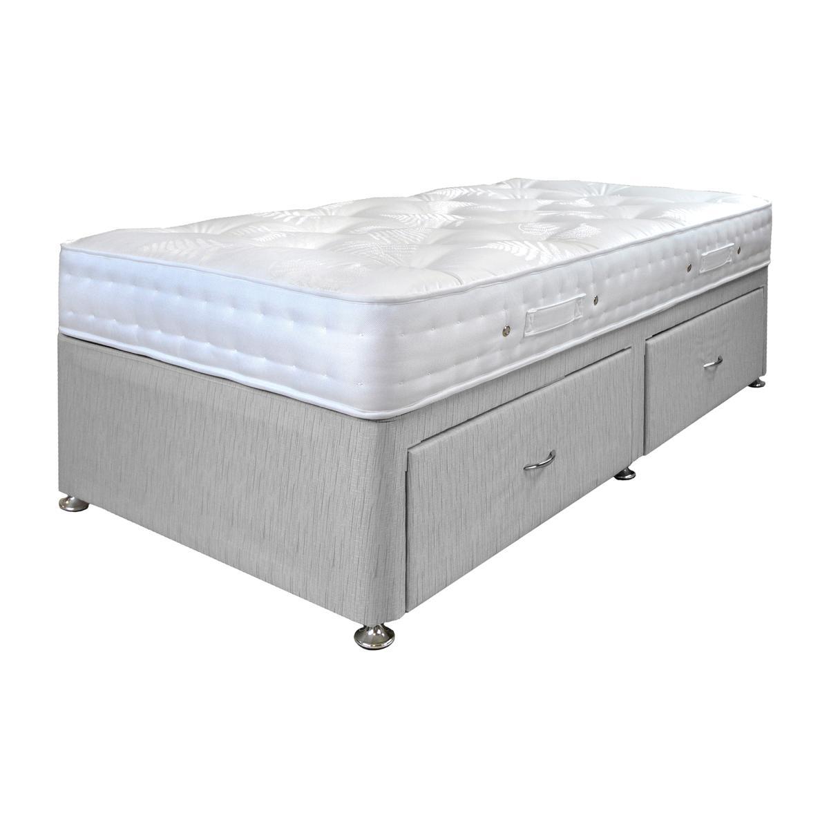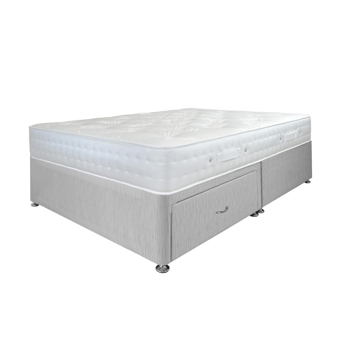This product will be dispatched by one of our trusted suppliers. You’ll be contacted by their selected courier about your delivery. The Aria 1000 mattress and divan set is popular because it great quality at a great price. The mattress features ice white fine damask fabric is woven with a fern leaf design and is complemented with a brilliant white border and beautiful side stitching. Please note fabric design may vary from image. At the centre of this mattress lays a core of individually pocketed springs, which independently respond to your movements as you turn in the night and offers excellent levels of comfort and support. The Aria is finished in the traditional way by tufting the fabrics and fillings with fine tapes and decorative collars. This gives the mattress not only a great look but allows you to get the maximum comfort from the multi-layers of cushioning. Firmness Rating: Medium. Sleeping Surface: High quality damask, tufted for comfort. Mattress Core: 1000 pocketed springs that adapt to body contours. Comfort Layer: Soft white fillings, for added comfort. Mattress Care: Just rotate to keep the fillings fresh. Mattress Depth: 23cm. Divan Base: High quality damask on pine frame. Manufacturer's warranty: 1 year with an additional 4 years reduced warranty. Peace of Mind: National Bed Federation Accredited. Divan Feature: Silver Glides. Fire Accreditation: Meets all UK Fire Regulations. Product Dimensions: Single: Weight: 52kg, Length: 190cm, Width: 90cm, Height: 60cm. Double: Weight: 66kg, Length: 190cm, Width: 135cm, Height: 60cm. King: Weight: 74kg, Length: 200cm, Width: 150cm, Height: 60cm. Super King: Weight: 87kg, Length: 200cm, Width: 180cm, Height: 60cm. Please measure your available space before ordering. Packaged Dimensions: Single:Parcel 1 Packaged Dimensions: 190cmx 90cmx 23cm Weight: 18.9kg Parcel 2 Packaged Dimensions: 192cmx 92cmx 33cm Weight: 26.6kgDouble: Parcel 1 Packaged Dimensions: 190cmx 135cmx 23cm Weight: 26.1kg Parcel 2 Packaged Dimensions: 137cmx 97cmx 33cm Weight: 24.2kg Parcel 3 Packaged Dimensions: 137cmx 97cmx 33cm Weight: 11.3kgKing:. Parcel 1 Packaged Dimensions 200cmx 150cmx 23cm Weight: 30.5kg Parcel 2 Packaged Dimensions: 152cmx 102cmx 33cm Weight: 24.5kg Parcel 3 Packaged Dimensions: 152cmx 102cmx 33cm Weight: 13kg Super King:Parcel 1 Packaged Dimensions: 200cmx 180cmx 23cm Weight: 36.4kg Parcel 2 Packaged Dimensions: 202cmx 92cmx 33cm Weight: 27.2kg Parcel 3 Packaged Dimensions: 202cmx 92cmx 33cm Weight: 18.5kg.