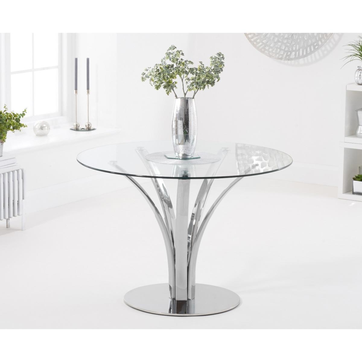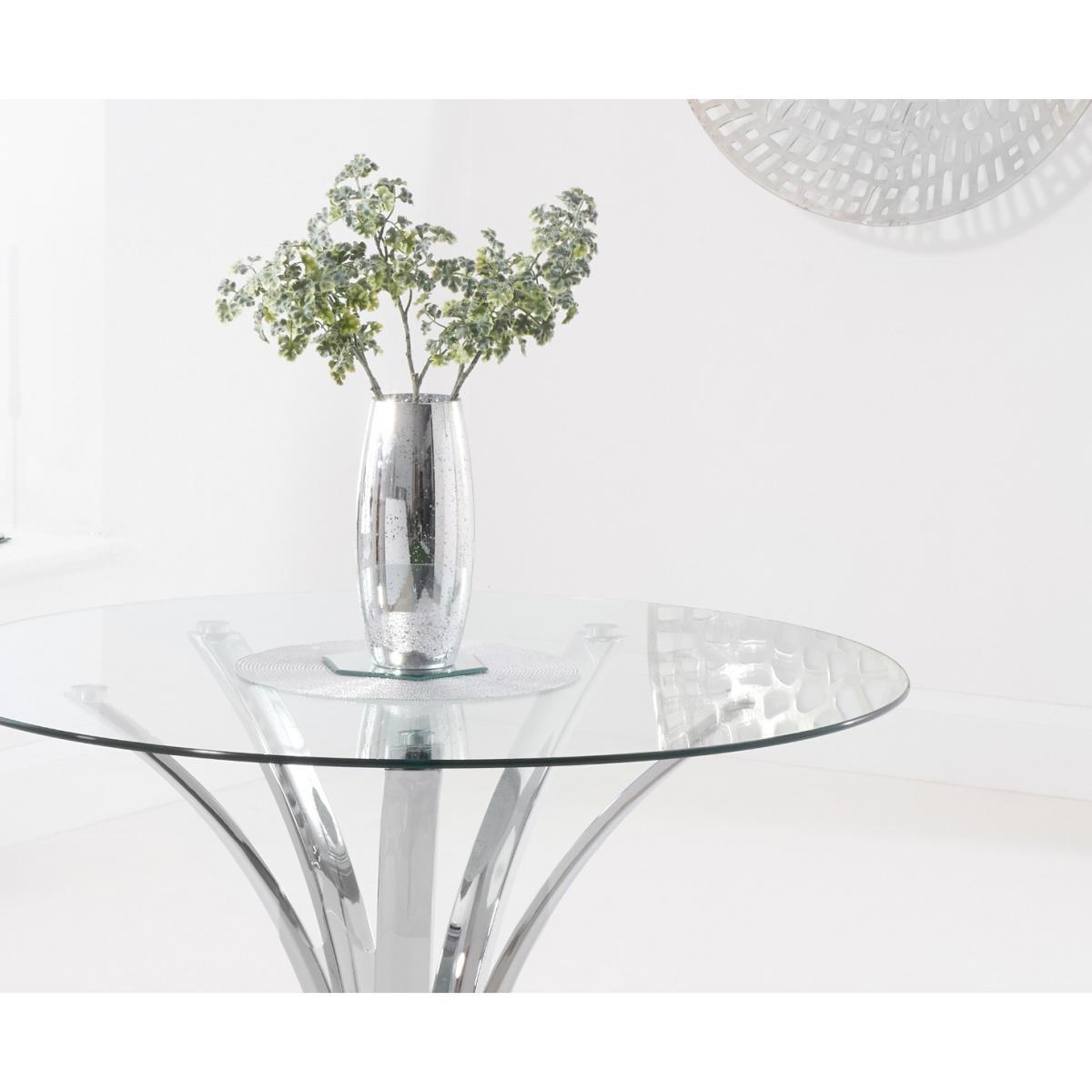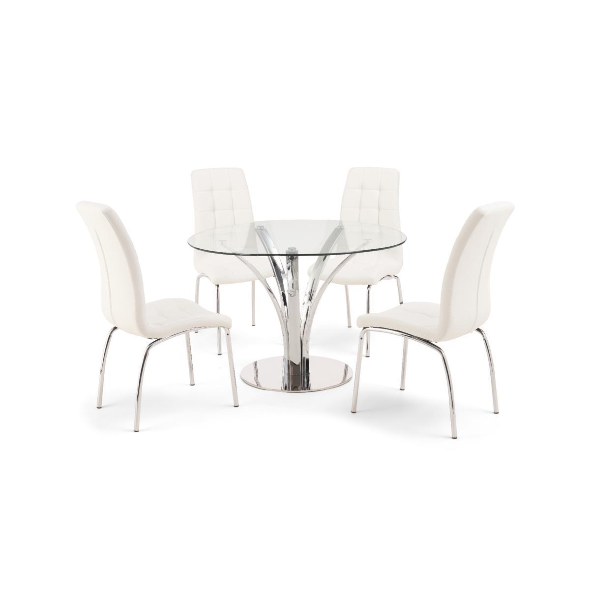 With a modern circular glass top and intricate chrome legs, the Aria makes a fantastic centrepiece to any dining room or kitchen diner. Pair with the practical Calgary faux leather chairs for an easy to look after, yet stylish dining set. 110cm top, ideal for smaller spaces Pairs with the Calgary dining chairs Modern glass top 12 month guarantee