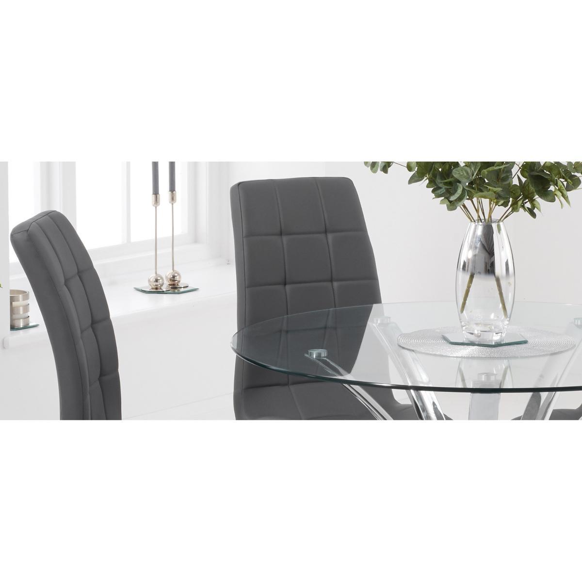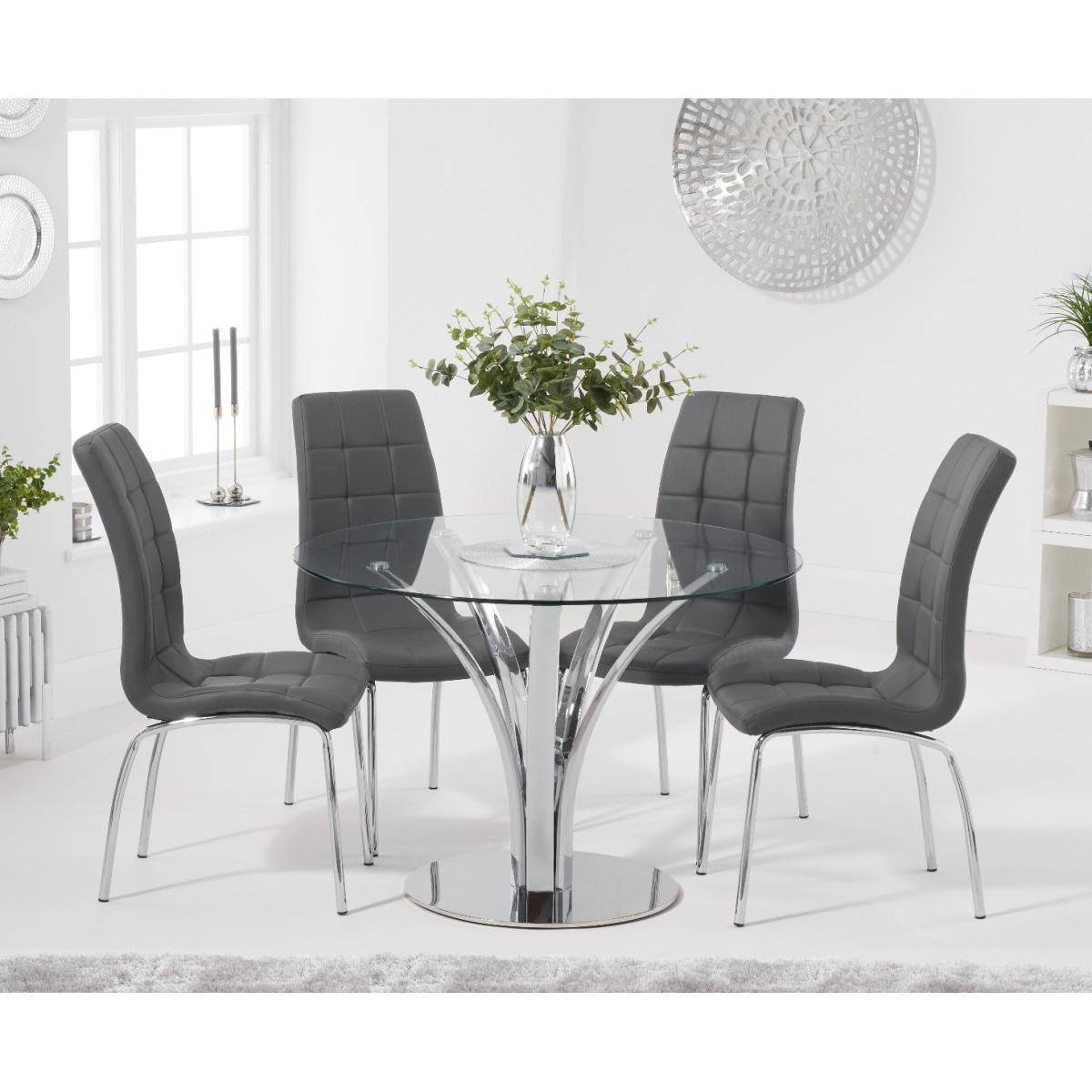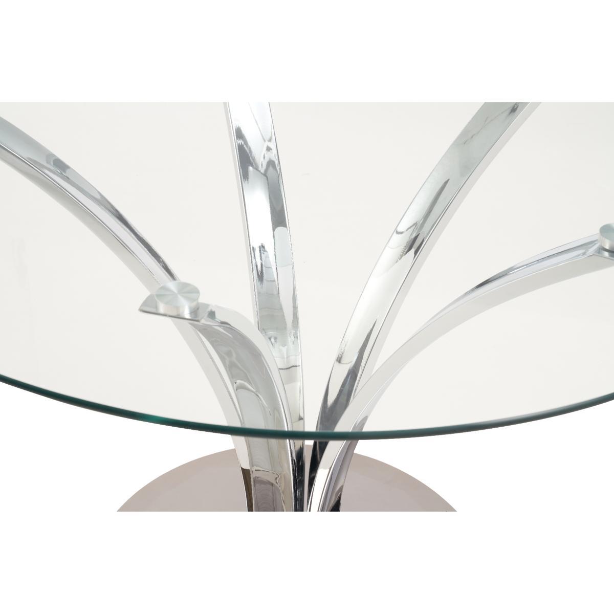 With a modern circular glass top and intricate chrome legs, the Aria makes a fantastic centrepiece to any dining room or kitchen diner. Pair with the practical Calgary faux leather chairs for an easy to look after, yet stylish dining set. 110cm top, ideal for smaller spaces Pairs with the Calgary dining chairs Modern glass top 12 month guarantee