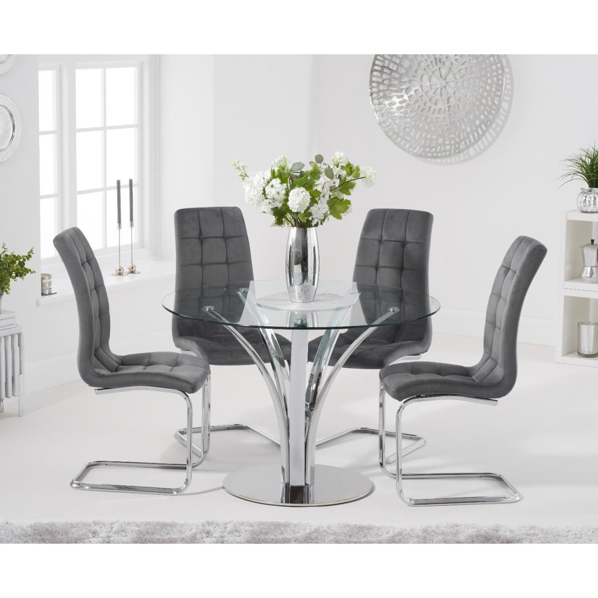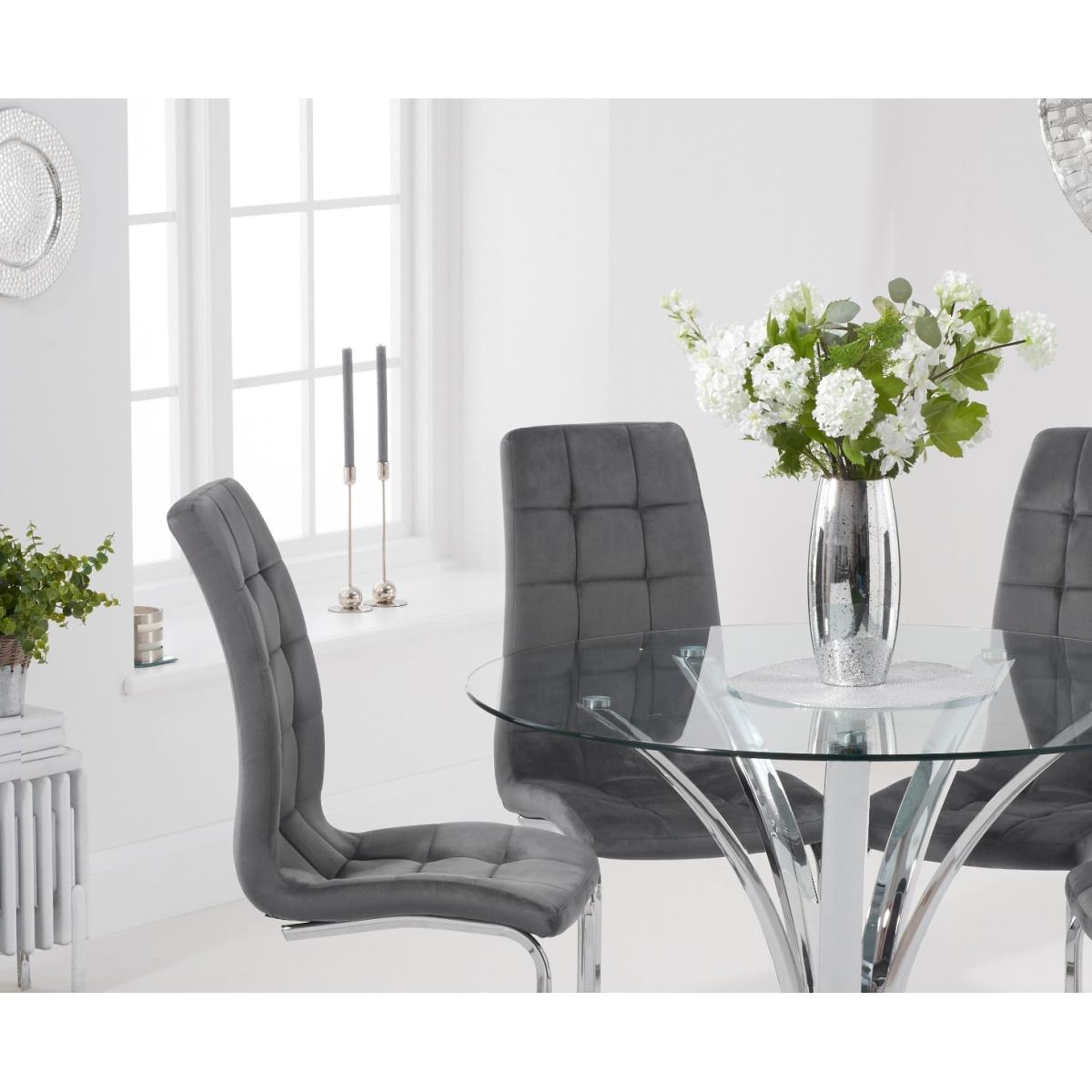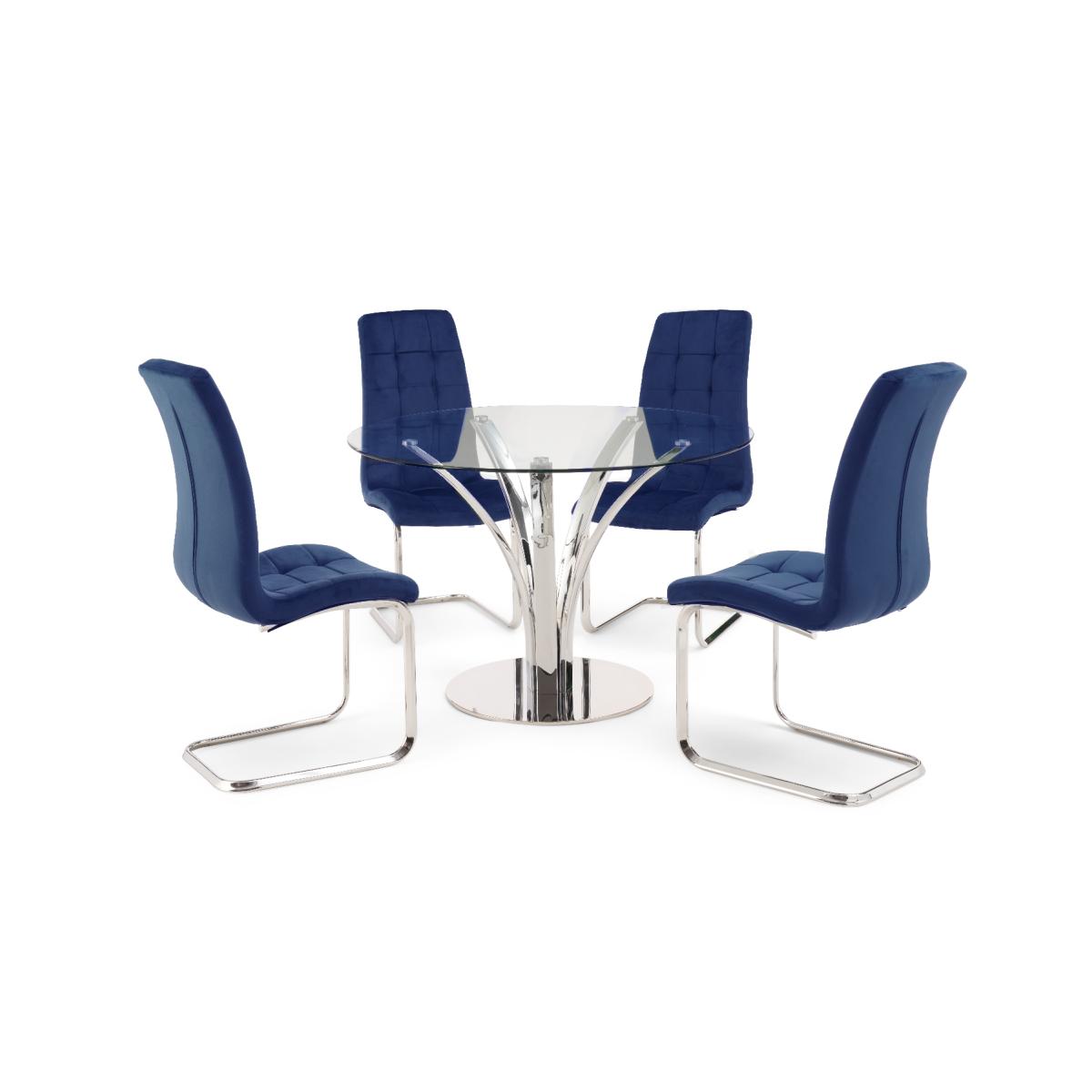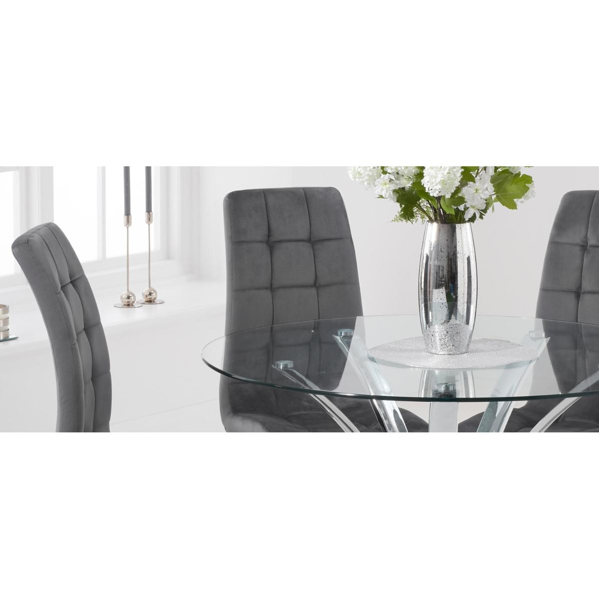With a modern circular glass top and intricate chrome legs, the Aria is an elegant centrepiece for any dining room or kitchen diner. Pair with the luxurious Lorin velvet chairs for a dining set which will be the talk of the town. 110cm top Pairs well with the Lorin dining chairs Modern glass top 12 month guarantee