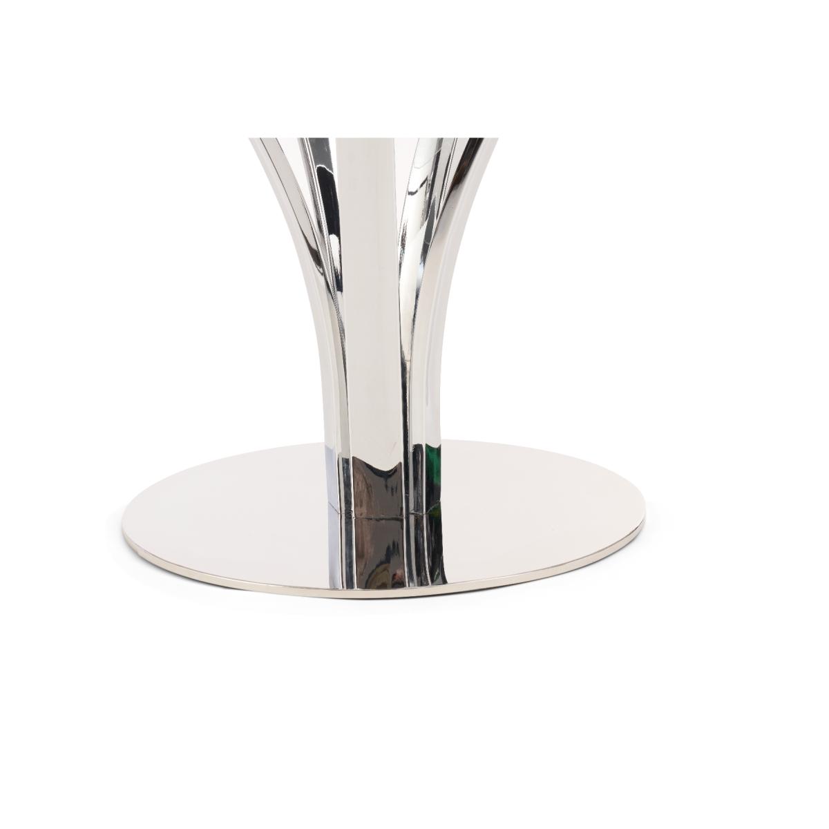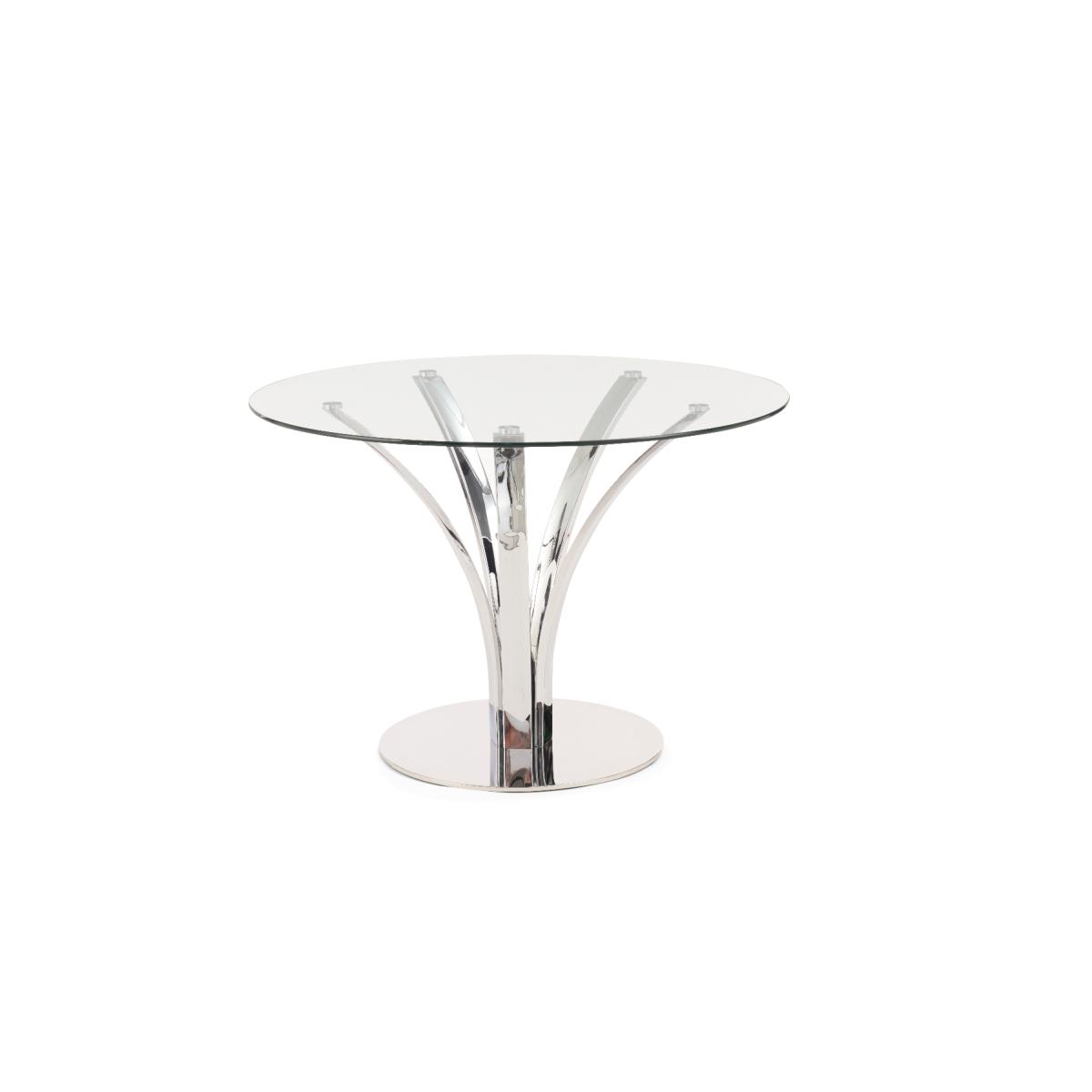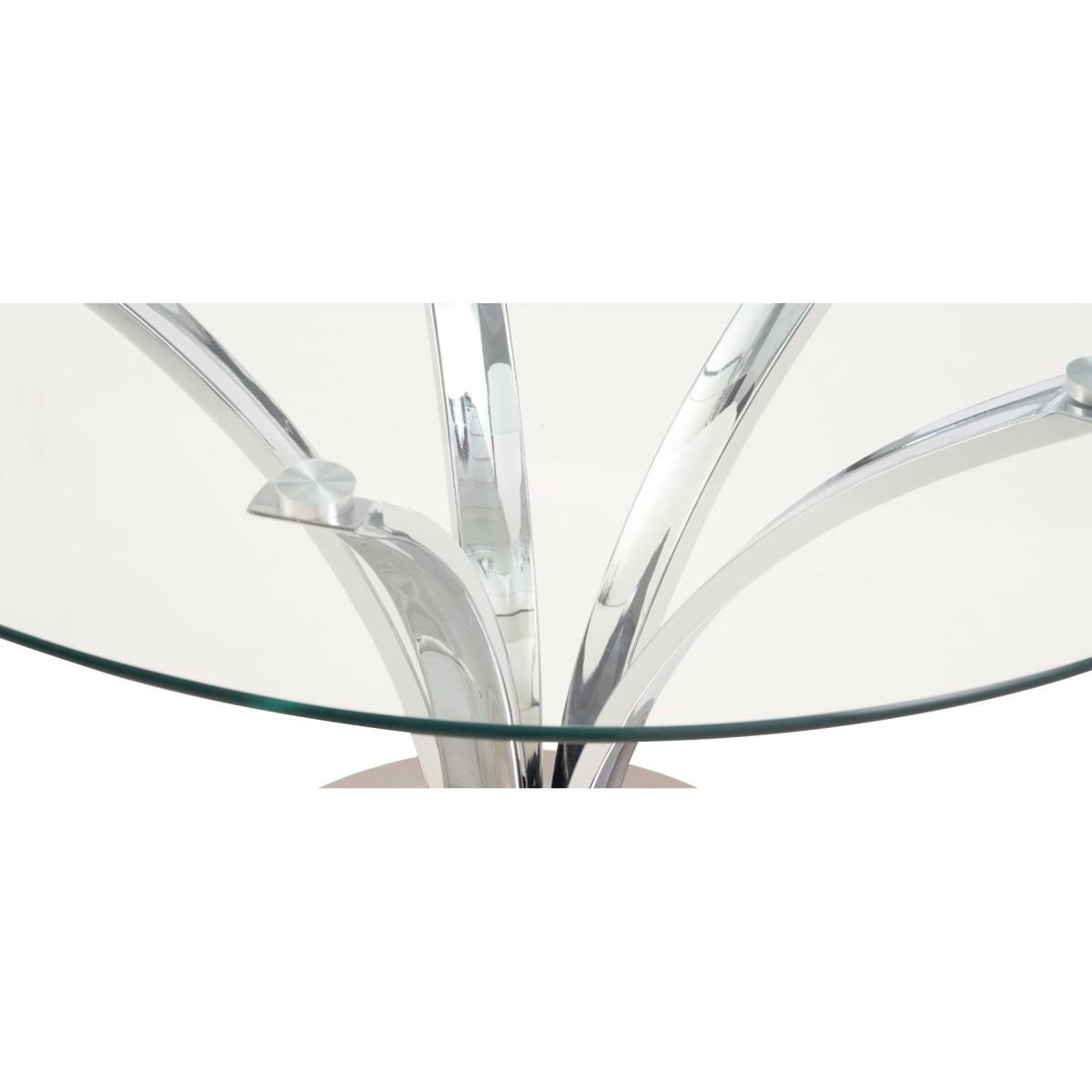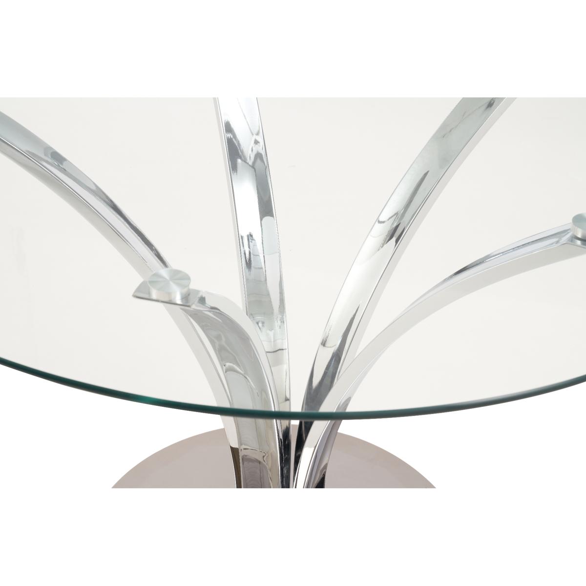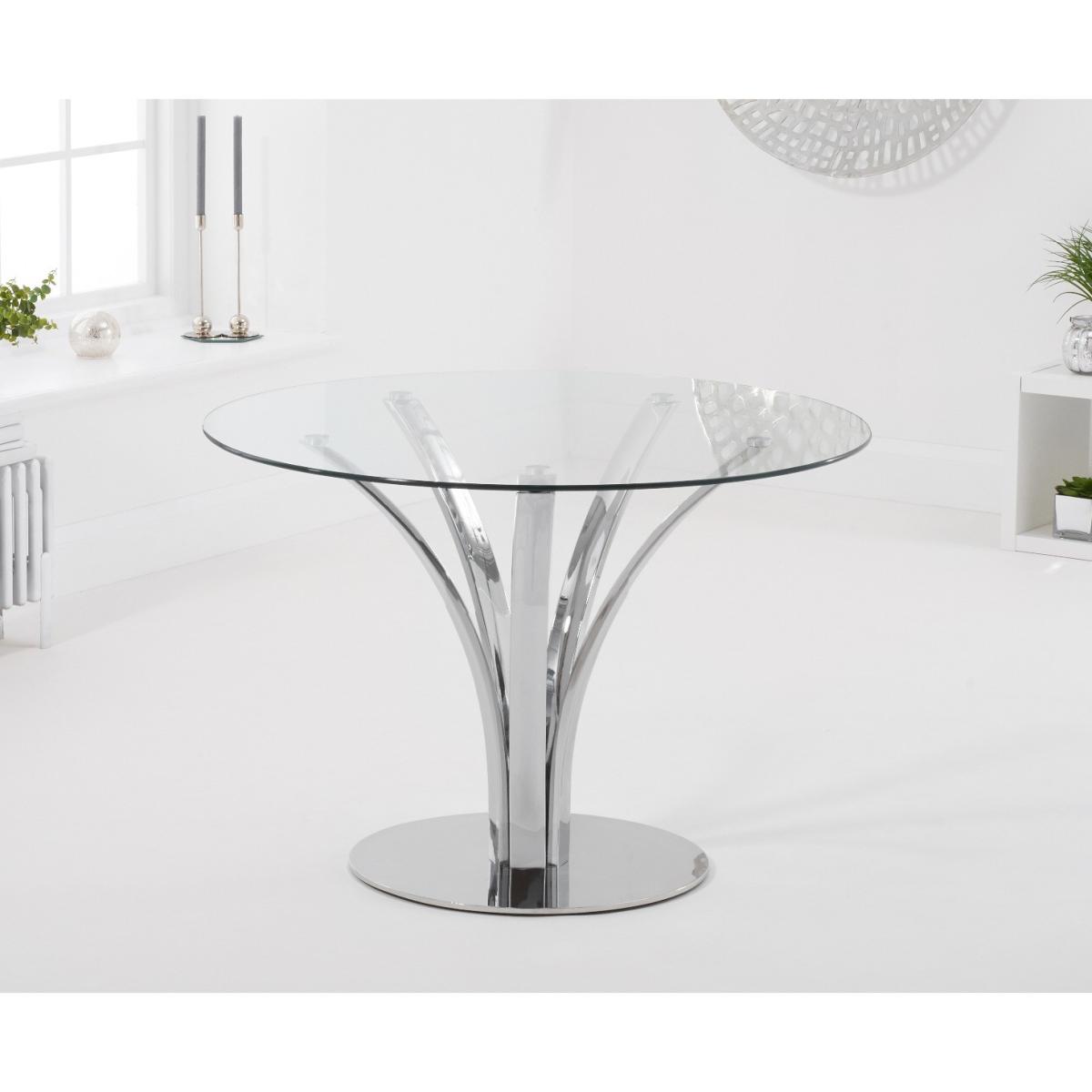 With a modern circular glass top and intricate chrome legs, the Aria is an elegant centrepiece for any dining room or kitchen diner. Pair with the luxurious Lorin velvet chairs for a dining set which will be the talk of the town. 110cm top Pairs well with the Lorin dining chairs Modern glass top 12 month guarantee