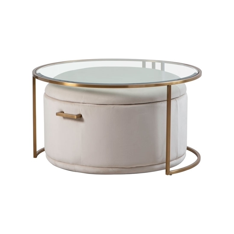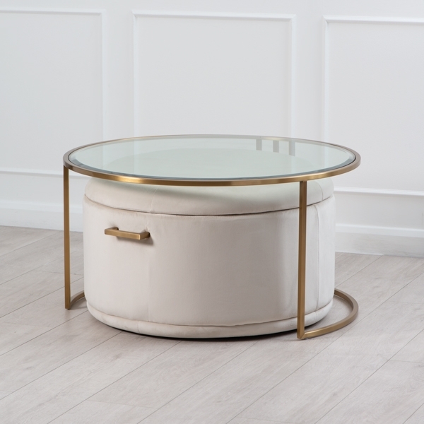 Layered coffee table and ottoman set. The ottoman can be slid out to use as a footstool, as required. Concealed castors to underside of ottoman allow for easy moving. Perfect for storing blankets, cushions, toys, magazines and general clutter. Brushed stainless steel metal work with brass finish. Tough black lining cloth.