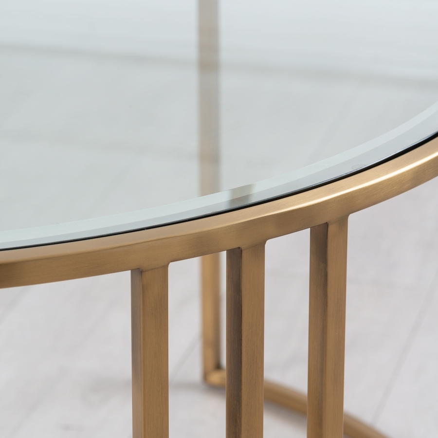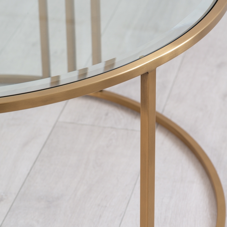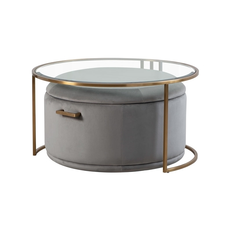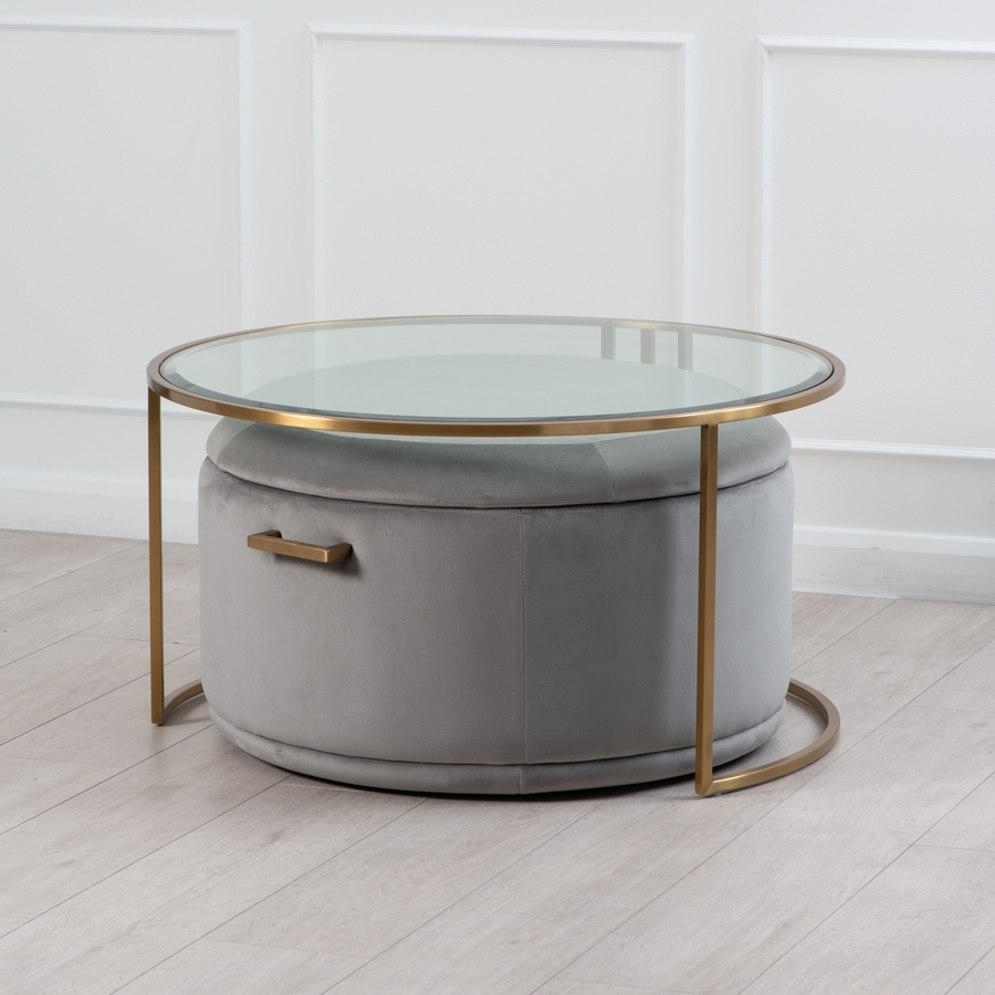 Layered coffee table and ottoman set The ottoman can be slid out to use as a footstool, as required Concealed castors to underside of ottoman allow for easy moving Perfect for storing blankets, cushions, toys, magazines and general clutter Brushed stainless steel metal work with brass finish Tough black lining cloth