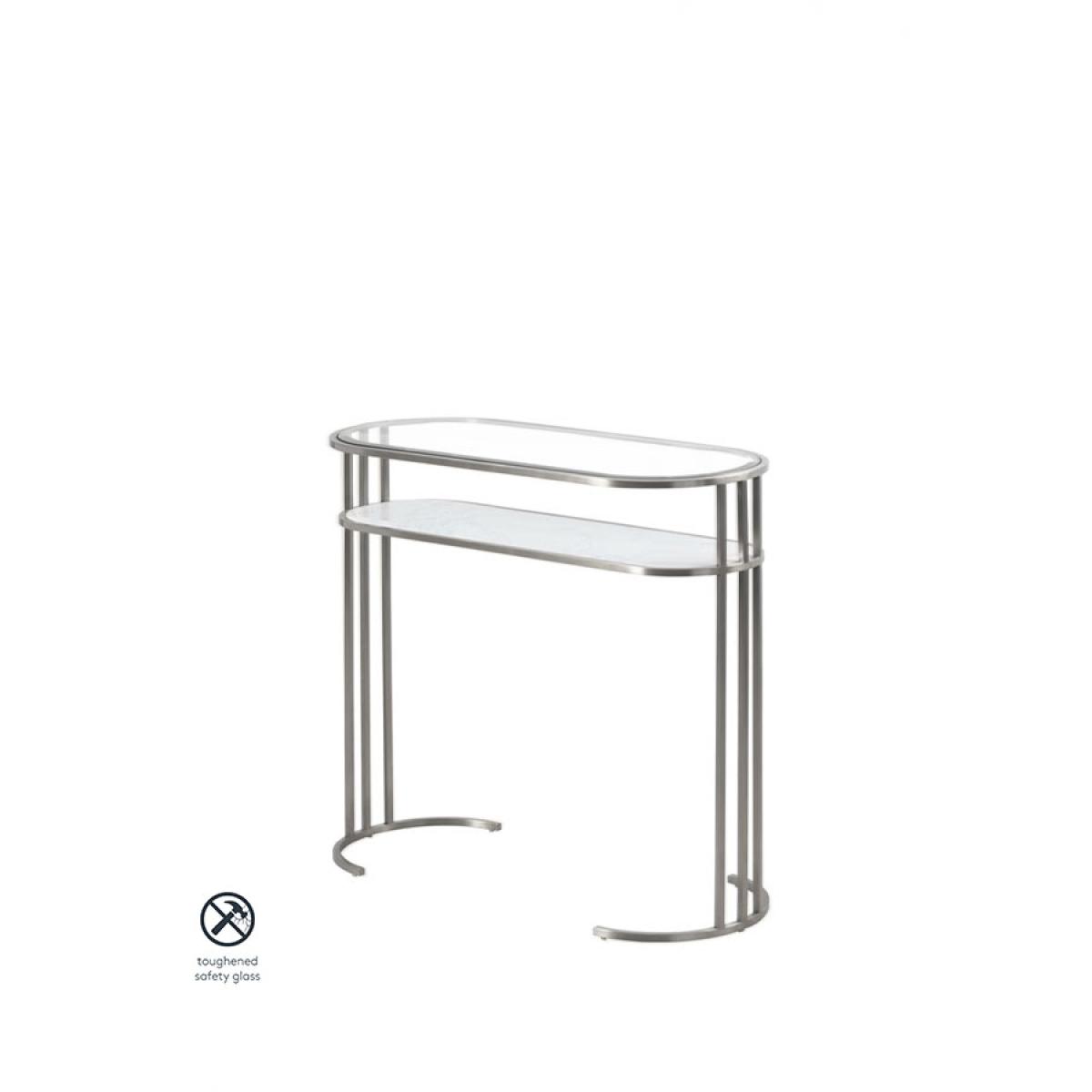 Art Deco inspired console table with distinctive streamline silhouette. Brushed stainless steel metal work. Toughened safety glass top with deep bevelled edge. Polished marble shelf with deep bevelled edge. Due to its natural formation, every piece of marble is unique; there may be subtle differences in colour, tone and composition from the image shown. On occasions, fissures may be present but these are natural characteristics and do not compromise the marble’s structural integrity. Wipe with a soft, dry cloth and avoid using chemical-based cleaners as these could damage the finish.