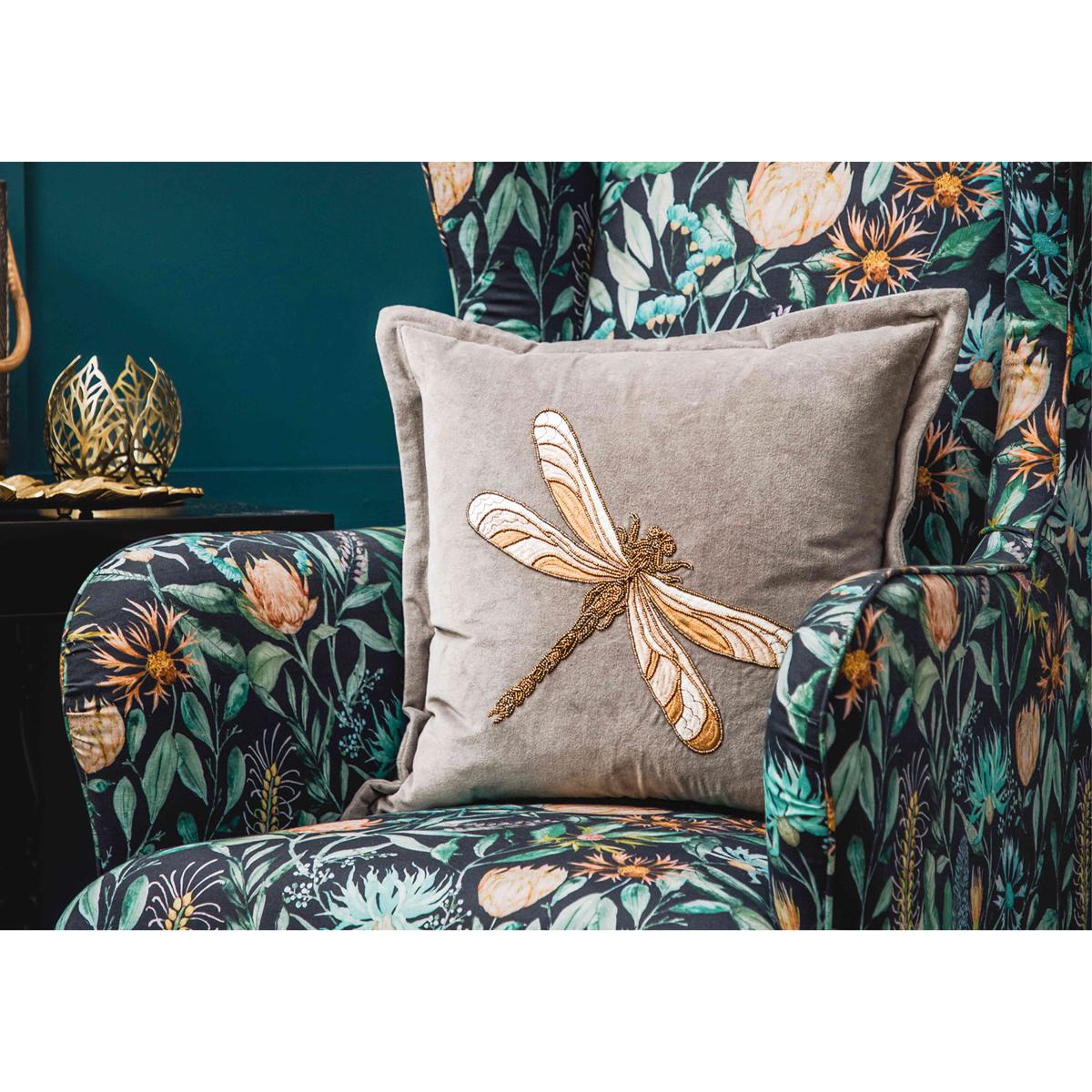 Meet Aria: the ultimate indulgence. This soft velvet cushion ensures comfort, promises style and comes in an array of stunning shades. Why you'll love it Divine dragonfly embellishment. Brings elegance to bedrooms and living spaces. It’s feather-filled so it’s luxuriously soft inside and out. Embroidered by hand. Sourced and designed in India. In a wide choice of colours to suit any decor. What you need to know 100% polyester. 100% feather filling. Zip closure for easy cleaning and filling adjustments. Indoor use only. To maintain cushion plumpness, remove cover and plump cushion interior regularly. Dimensions Height: 50 cm (20 in). Width: 50 cm (20 in).