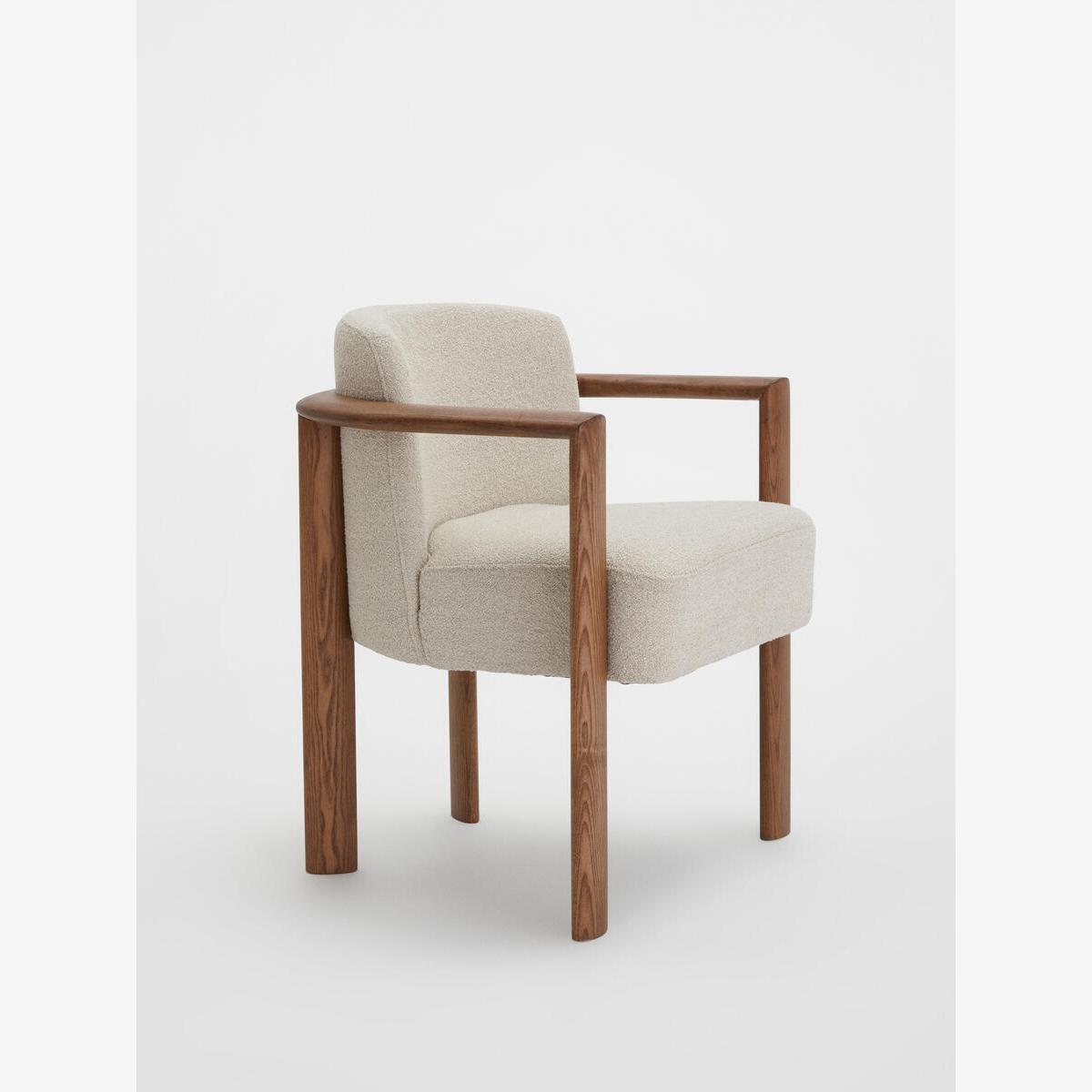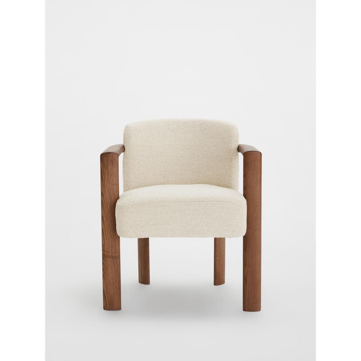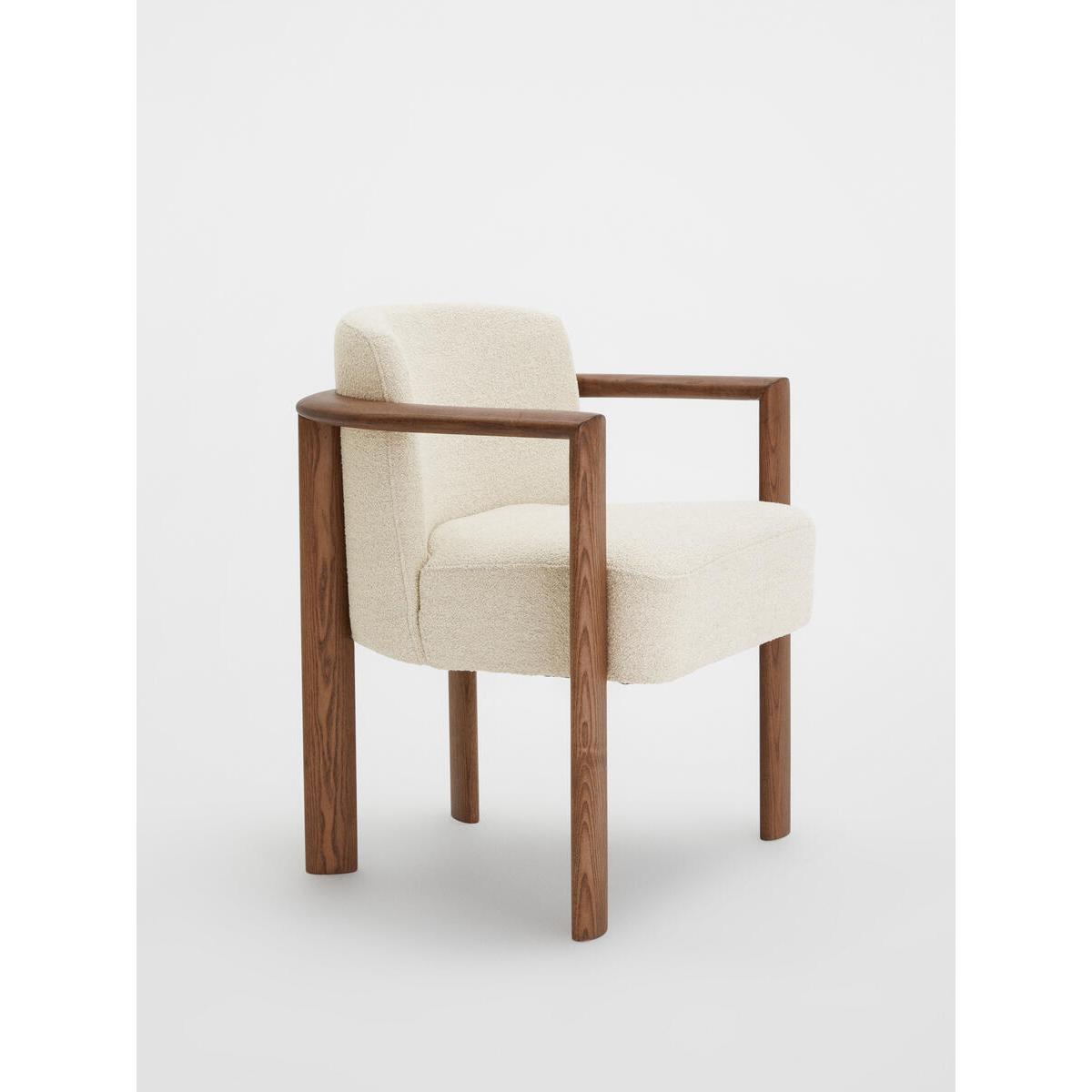 Italian craftsmanship and comfort combine with the sophisticated Aria dining chair, where a curved solid ash frame is complemented by cosy boucle upholstery. Finger joint detail and an aged mid-tone stain give this piece a lived-in feel, while taking its design cues from Soho House Rome. Ideal for those who prefer more laid-back dining and hosting. Curved dining chair Solid ash frame Upholstered in boucle Crafted in Italy Finger joint detail Aged mid-tone stain Inspired by Soho House Rome