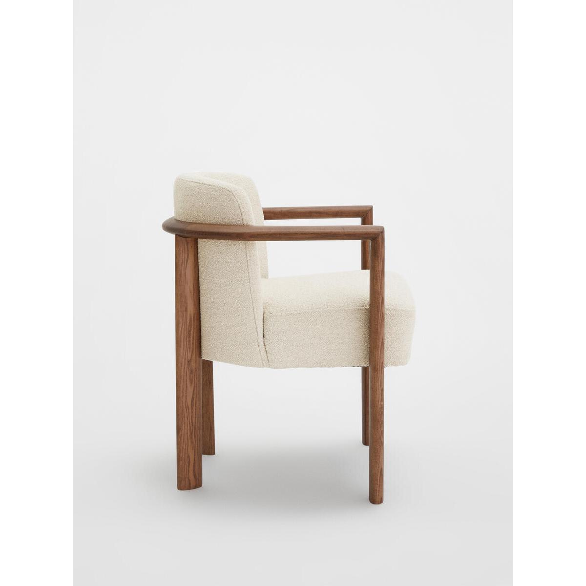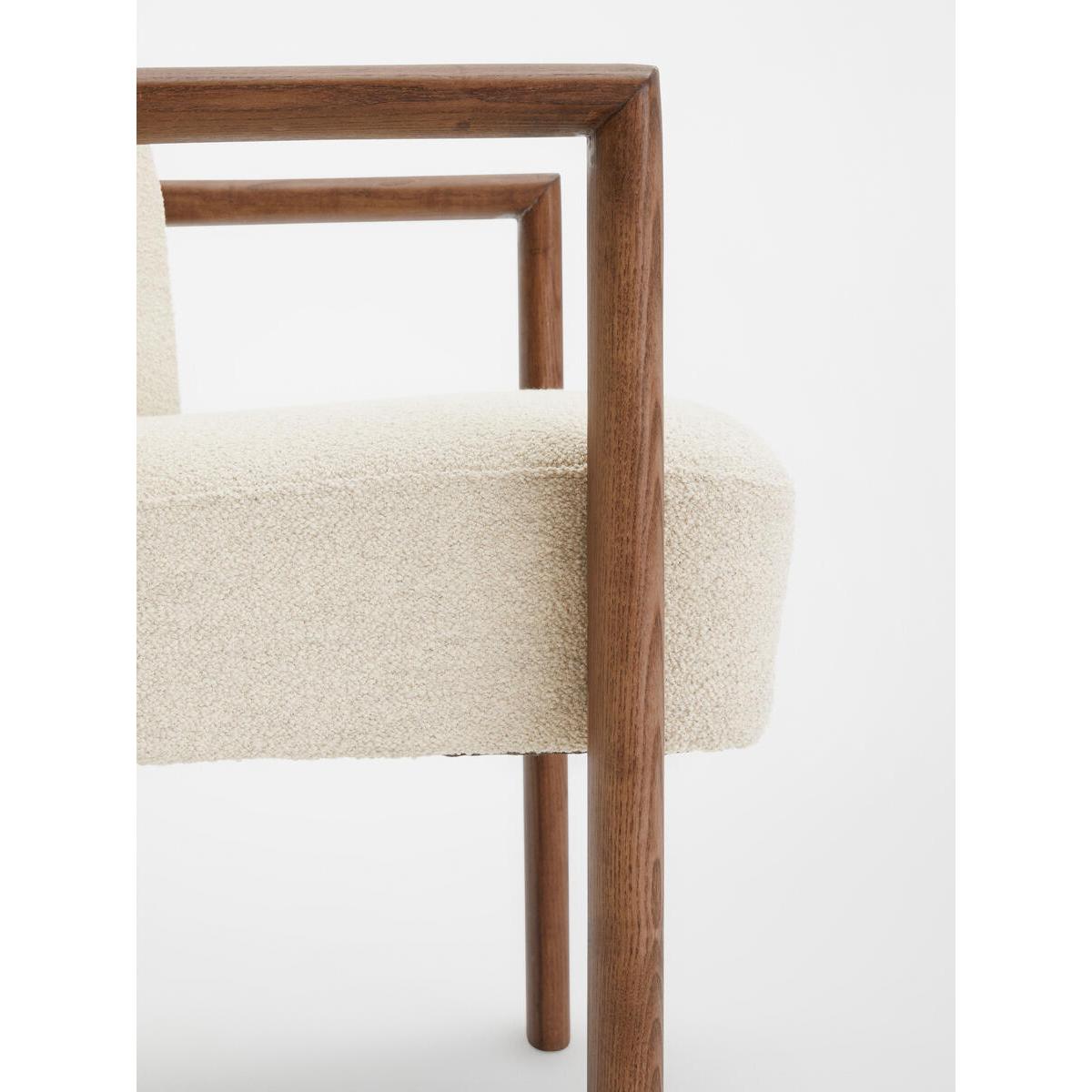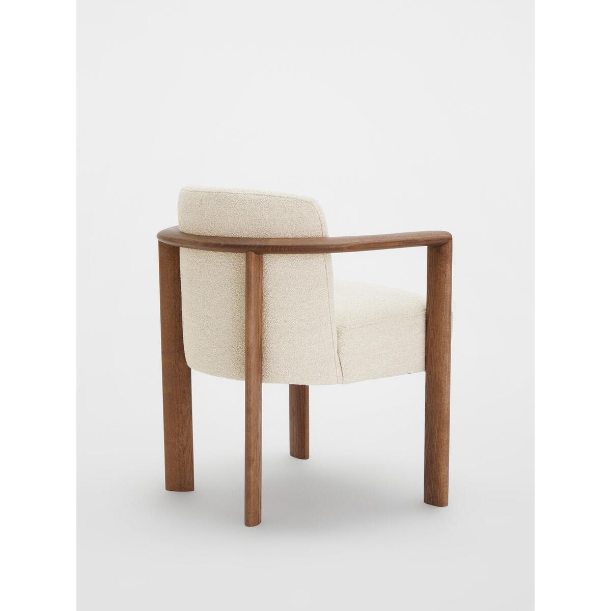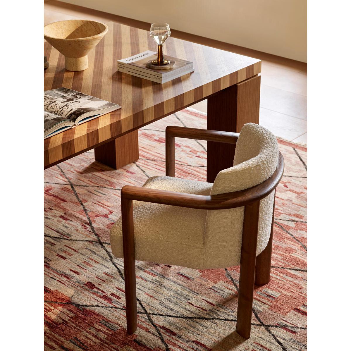 Italian craftsmanship and comfort combine with the sophisticated Aria dining chair, where a curved solid ash frame is complemented by cosy boucle upholstery. Finger joint detail and an aged mid-tone stain give this piece a lived-in feel, while taking its design cues from Soho House Rome. Ideal for those who prefer more laid-back dining and hosting. Curved dining chair Solid ash frame Upholstered in boucle Crafted in Italy Finger joint detail Aged mid-tone stain Inspired by Soho House Rome