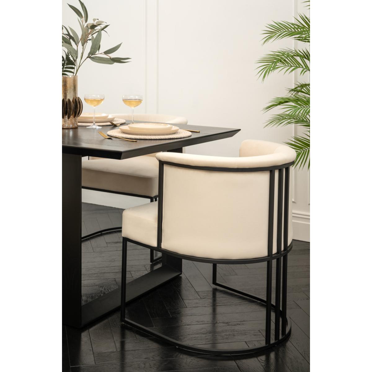 Art Deco inspired dining chair with a distinctive streamline silhouette. Black powder-coated steel frame. Velvet upholstery fabric.