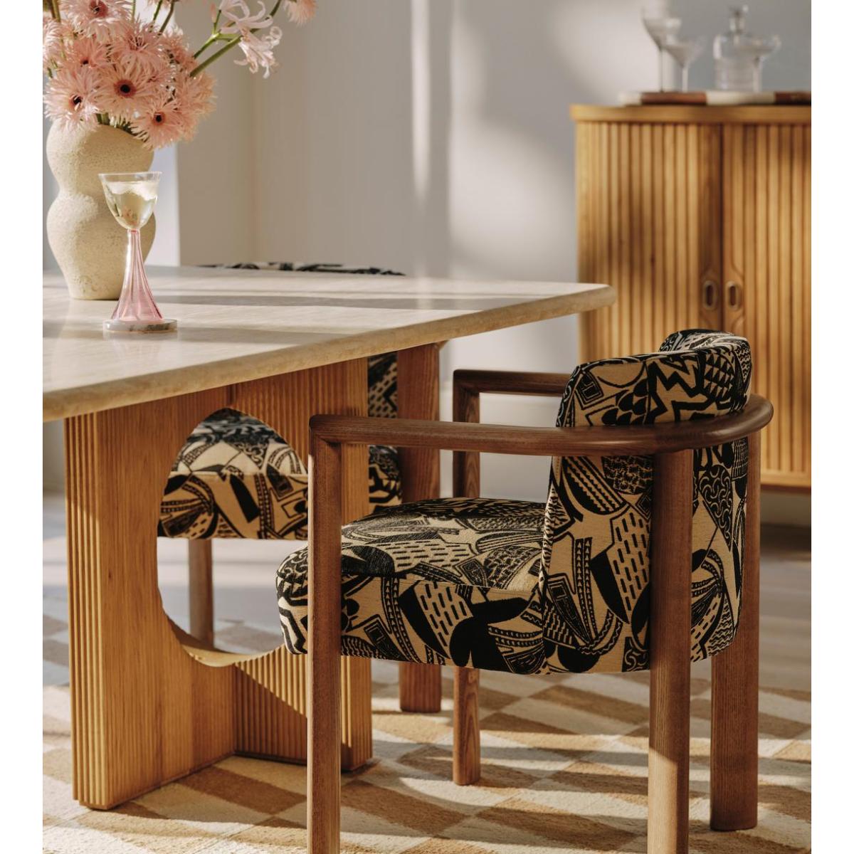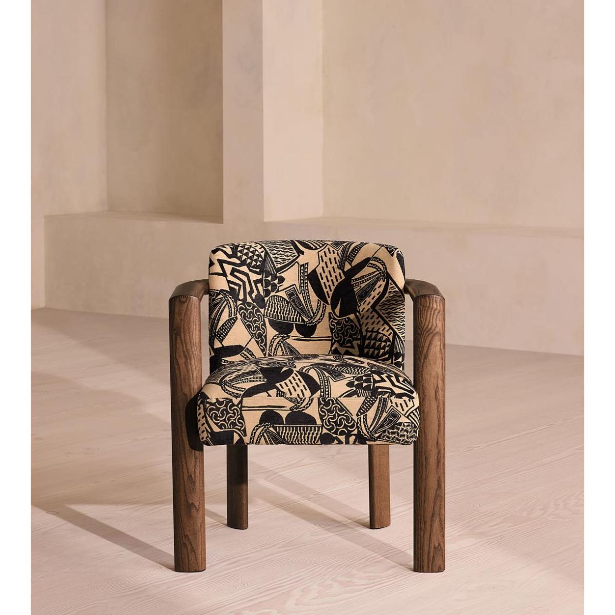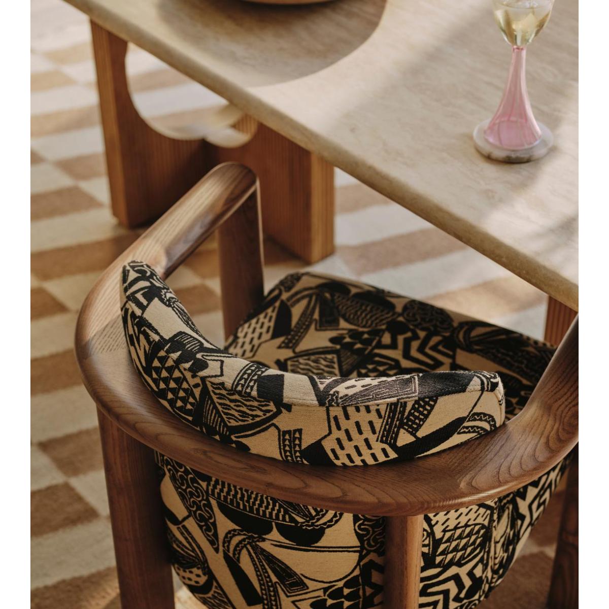 Italian craftsmanship creates a comfortable, curved ash frame and abstract jacquard upholstery. The curved, solid ash frame of our Aria dining chair is perfectly complemented by the bold, monochromatic hues of its jacquard upholstery. Taking design cues from the relaxed social spaces of Soho House Rome, an aged, mid-tone stain gives this piece a lived-in feel. Ideal for those that prefer laid-back dining and hosting.