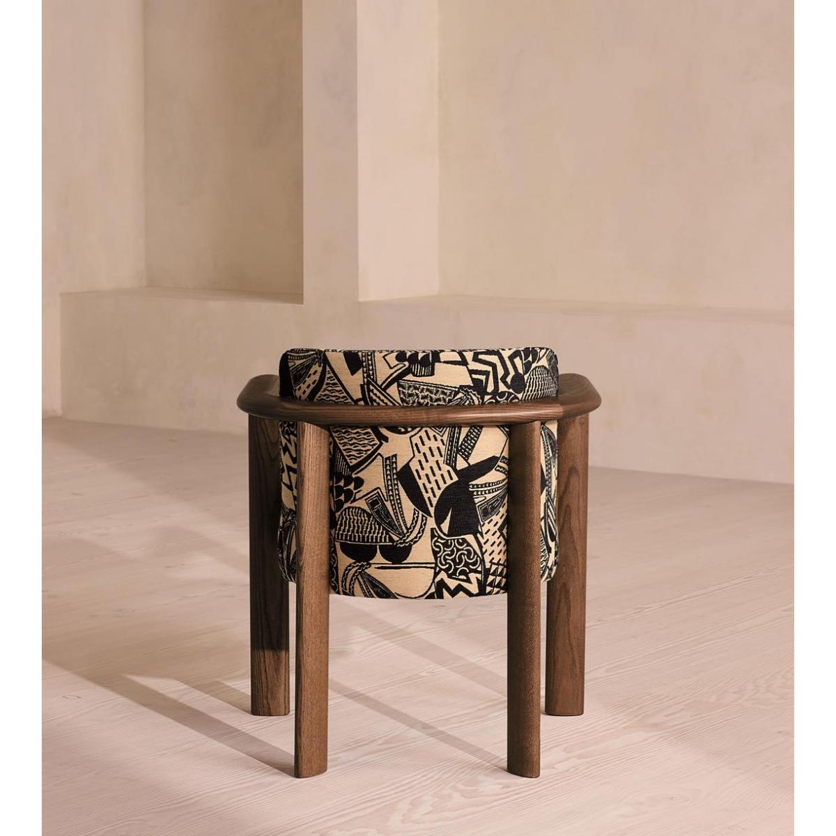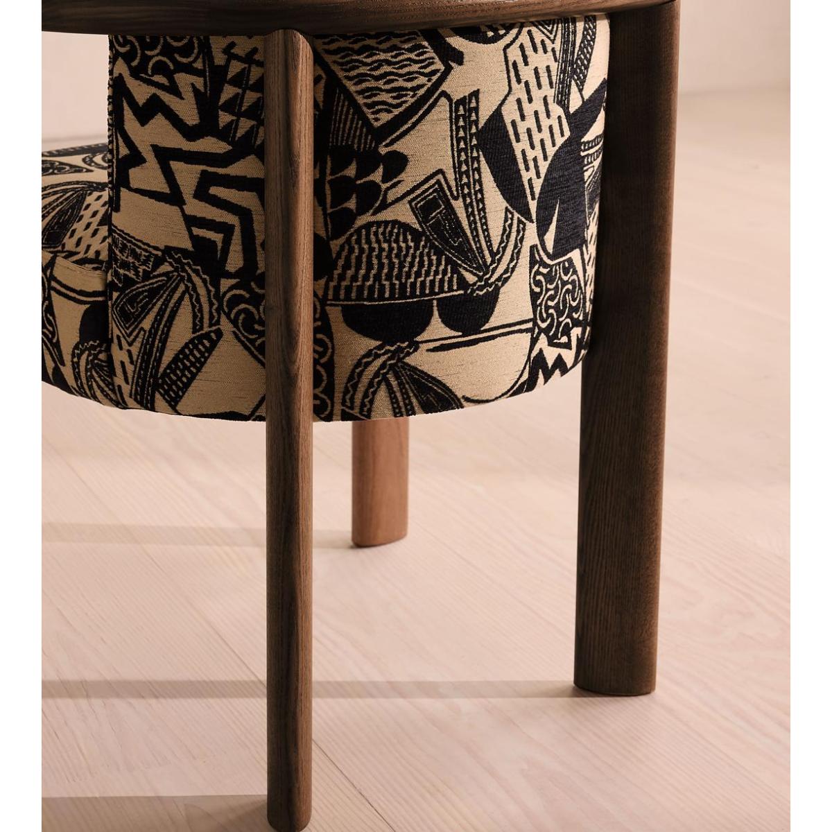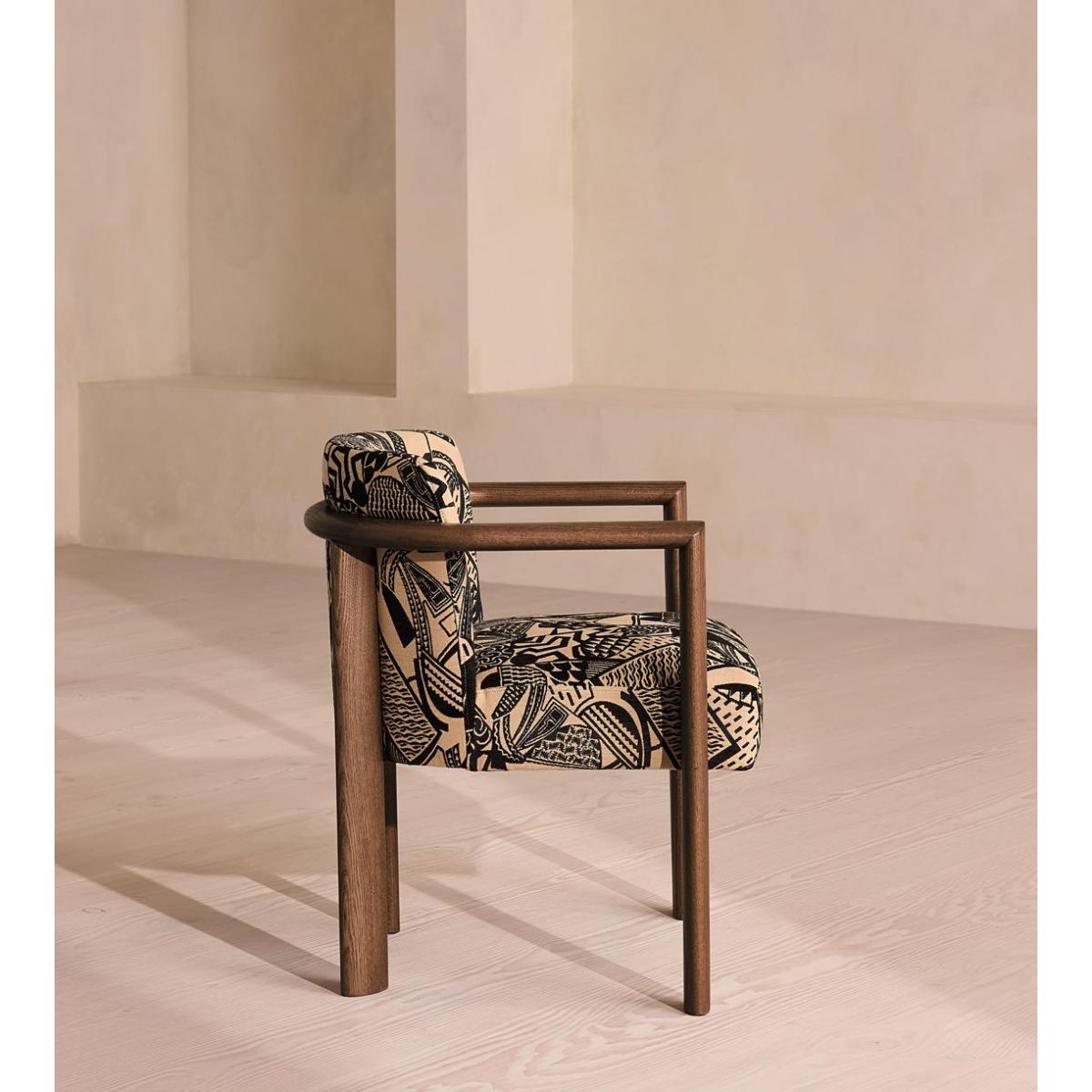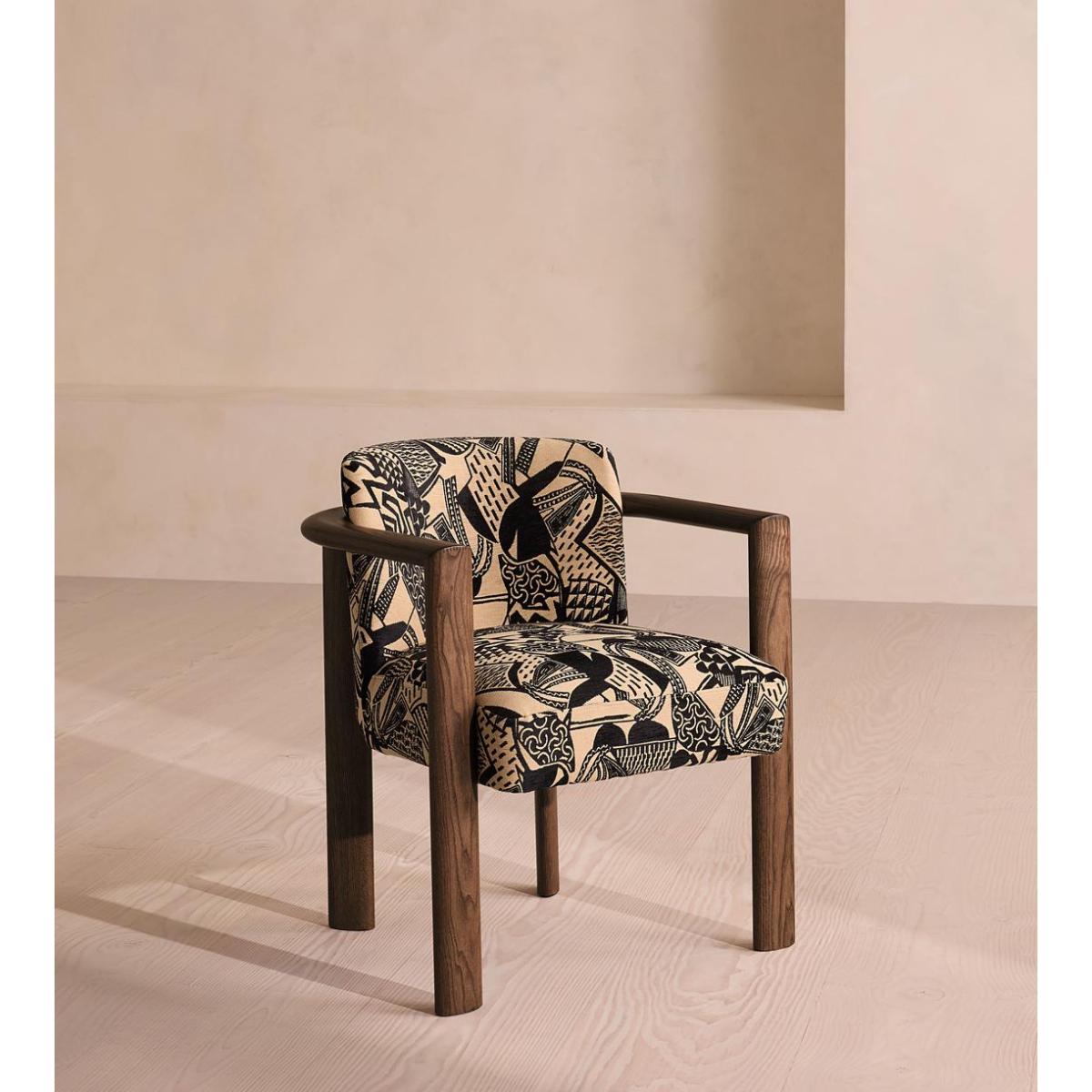 Italian craftsmanship creates a comfortable, curved ash frame and abstract jacquard upholstery. The curved, solid ash frame of our Aria dining chair is perfectly complemented by the bold, monochromatic hues of its jacquard upholstery. Taking design cues from the relaxed social spaces of Soho House Rome, an aged, mid-tone stain gives this piece a lived-in feel. Ideal for those that prefer laid-back dining and hosting.