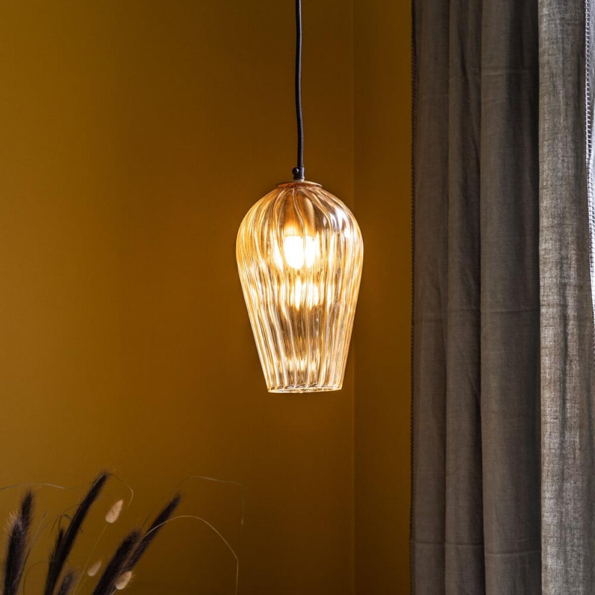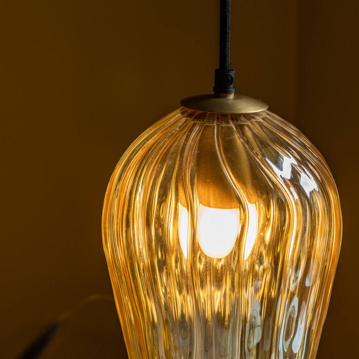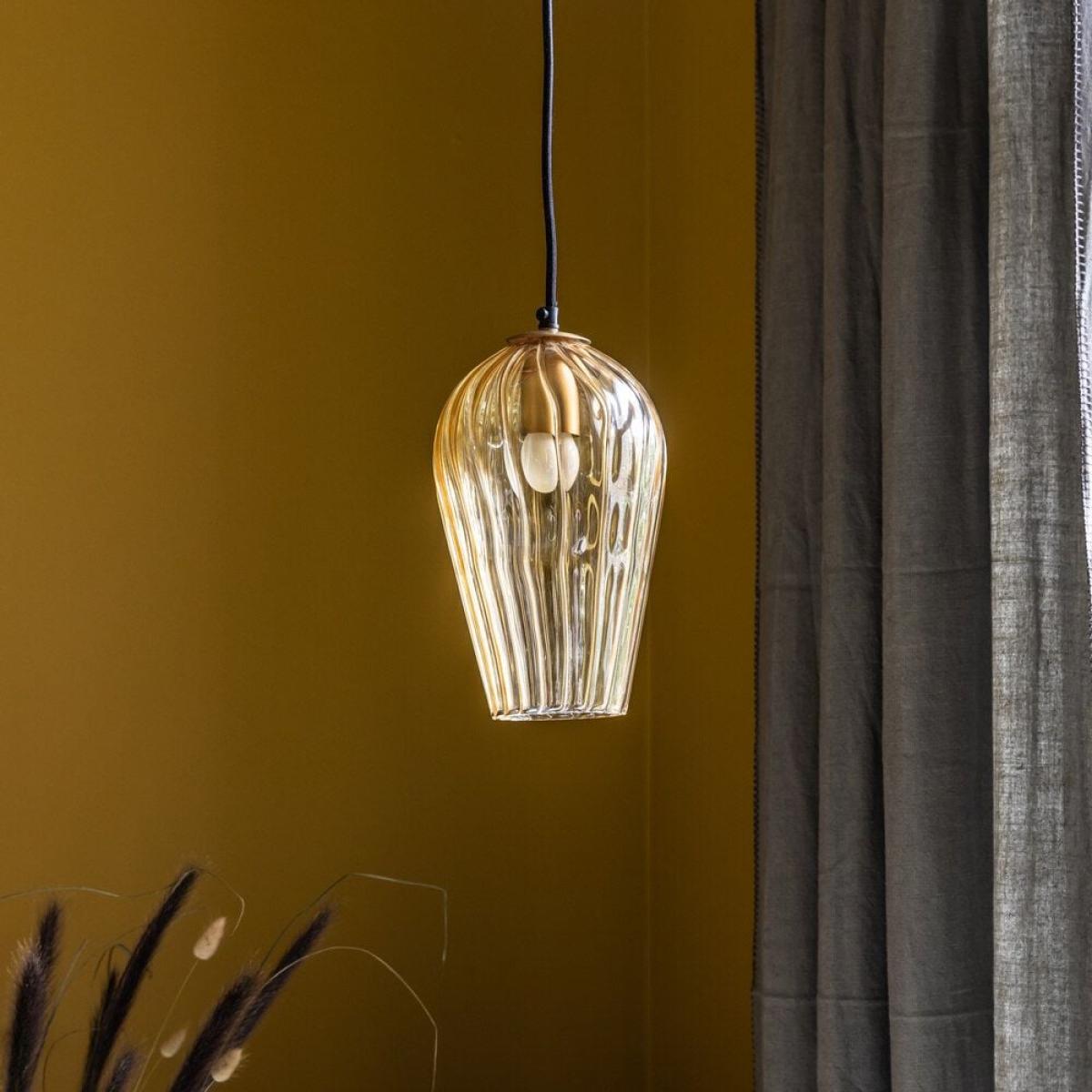 Chic and simple but oh so sophisticated, our Aria Glass Pendant Light captures the trend for coloured glass beautifully with its golden lustre glass shade, fluted for added detail. Expertly hand blown, this small and compact shade is neat and understated with an antique and vintage look and feel. Finished with a brass top and bulb holder, this piece adds instant glamour to any room.