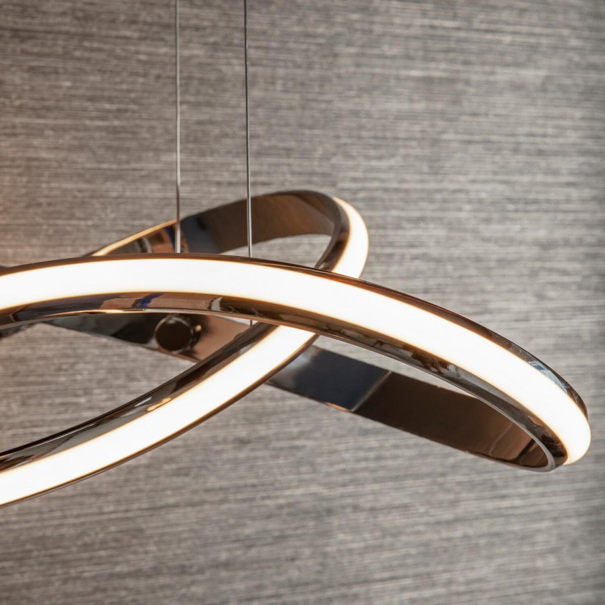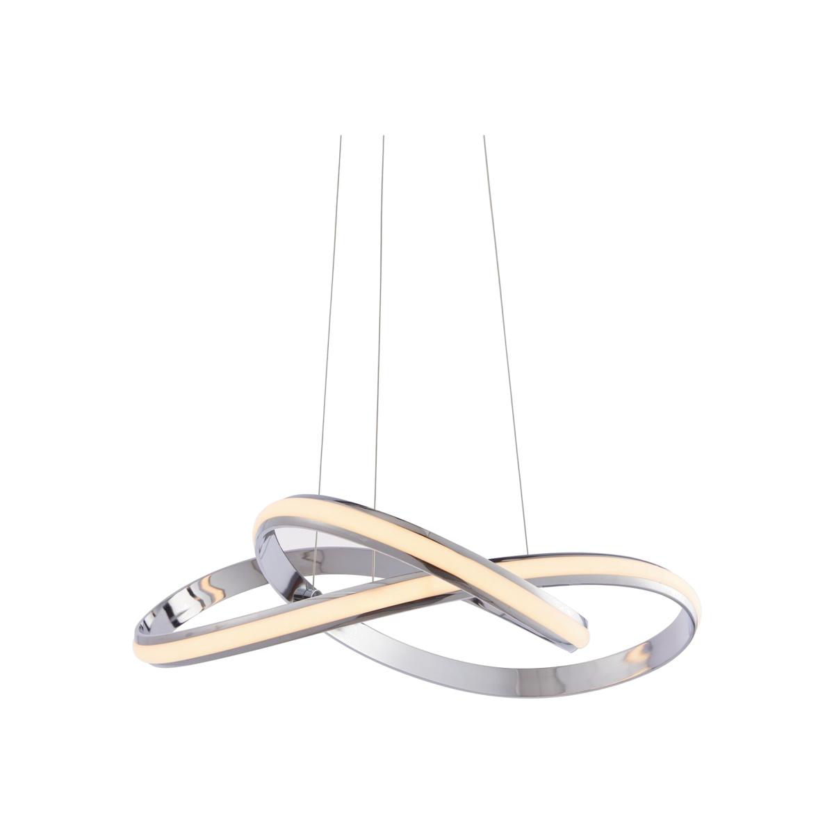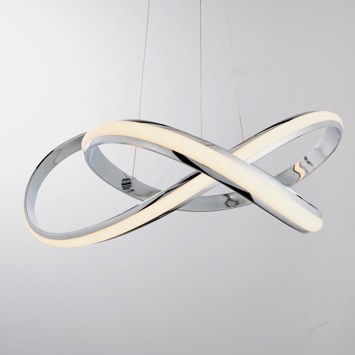 A unique contemporary ceiling pendant with flowing illuminated curves, height adjustable, suspended from thin wire cables creating an amazing designer look for modern interiors. Chrome plated finish with white diffuser and Integrated LED.