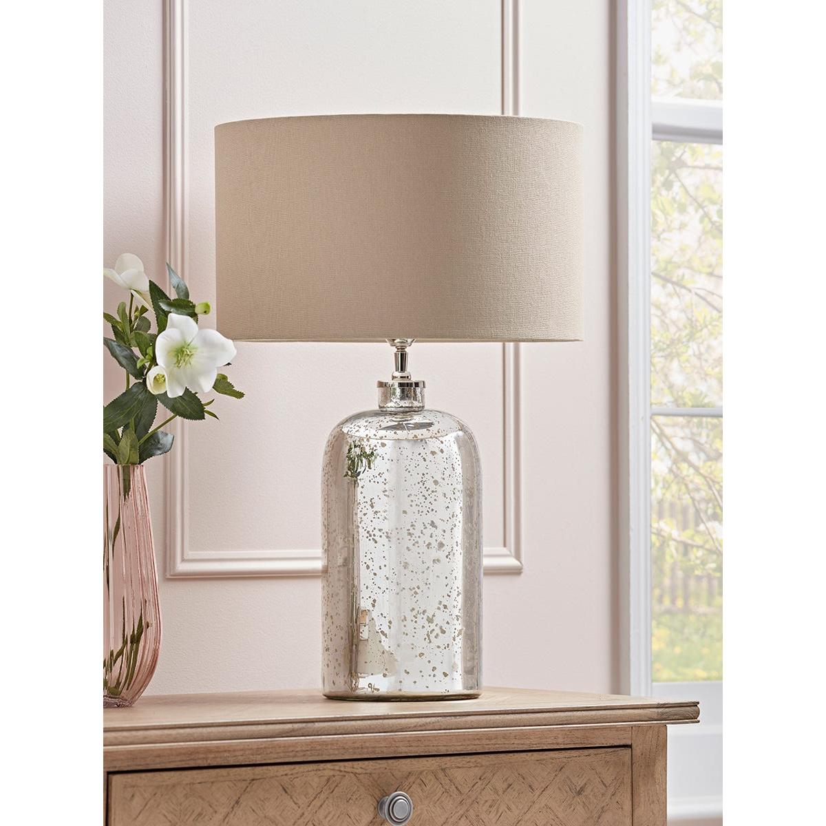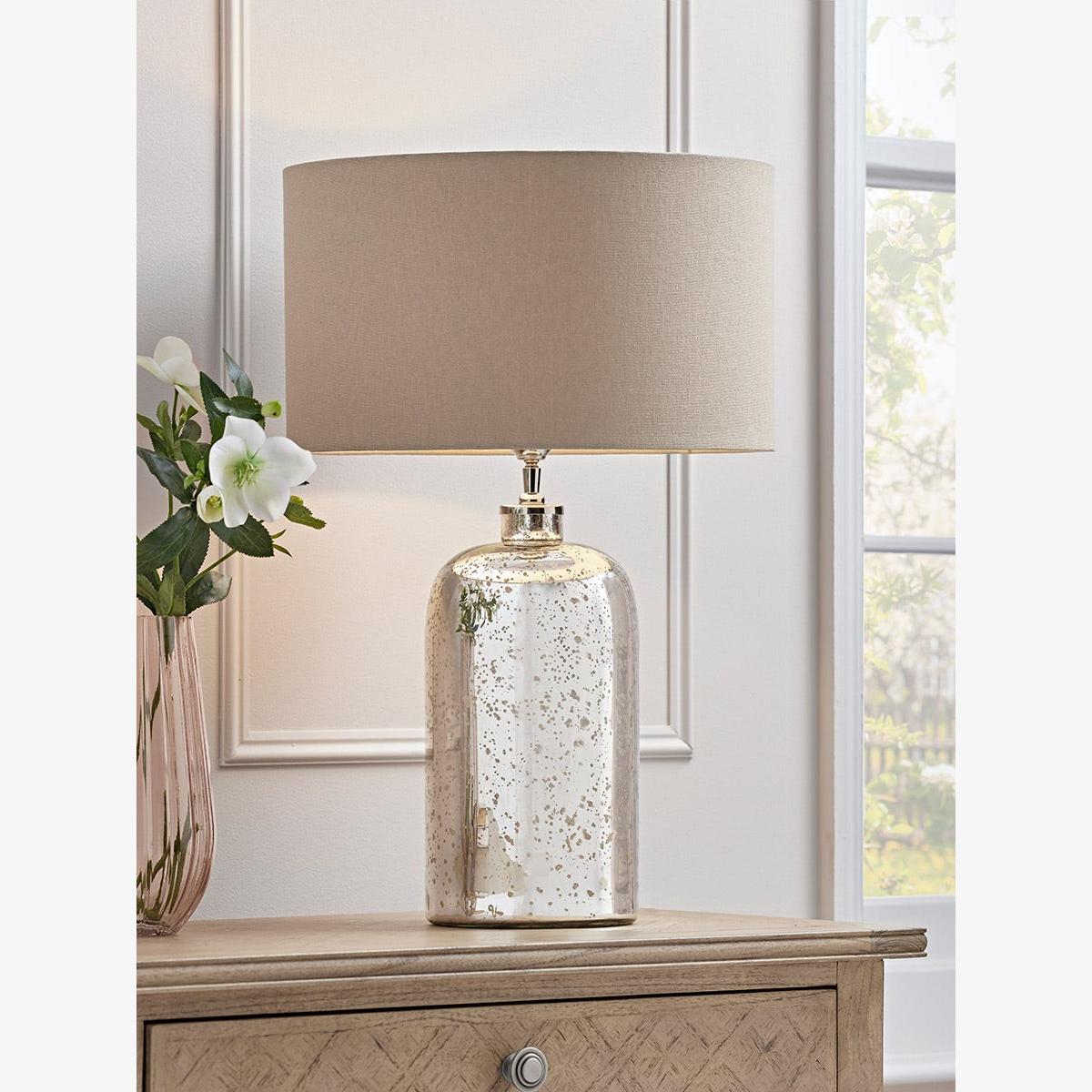 This glamourous lamp is perfect for adding a touch of elegance to both contemporary and traditional interiors. Its large size makes it an ideal statement piece for a sideboard, console, or bedside table, bringing a sense of sophistication and visual interest. The mercury glass base adds a subtle reflective quality that works well in rooms with metallic accents or neutral palettes, while the neutral shade ensures versatility. For styling, consider pairing it with textured or layered textiles to maximise its luxe appeal, and keep surrounding accessories minimal to allow the lamp to be a true focal point. It's a practical choice that effortlessly combines style and function, elevating the overall look of any room.