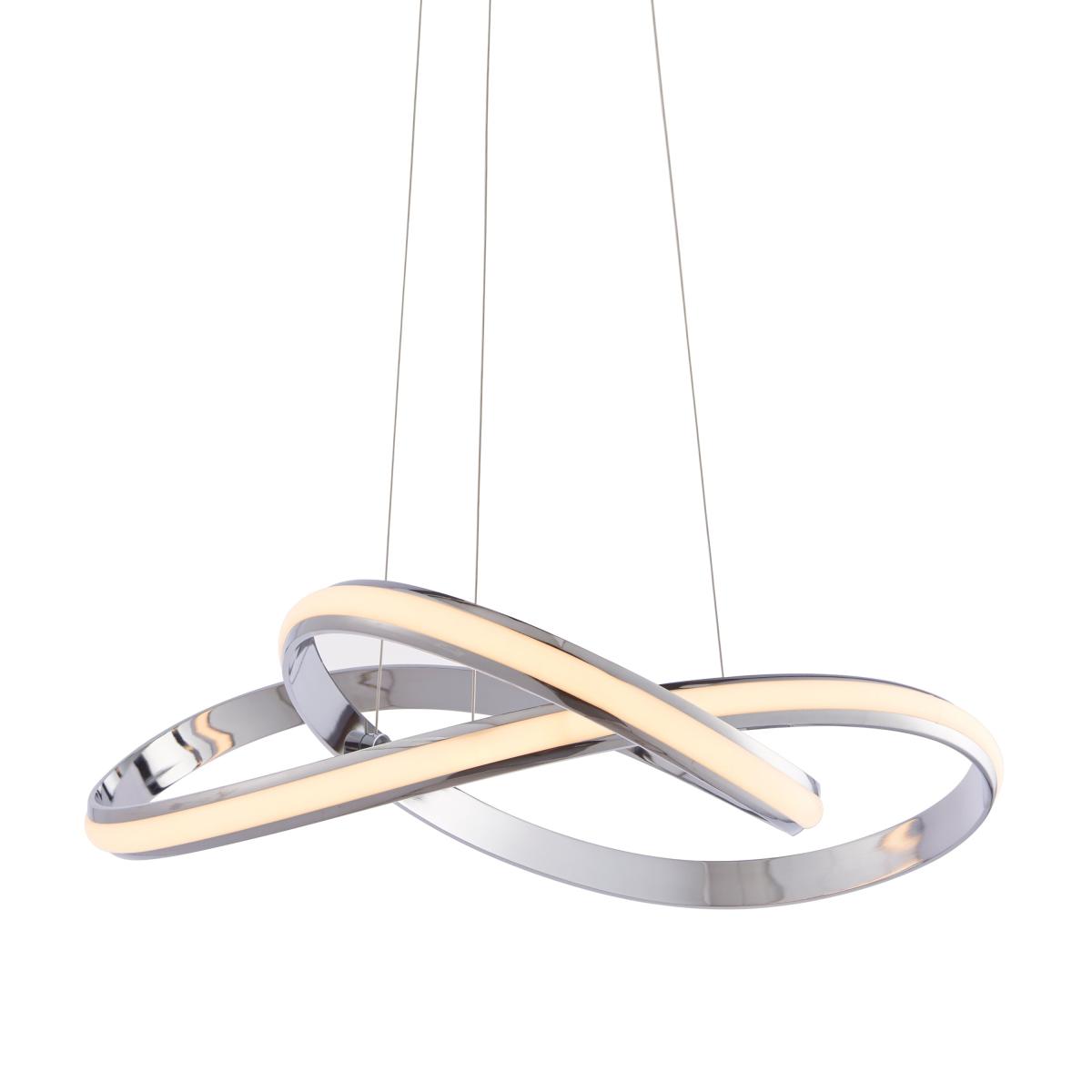 A unique contemporary ceiling pendant with flowing illuminated curves, height adjustable, suspended from thin wire cables creating an amazing designer look for modern interiors. Chrome plated finish with white diffuser and Integrated LED.