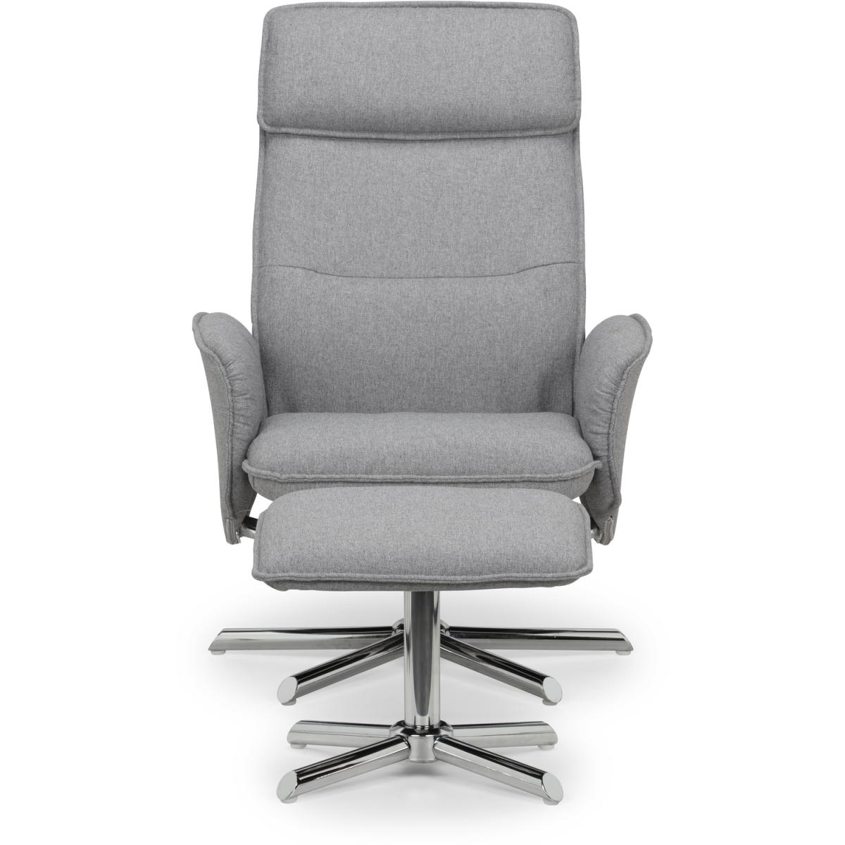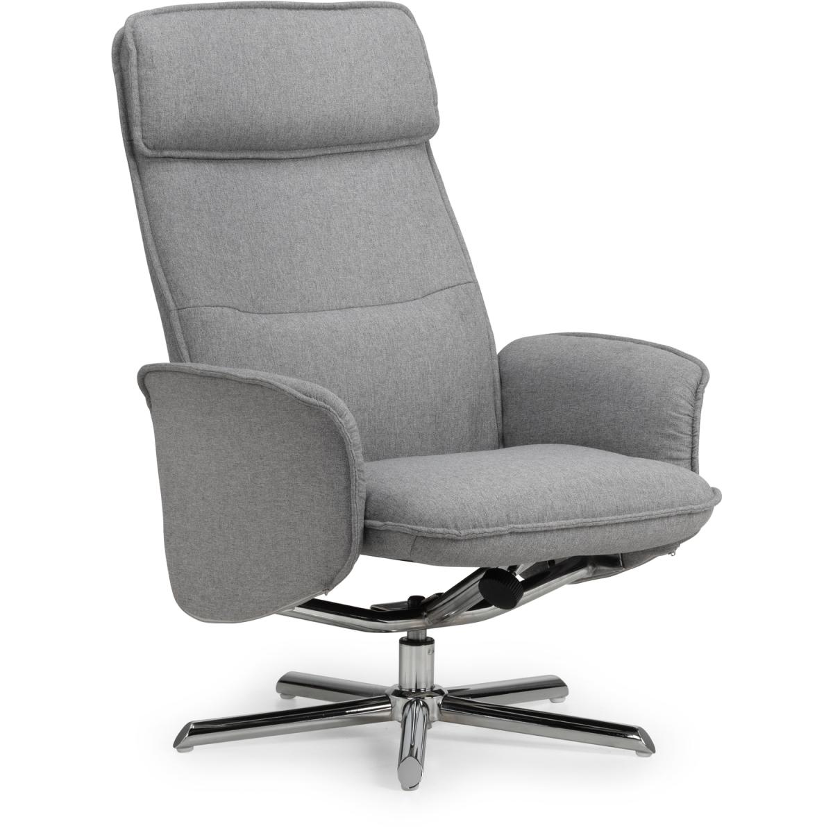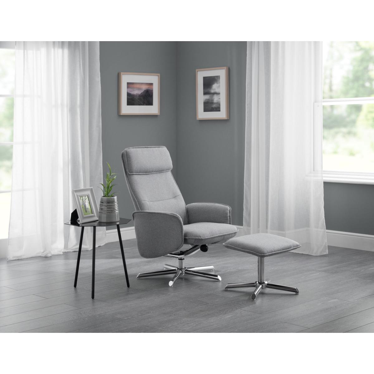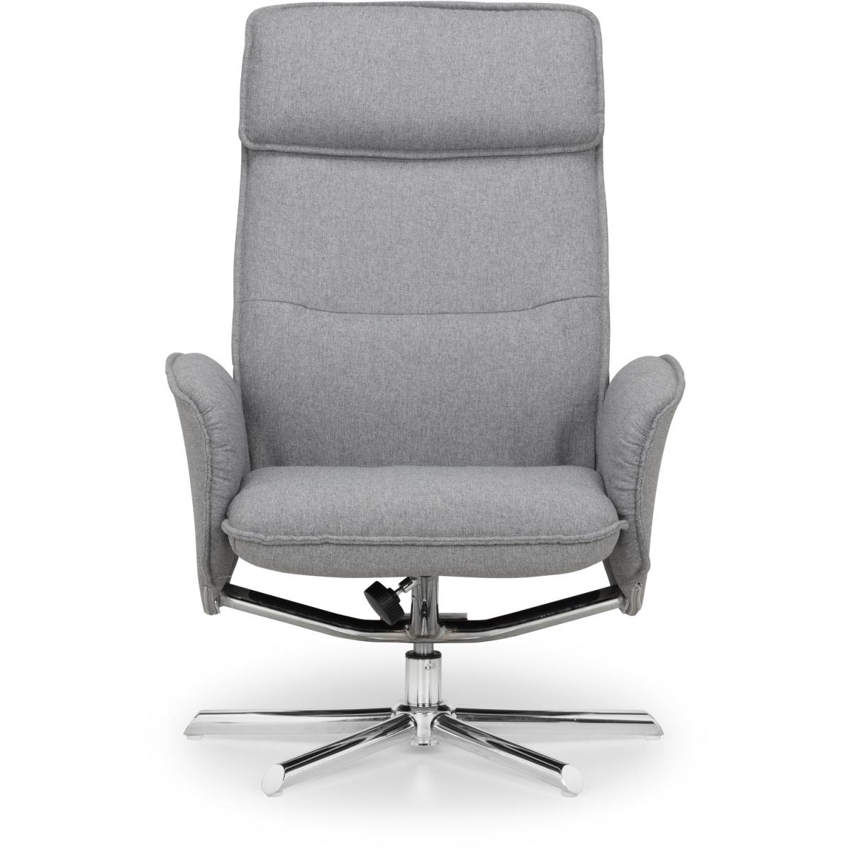The Aria Recliner is beautifully upholstered in grey linen fabric with a stunning chrome base. Featuring a padded headrest and footstool to provide utmost comfort, this modern chair is suitable for a wide range of decor. Not only does this chair recline, but it also swivels allowing you to reach your preferred position at ease.