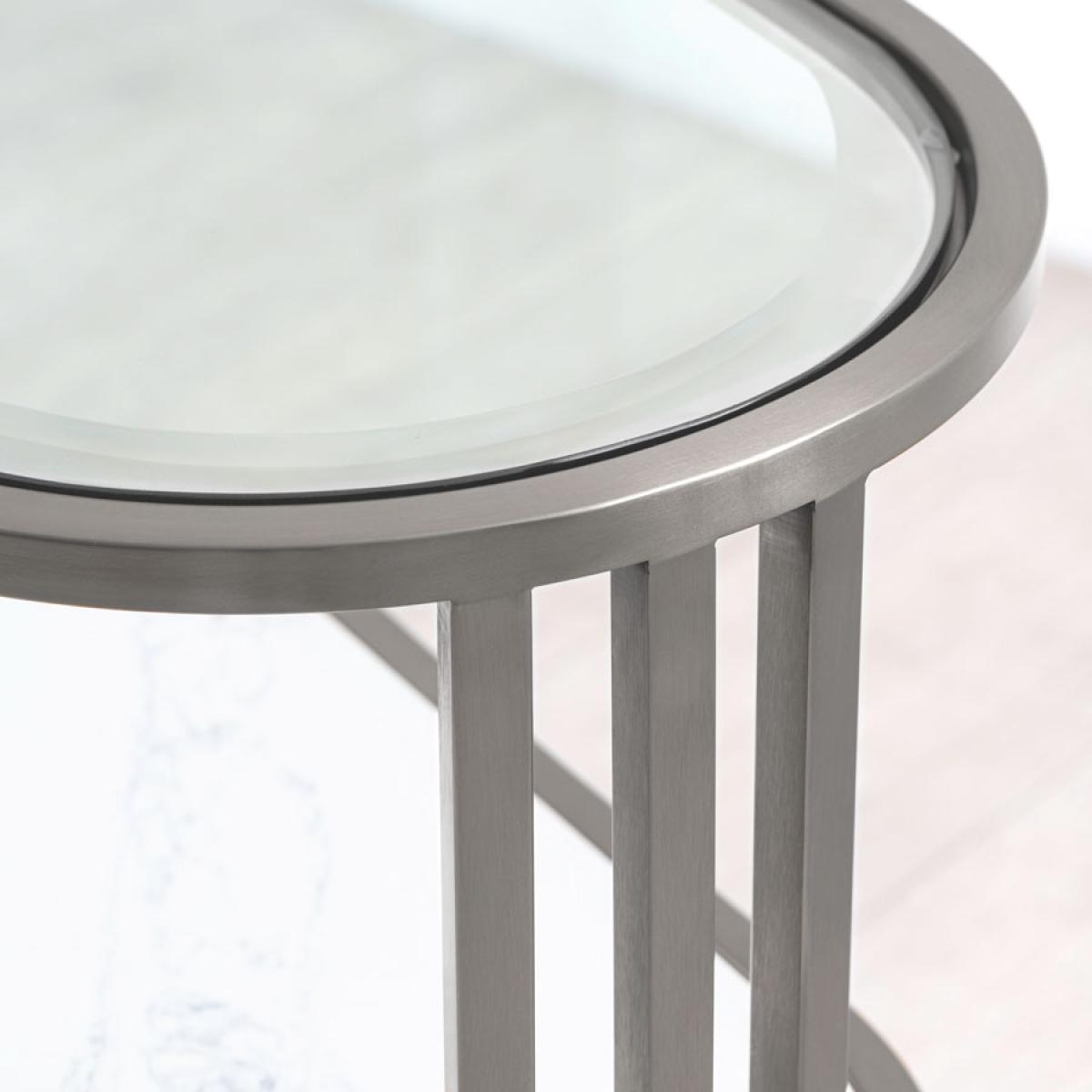 Art Deco inspired side table with distinctive streamline silhouette. Brushed stainless steel metal work. Toughened safety glass top with deep bevelled edge. Polished marble shelf with deep bevelled edge. Due to its natural formation, every piece of marble is unique; there may be subtle differences in colour, tone and composition from the image shown. On occasions, fissures may be present but these are natural characteristics and do not compromise the marble’s structural integrity. Wipe with a soft, dry cloth and avoid using chemical-based cleaners as these could damage the finish.