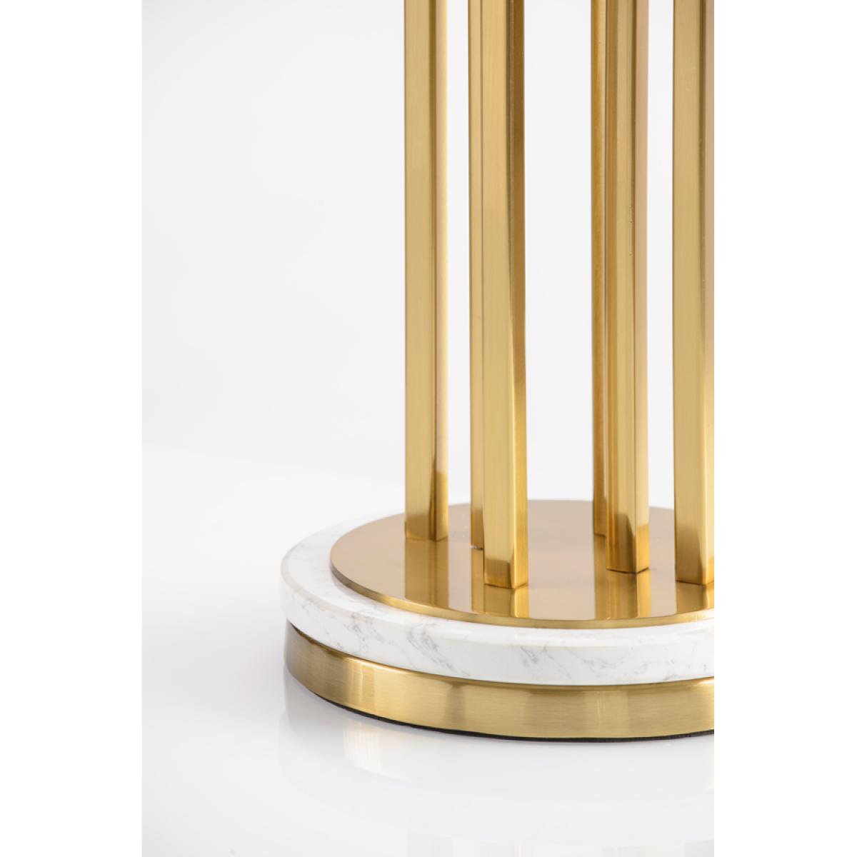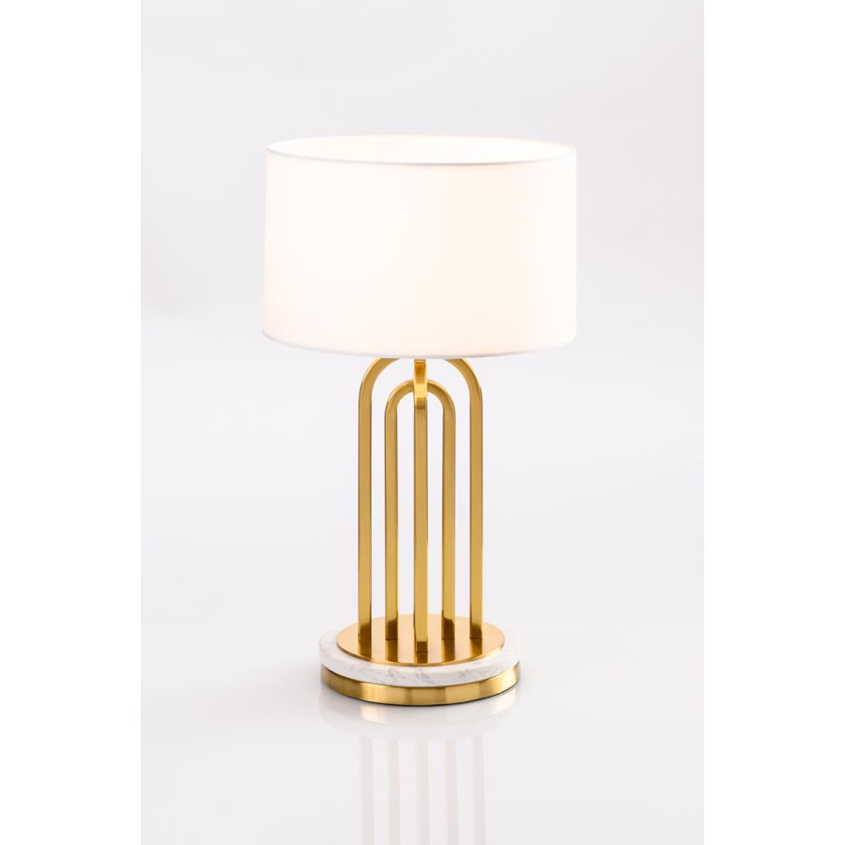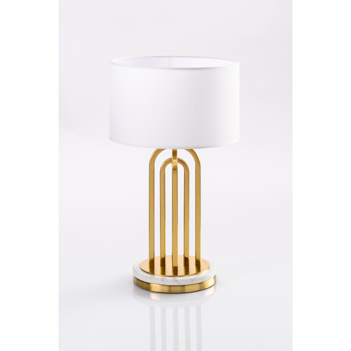 Art Deco inspired table light with distinctive streamlined silhouette. Stainless steel with brushed brass finish. Polished marble detail with deep bevelled edge. Polycotton shade in white. Supplied with a G50 E27 non dimmable bulb. Due to its natural formation every piece of marble is unique. There may be subtle differences in colour, tone and composition from the image shown. On occasions fissures may be present, these are natural characteristics and do not compromise the marble’s structural integrity. Wipe with a soft, dry cloth. Avoid using chemical-based cleaners as these could damage the finish.