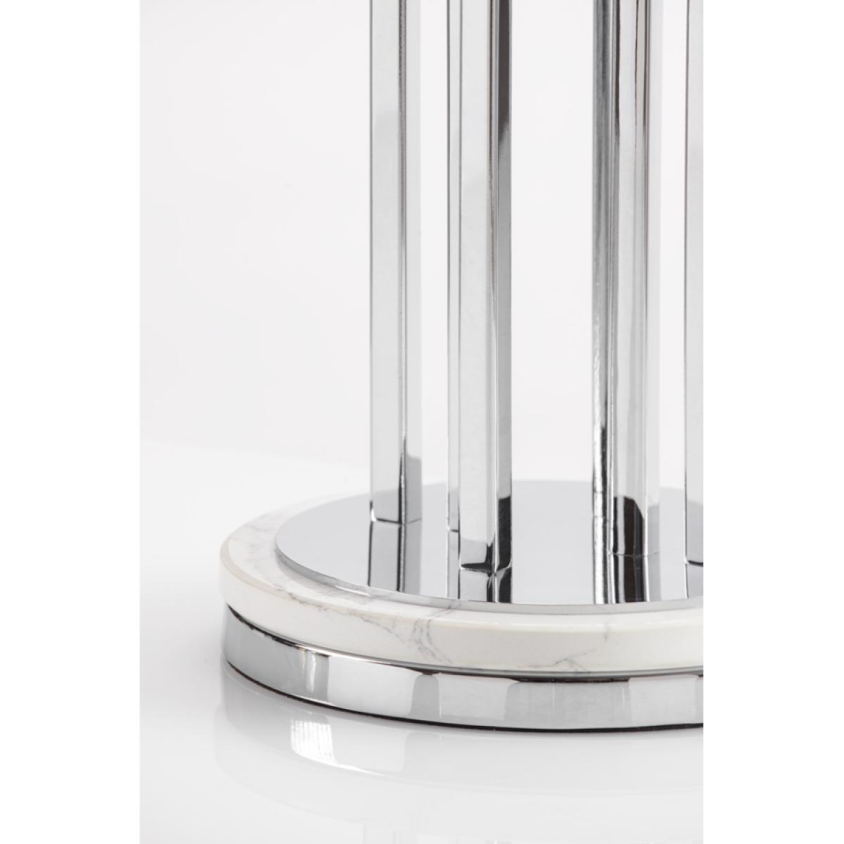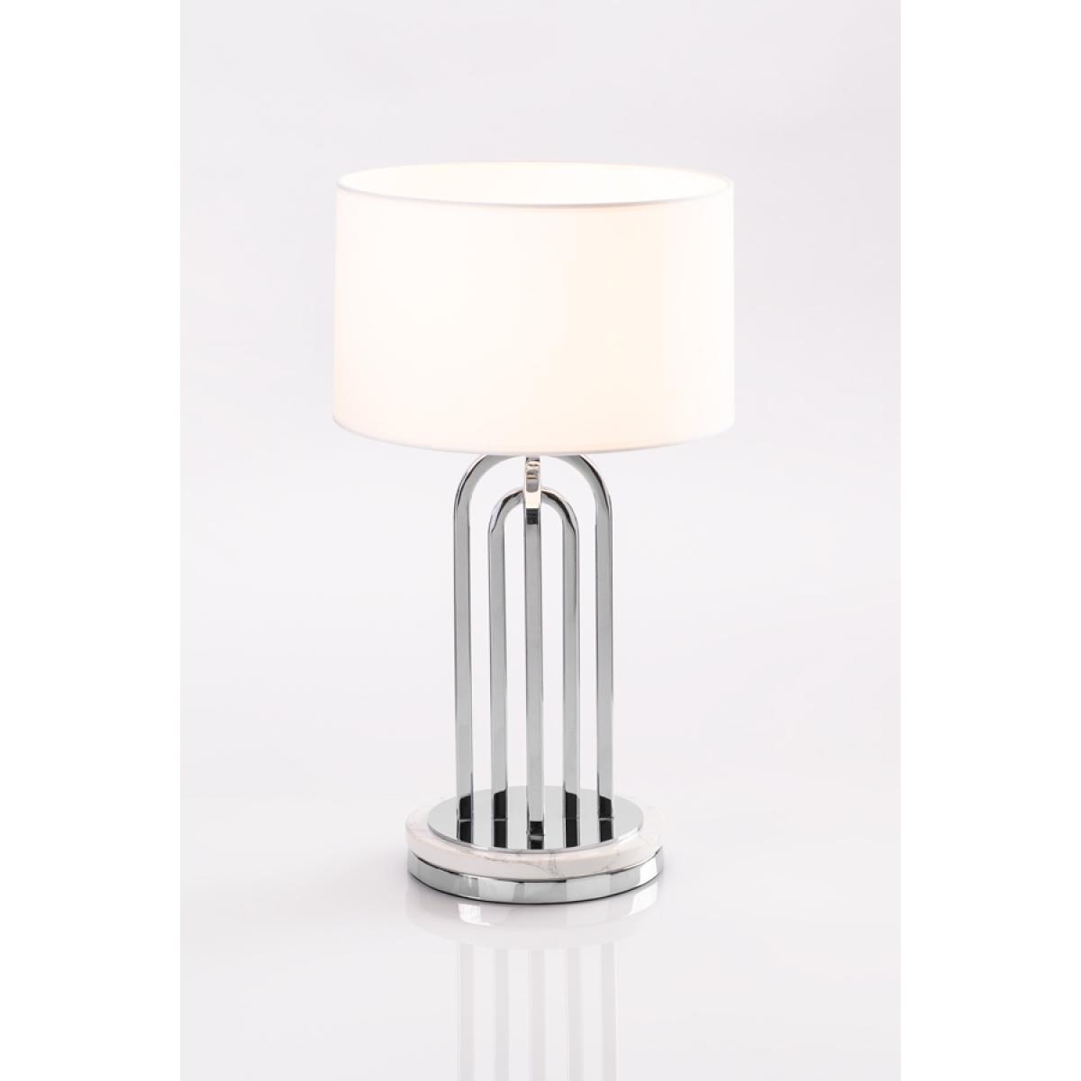 Art Deco inspired table light with distinctive streamlined silhouette. Stainless steel with polished chrome finish. Polished marble detail with deep bevelled edge. Polycotton shade in white. Supplied with a G50 E27 non dimmable bulb. Due to its natural formation every piece of marble is unique. There may be subtle differences in colour, tone and composition from the image shown. On occasions fissures may be present, these are natural characteristics and do not compromise the marble’s structural integrity. Wipe with a soft, dry cloth. Avoid using chemical-based cleaners as these could damage the finish.
