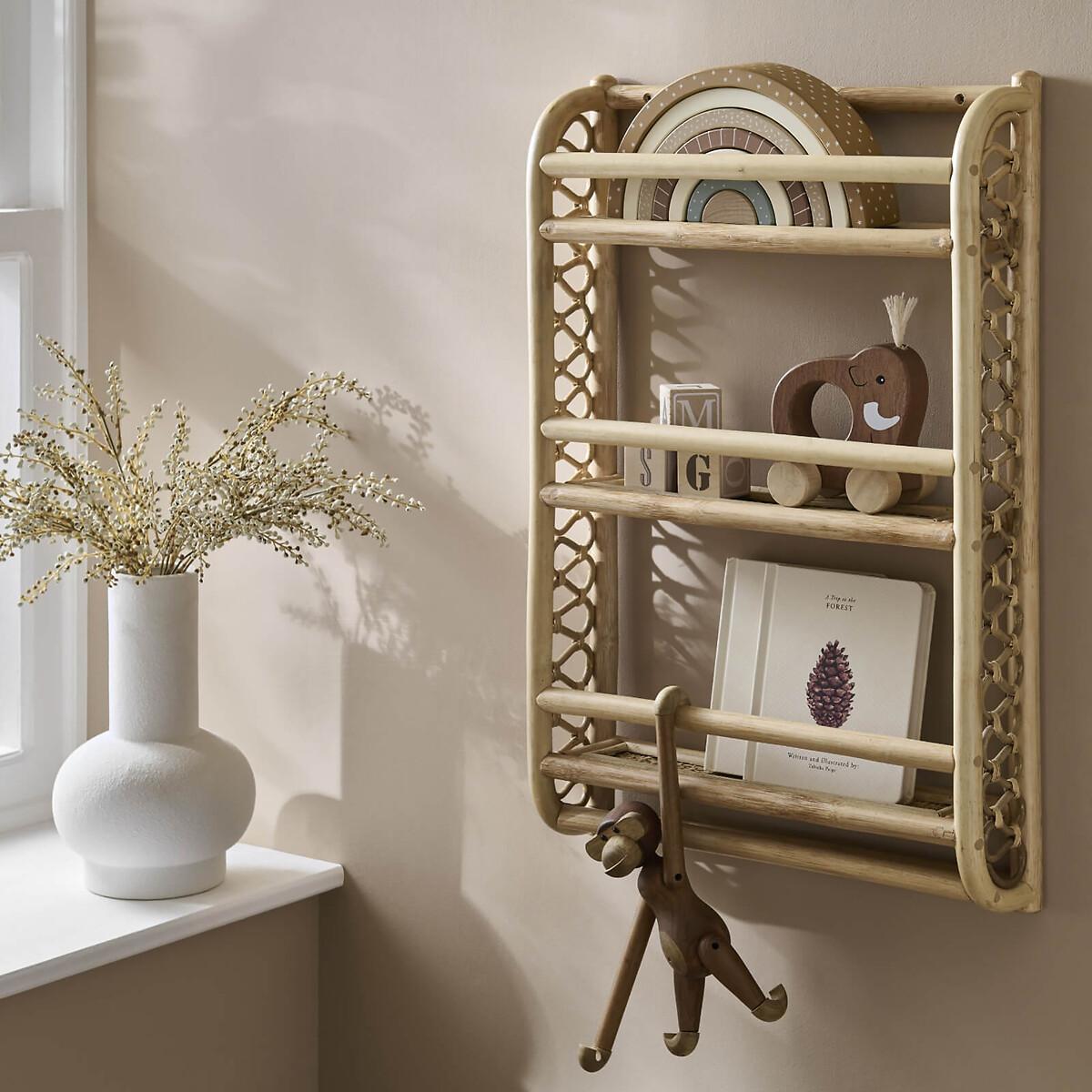 The Aria Wave Rattan Bookshelf is a stylish storage solution for your little one’s bedroom or nursery. Perfect for keeping their favourite story books neat and tidy or displaying their most-loved soft toys. Also comes with a hanging rail at the bottom, ideal for getting their outfits ready.• Wall fixings are not supplied. Ensure the fixings chosen are suitable for your wall material.• Do not hang the bookshelf over a cot or cot bed.• Each shelf has a maximum weight limit of 4kg.• The rail has a maximum weight limit of 3kg.• We provide a 2-year warranty against manufacturing defects. The warranty period is effective from the day of purchase.• Never use furniture polish to clean the furniture. Use a duster or damp cloth to remove stubborn stains. Always dry afterwards. Wipe clean with a soft cloth dampened in water and a mild soapy solution. Wipe dry with a clean and dry cloth. Suitable for indoor use. The natural materials used to craft this product may change colour and develop character over time. Items are handmade with natural materials so sizes and shape may vary. Product Dimensions:40x 10x 60cm1.4kg. Rattan, Plywood, Screw, Nails, Glue, Clear coating. One Size. Please note: this product cannot be delivered to Northern Ireland. This product will be dispatched by one of our trusted suppliers. You’ll be contacted by their selected courier about your delivery. CUDDL01