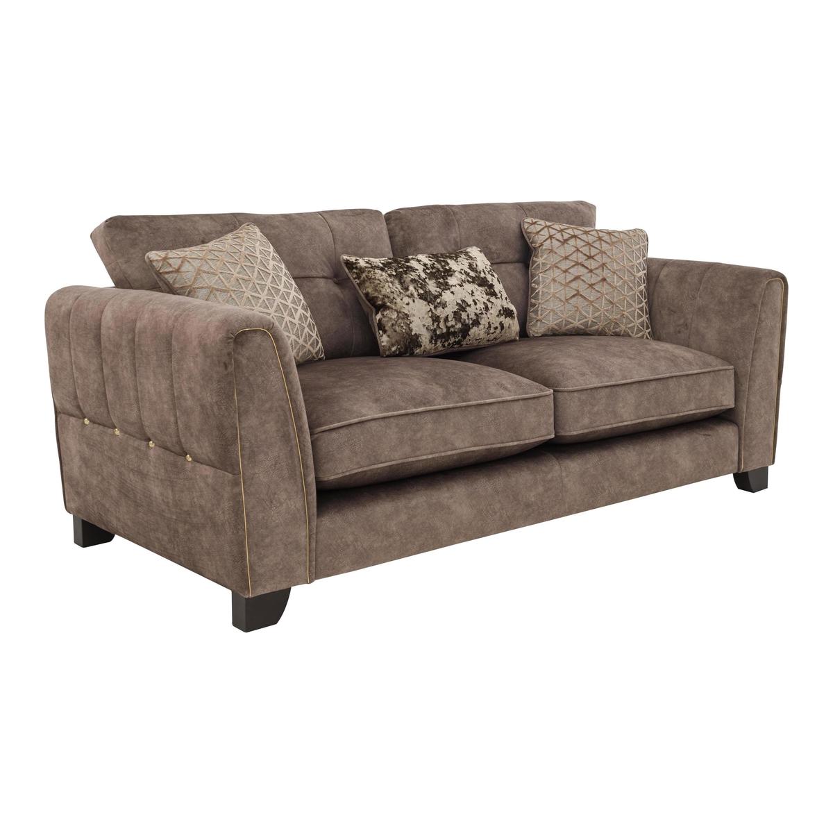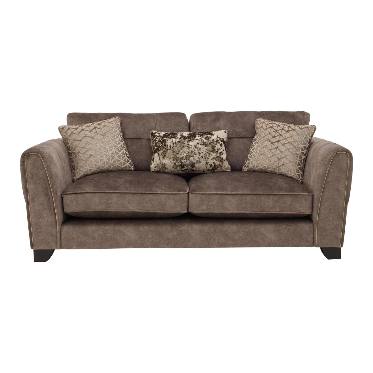 Glam style and amazing comfort – that’s this roomy three- seater classic back Ariana sofa. You’ll love the sink- in seats, the feather- filled scatters, and the soft, nubuck leather- like upholstery. Why you'll love it This contemporary 3- seater fabric classic back sofa is a fabulous choice. Sumptuous style, serious comfort, superb quality. Luxurious yet durable upholstery looks and feels like nubuck leather. Generously proportioned and ready for lounging with deep roomy seats. Exceptional craftsmanship – firm seat edges, solid hardwood frame, dark wood feet. Sink- in soft seat cushions come with our 5- year plumpness guarantee. They’re filled with Encore foam so they spring back into shape, time after time. The high, gently- curved arms feature hand- sewn fluting. Opt for brass- effect or chrome- effect piping and studs – at no extra cost. 3 reversible feather- filled scatters included – 2 square cushions and a bolster cushion. Handmade in the UK and only at Furniture Village. This 3- seater fabric classic back sofa is part of our Ariana range. What you need to know Medium comfort level. Seat suspension: sprung with firm front edges. Seat cushioning: Encore foam. Back support: webbing. Back cushioning: fibre. For ease of delivery, please ensure there is sufficient access to your home. Some fabrics can show wear on areas of more use or in direct sunlight. Plump, turn and rotate seat and back cushions regularly. Please read our upholstery care guide for more advice. Shop our Ariana range for a huge choice of sofa, chair and footstool styles, sizes and fabrics.