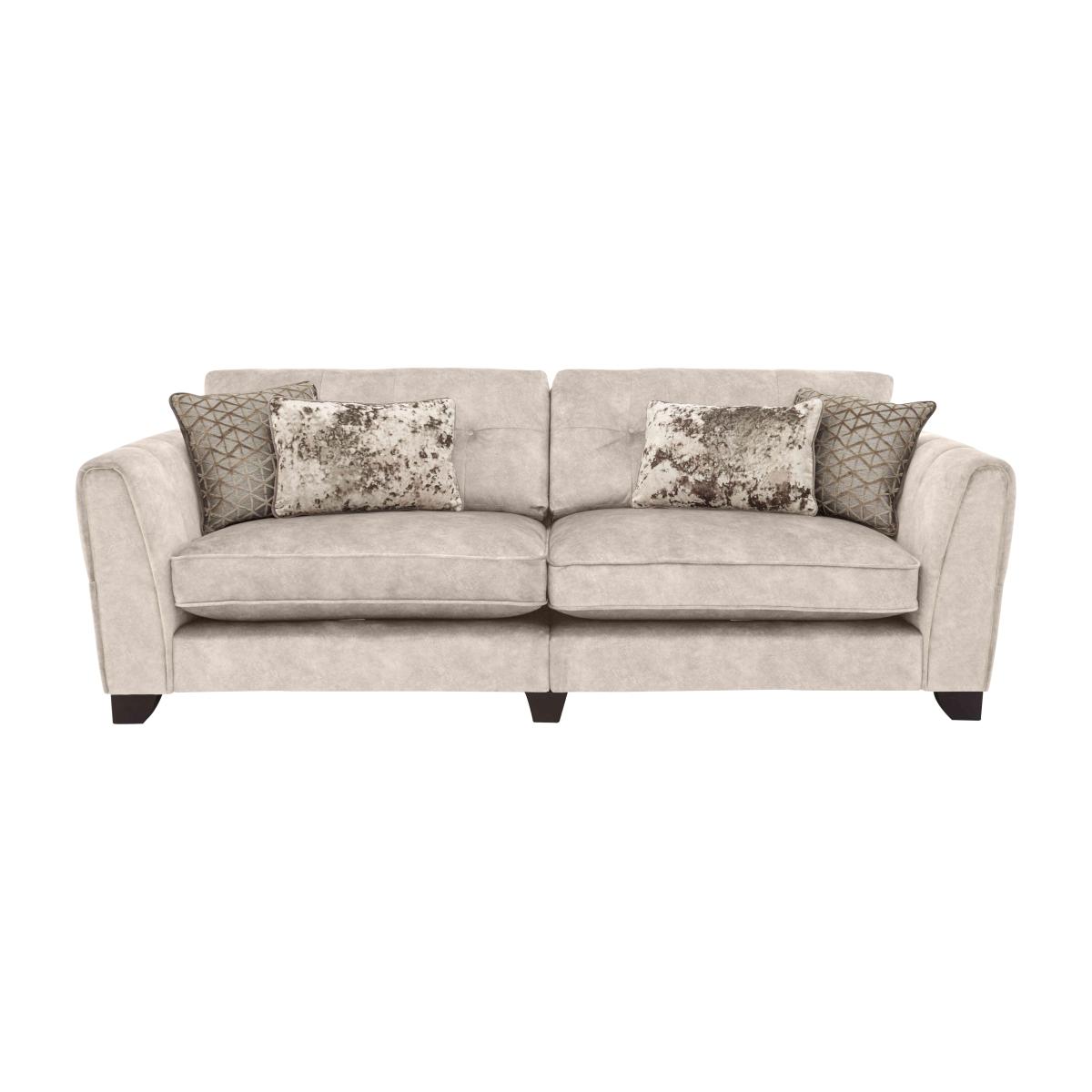 The perfect blend of modern elegance and luxury comfort, the Ariana Collection was designed to stand out. Grand in scale and contemporary in style, its generous, deep seats are upholstered in a unique fabric with the industrial look of leather but the incredible softness of luxury velvet for a truly indulgent lounging experience. Encore foam seats are sumptuously comfortable and keep their shape perfectly without re-plumping and a beautiful array of feather filled scatter cushions with a velvety sheen create a cushioned heaven. The elegant arms are decorated with delicate fluting and each piece comes with the option of brass or chrome studding and piping for a touch of opulence. Available in a variety of plush, gorgeous colours to complement the modern home. Handcrafted in the UK and exclusive to Furniture Village. Relax, sprawl, stretch out and generally revel in this four-seater sofa’s fabulous contemporary glam style. The sink-in seats are plumpness-guaranteed, and the upholstery feels like nubuck leather. Why you'll love it The perfect 4-seater fabric classic back sofa? We think so. Sumptuous style, serious comfort, superb quality. Luxurious yet durable upholstery looks and feels like nubuck leather. Generously proportioned and ready for lounging with deep roomy seats. Exceptional craftsmanship – firm seat edges, solid hardwood frame, dark wood feet. Sink-in soft seat cushions come with our 5-year plumpness guarantee. They’re filled with Encore foam so they spring back into shape, time after time. The high, gently-curved arms feature hand-sewn fluting. Opt for brass-effect or chrome-effect piping and studs – at no extra cost. 4 reversible feather-filled scatters included – 2 square cushions and 2 bolster cushions. Handmade in the UK and only at Furniture Village. This 4-seater fabric classic back sofa is part of our Ariana range. What you need to know Medium comfort level. Seat suspension: sprung with firm front edges. Seat cushioning: Encore foam. Back support: webbing. Back cushioning: fibre. For easy access, this split frame sofa will be delivered in two parts. Some fabrics can show wear on areas of more use or in direct sunlight. Plump, turn and rotate seat and back cushions regularly. Please read our upholstery care guide for more advice. Shop our Ariana range for a huge choice of sofa, chair and footstool styles, sizes and fabrics.