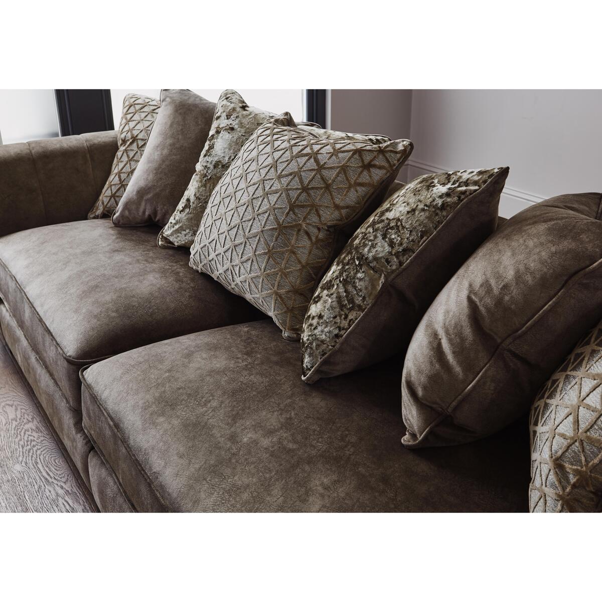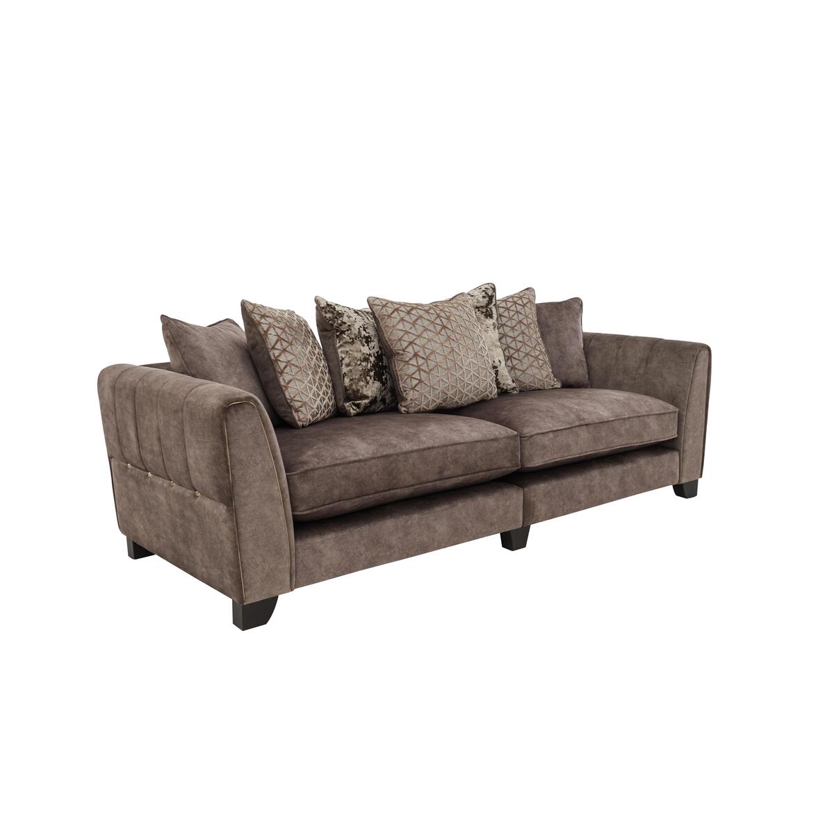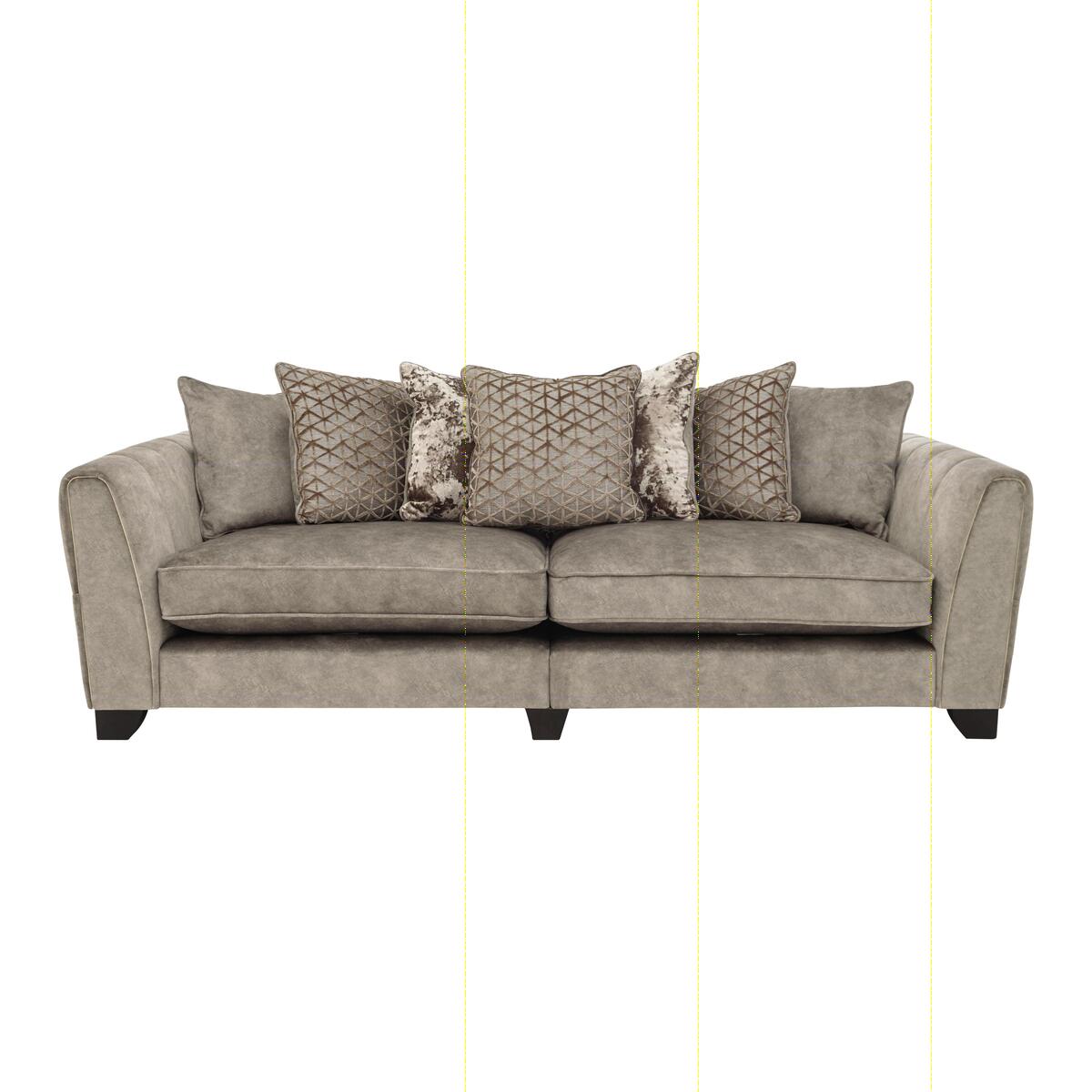 The perfect blend of modern elegance and luxury comfort, the Ariana Collection was designed to stand out. Grand in scale and contemporary in style, its generous, deep seats are upholstered in a unique fabric with the industrial look of leather but the incredible softness of luxury velvet for a truly indulgent lounging experience. Encore foam seats are sumptuously comfortable and keep their shape perfectly without re-plumping and a beautiful array of feather filled scatter cushions with a velvety sheen create a cushioned heaven. The elegant arms are decorated with delicate fluting and each piece comes with the option of brass or chrome studding and piping for a touch of opulence. Available in a variety of plush, gorgeous colours to complement the modern home. Handcrafted in the UK and exclusive to Furniture Village. Treat yourself to incredible luxury. This roomy four seater sofa is upholstered in a unique fabric that has the silky softness of velvet but the look of industrial leather. Why you’ll love it. Velvet-soft fabric sofa looks just like leather. Indulgently luxe, glamorous style. Wonderfully roomy, ideal for lounging or entertaining. Generously deep ‘spring-back’ encore foam seat cushions. Arms feature hand-sewn fluting, brass piping and studs. Feather-filled pillow back cushions in lustrous fabrics and velvets. Beautifully handcrafted in the UK, exclusively for Furniture Village. What you need to know. Medium comfort level. Encore foam seat cushions spring back into shape. Feather-filled pillow backs are easy to plump and ‘dress’. Unique fabric has the softness of velvet and the look of industrial leather. Sprung seats with firm front edge, webbed back suspension. Solid hardwood frame, with dark wood feet. For easy access this sofa can be delivered in two parts. Some fabrics can show wear on areas of more use or in direct sunlight. Plump, turn and rotate seat and back cushions regularly if possible. Please read our. Upholstery care guide. For more advice. Part of the Ariana range including sofas, snuggler chair, armchair and footstools.