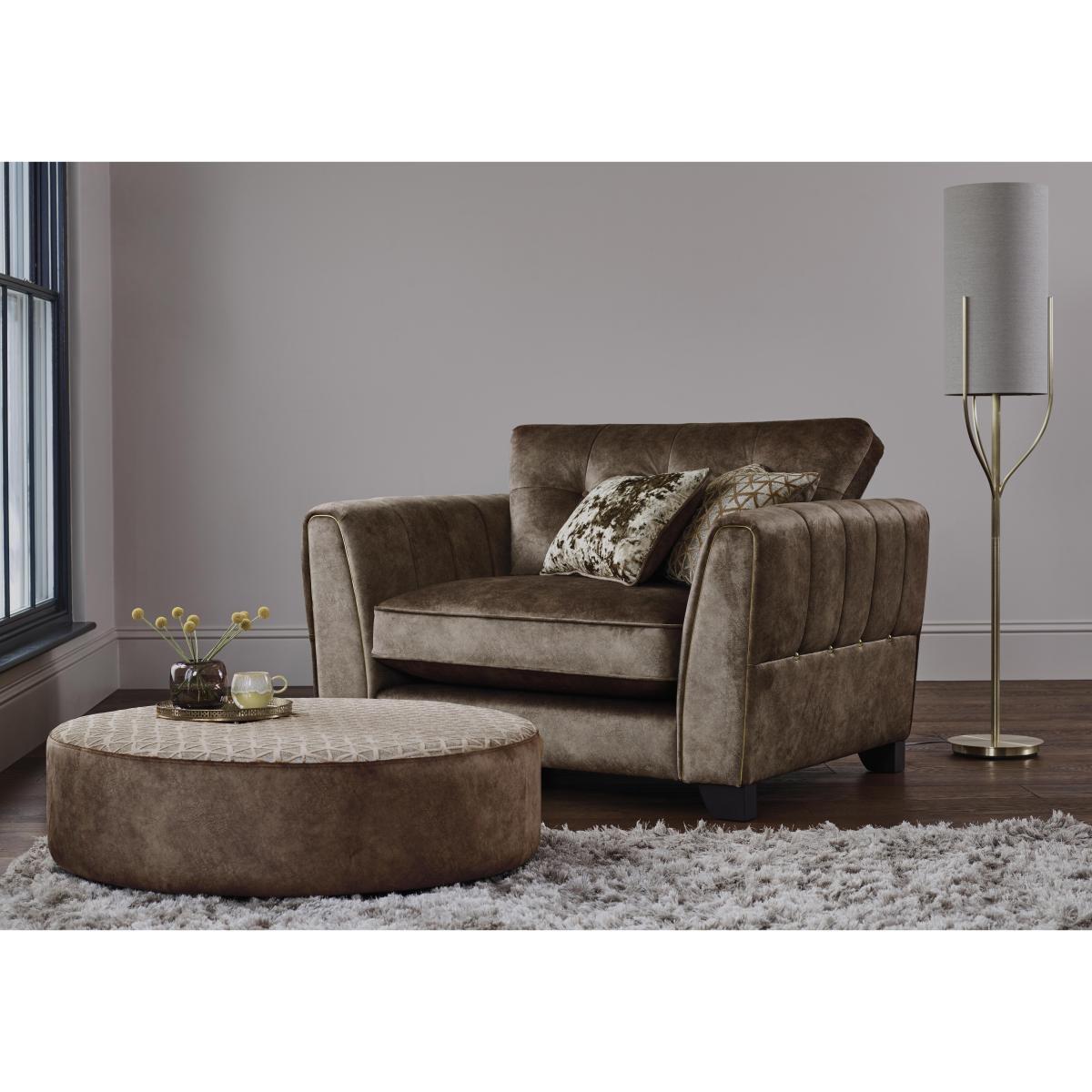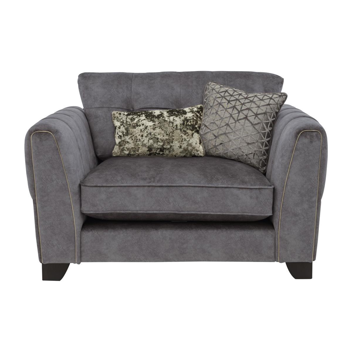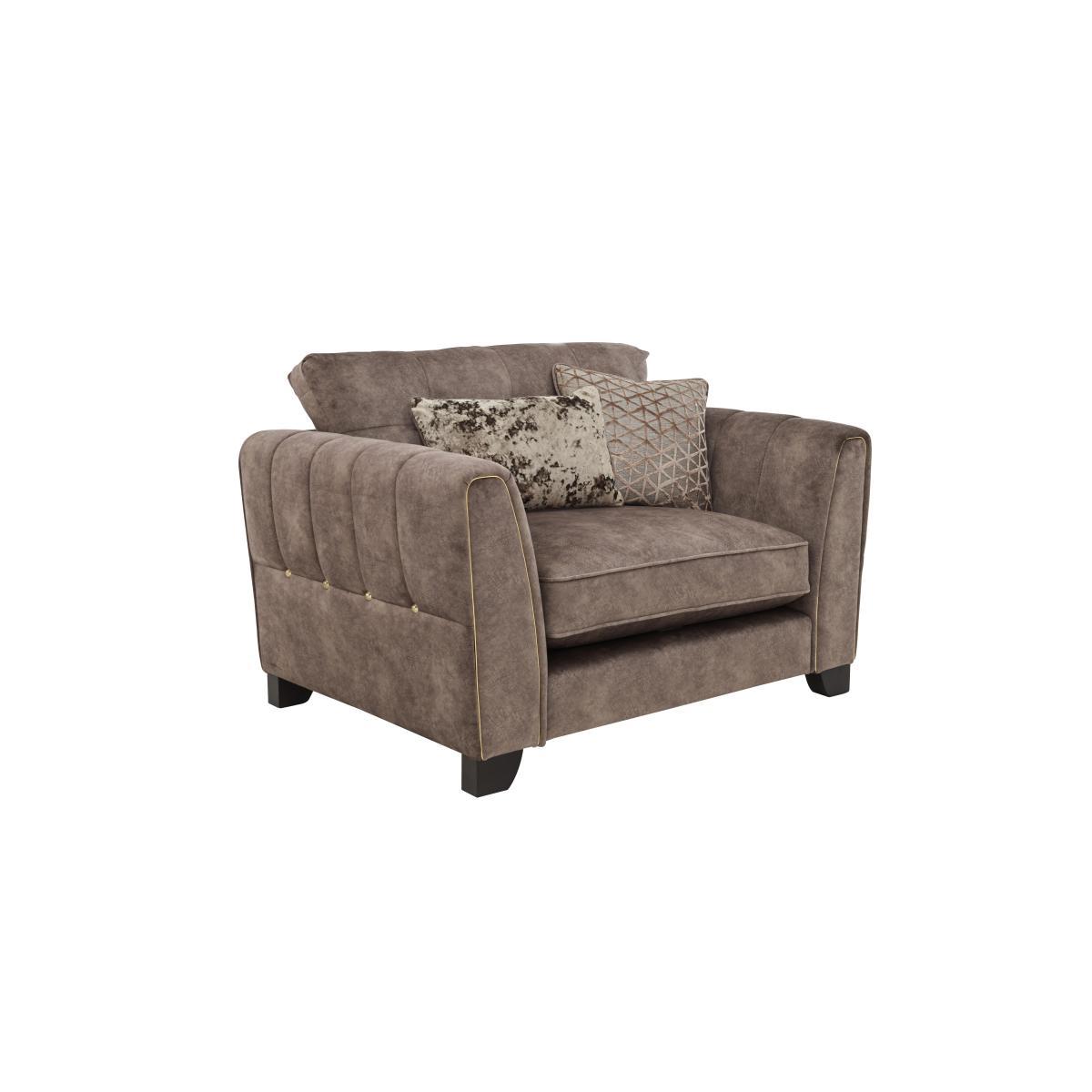 The perfect blend of modern elegance and luxury comfort, the Ariana Collection was designed to stand out. Grand in scale and contemporary in style, its generous, deep seats are upholstered in a unique fabric with the industrial look of leather but the incredible softness of luxury velvet for a truly indulgent lounging experience. Encore foam seats are sumptuously comfortable and keep their shape perfectly without re-plumping and a beautiful array of feather filled scatter cushions with a velvety sheen create a cushioned heaven. The elegant arms are decorated with delicate fluting and each piece comes with the option of brass or chrome studding and piping for a touch of opulence. Available in a variety of plush, gorgeous colours to complement the modern home. Handcrafted in the UK and exclusive to Furniture Village. Cuddle up on this snuggler chair with velvety soft upholstery, yet the glamorous look of leather. With an indulgently comfy encore foam cushion, and scatters and bolster included. Why you’ll love it. Velvet-soft fabric sofa looks just like leather. Indulgently luxe, glamorous style. Incredibly roomy, ideal for lounging or entertaining. Generously deep ‘spring-back’ encore foam seat cushions. Arms feature hand-sewn fluting, brass piping and studs. 1reversible feather-filled scatterand 1 bolster cushion included. Beautifully handcrafted in the UK, exclusively for Furniture Village. What you need to know. Medium comfort level. Encore foam seat cushions spring back into shape. Unique fabric has the softness of velvet and the look of industrial leather. Sprung seat with firm front edge, webbed back suspension. Solid hardwood frame, with dark wood feet. Some fabrics can show wear on areas of more use or in direct sunlight. Plump, turn and rotate seat and back cushions regularly if possible. Please read our. Upholstery care guide. For more advice. Part of the Ariana range including sofas, armchair and footstools.