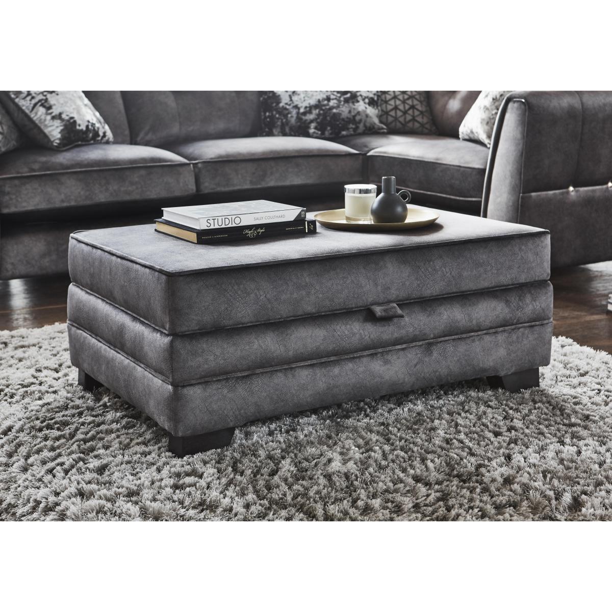 The perfect blend of modern elegance and luxury comfort, the Ariana Collection was designed to stand out. Grand in scale and contemporary in style, its generous, deep seats are upholstered in a unique fabric with the industrial look of leather but the incredible softness of luxury velvet for a truly indulgent lounging experience. Encore foam seats are sumptuously comfortable and keep their shape perfectly without re-plumping and a beautiful array of feather filled scatter cushions with a velvety sheen create a cushioned heaven. The elegant arms are decorated with delicate fluting and each piece comes with the option of brass or chrome studding and piping for a touch of opulence. Available in a variety of plush, gorgeous colours to complement the modern home. Handcrafted in the UK and exclusive to Furniture Village. This stylish fabric storage footstool looks like it’s been upholstered in soft nubuck leather. Its spacious storage compartment is ideal for speedy pre-guest tidying up. Why you'll love it This fabric storage footstool is perfect for stowing living room clutter. Sumptuous style, serious comfort, superb quality. Luxurious yet durable upholstery looks and feels like nubuck leather. With a comfortably cushioned top, it makes a great extra seat or coffee table. Exceptional craftsmanship with a solid hardwood frame and dark wood feet. Handmade in the UK and only at Furniture Village. This fabric storage footstool is part of our Ariana range. What you need to know Medium comfort level. Top cushioning: fibre. Some fabrics can show wear on areas of more use or in direct sunlight. Please read our upholstery care guide for more advice. Shop our Ariana range for a huge choice of sofa, chair and footstool styles, sizes and fabrics.