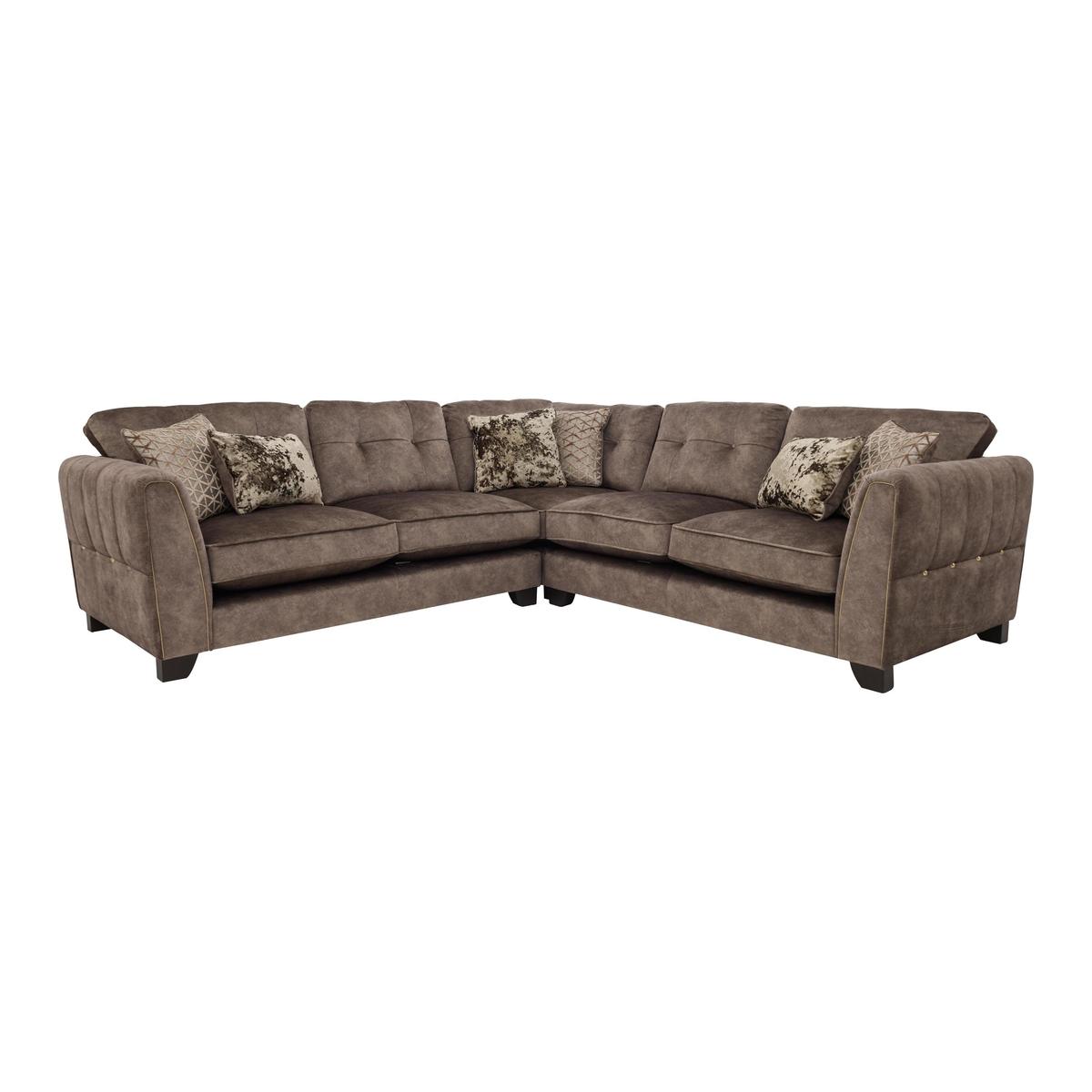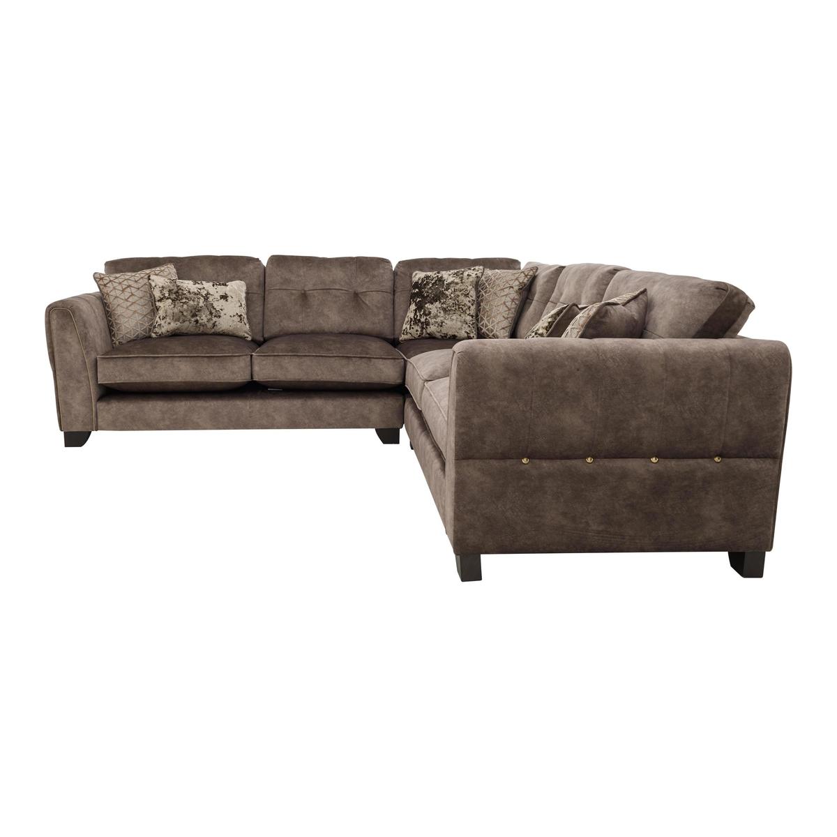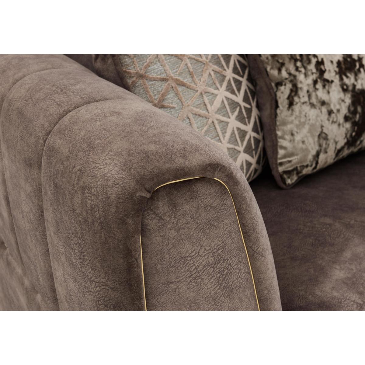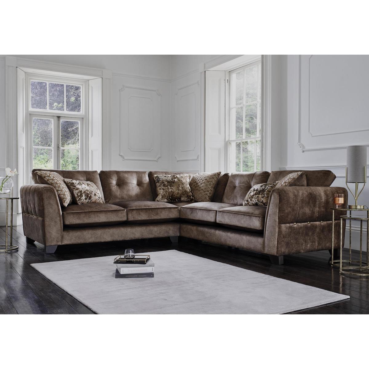 The perfect blend of modern elegance and luxury comfort, the Ariana Collection was designed to stand out. Grand in scale and contemporary in style, its generous, deep seats are upholstered in a unique fabric with the industrial look of leather but the incredible softness of luxury velvet for a truly indulgent lounging experience. Encore foam seats are sumptuously comfortable and keep their shape perfectly without re-plumping and a beautiful array of feather filled scatter cushions with a velvety sheen create a cushioned heaven. The elegant arms are decorated with delicate fluting and each piece comes with the option of brass or chrome studding and piping for a touch of opulence. Available in a variety of plush, gorgeous colours to complement the modern home. Handcrafted in the UK and exclusive to Furniture Village. Roomy, glamorous corner sofa that feels like velvet but looks like leather. With indulgently comfy encore foam cushions and luxury fibre back cushions. Why you’ll love it. Velvet-soft fabric sofa looks just like leather. Indulgently luxe, glamorous style. Incredibly roomy, ideal for lounging or entertaining. Generously deep ‘spring-back’ encore foam seat cushions. Arms feature hand-sewn fluting, brass piping and studs. 4 reversible feather-filled scatters and 2 bolster cushions are included. Beautifully handcrafted in the UK, exclusively for Furniture Village. What you need to know. Medium comfort level. Encore foam seat cushions spring back into shape. Unique fabric has the softness of velvet and the look of industrial leather. Sprung seats with firm front edge, webbed back suspension. Solid hardwood frame, with dark wood feet. For easy access this sofa can be delivered in two parts. Some fabrics can show wear on areas of more use or in direct sunlight. Plump, turn and rotate seat and back cushions regularly if possible. Please read our. Upholstery care guide. For more advice. Part of the Ariana range including sofas, snuggler chair, armchair and footstools.