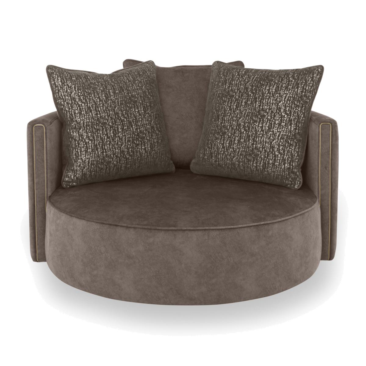 The perfect blend of modern elegance and luxury comfort, the Ariana Collection was designed to stand out. Grand in scale and contemporary in style, its generous, deep seats are upholstered in a unique fabric with the industrial look of leather but the incredible softness of luxury velvet for a truly indulgent lounging experience. Encore foam seats are sumptuously comfortable and keep their shape perfectly without re-plumping and a beautiful array of feather filled scatter cushions with a velvety sheen create a cushioned heaven. The elegant arms are decorated with delicate fluting and each piece comes with the option of brass or chrome studding and piping for a touch of opulence. Available in a variety of plush, gorgeous colours to complement the modern home. Handcrafted in the UK and exclusive to Furniture Village. This large swivel chair is sure to be everyone’s favourite thanks to its soft and squishy feather-filled back cushions, roomy proportions and swivel base. Only at Furniture Village. Why you'll love it Sumptuous style, serious comfort, superb quality. With pillow back cushions and swivel base, this large 2-person armchair is just so cool. Pillow back is composed of 3 reversible feather-filled scatter cushions. Luxurious yet durable upholstery looks and feels like nubuck leather. Generously proportioned and ready for lounging with a deep roomy seat. Exceptional craftsmanship – firm seat edge and solid hardwood frame. Sink-in soft seat cushion comes with our 5-year plumpness guarantee. It’s filled with Encore foam so it springs back into shape, time after time. Opt for brass-effect or chrome-effect accent trim and studding at no extra cost. Handmade in the UK and only at Furniture Village. This large fabric swivel chair is part of our Ariana range. What you need to know Medium comfort level. Seat suspension: sprung with firm front edge. Seat cushioning: Encore foam. Back support: webbing. Back cushioning: feather-filled cushions. For ease of delivery, please ensure there is sufficient access to your home. Some fabrics can show wear on areas of more use or in direct sunlight. Please read our upholstery care guide for more advice. Shop our Ariana range for a huge choice of sofa, chair and footstool styles, sizes and fabrics.